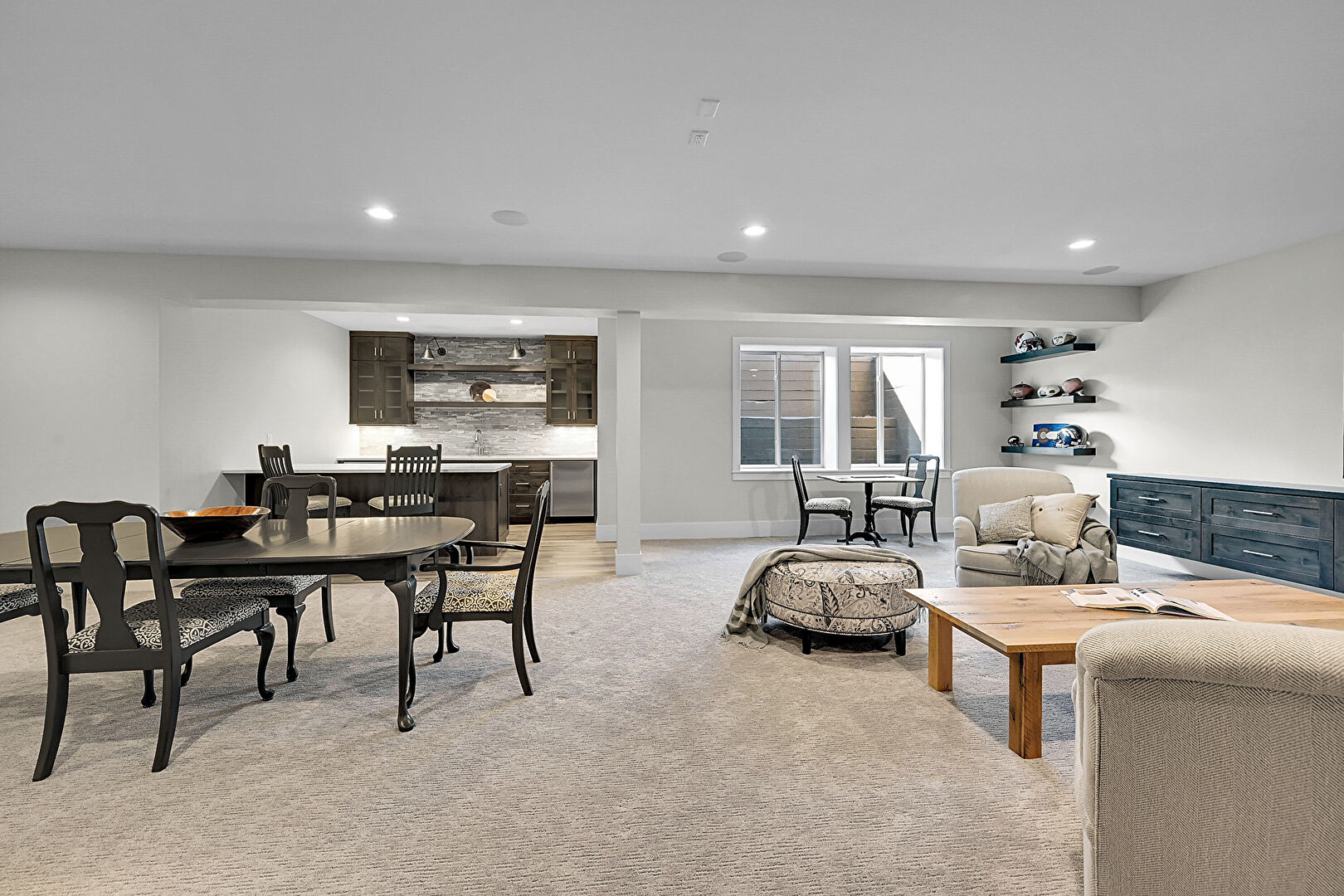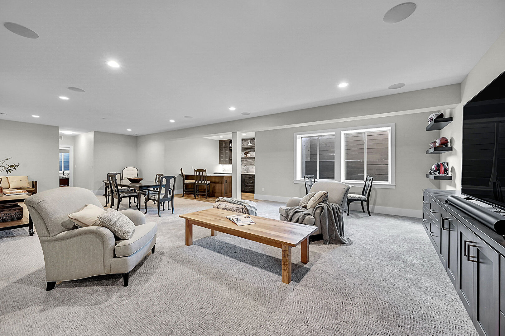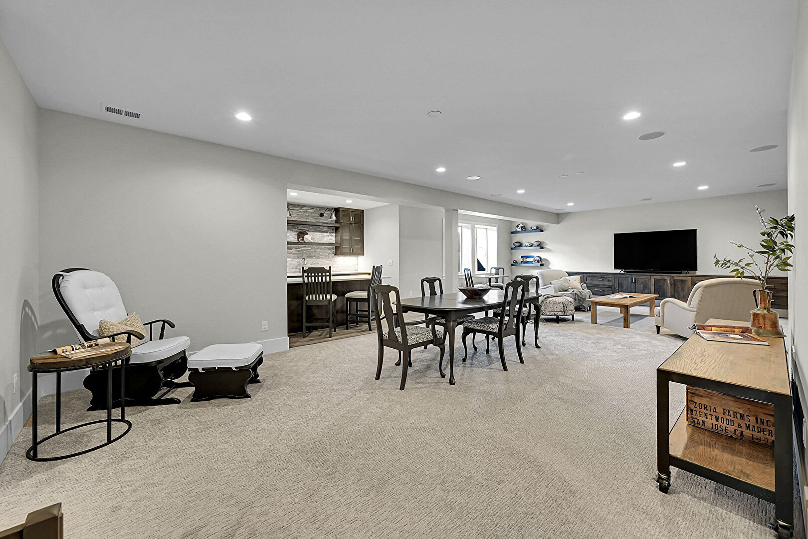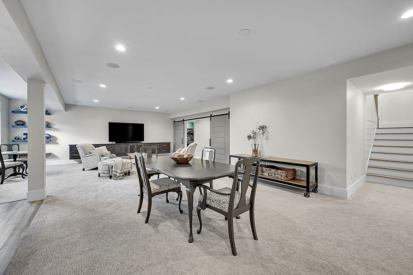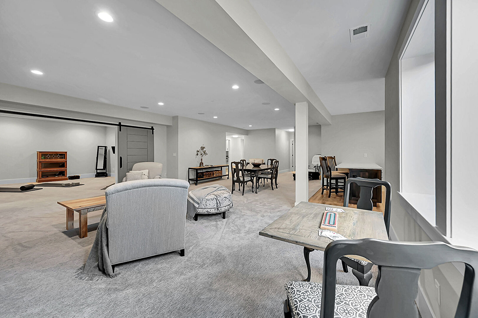 Barn Door, Baseboards Wall, Basement, Carpet, Drywall, Indoor Bar, Natural Light, Recessed Lighting, Stairs, Vent, Carpet, Drywall, Natural Light, Recessed Lighting