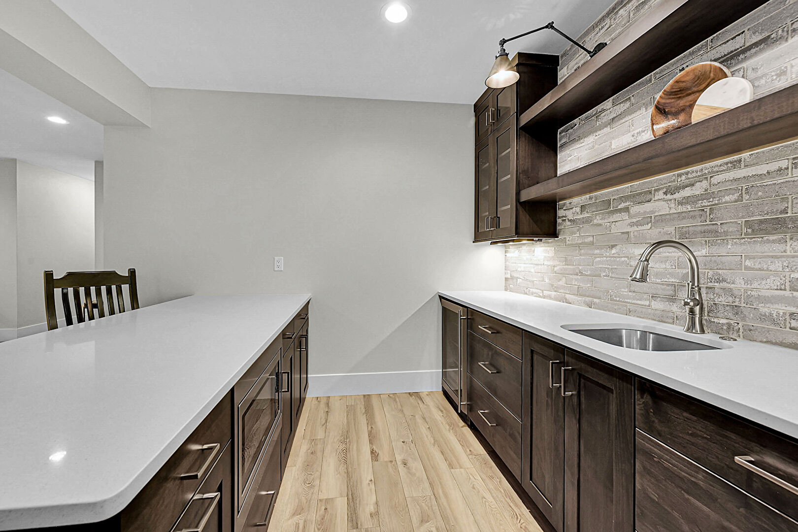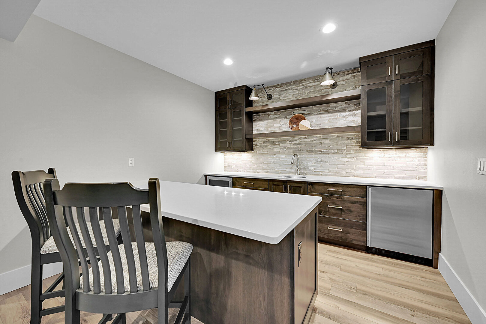 Baseboards Wall, Dark Brown Cabinets, Drywall, Glass Insert Cabinets, Indoor Bar, Open Shelves, Recessed Lighting, Stone Countertops, Wine Cooler, Wood Finish Floor, Flat Panel Cabinets