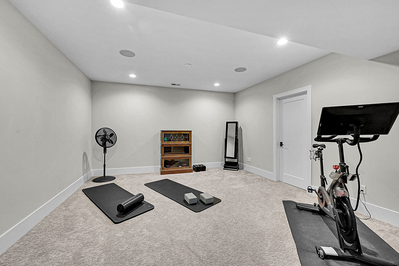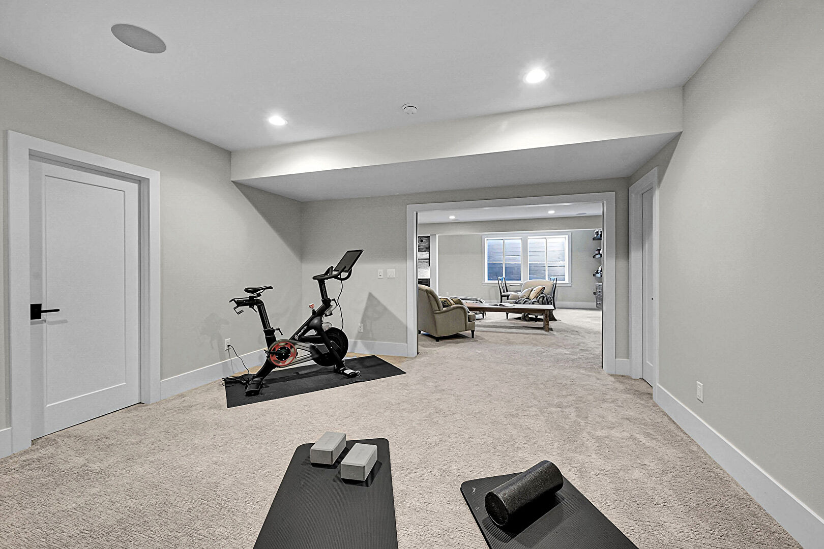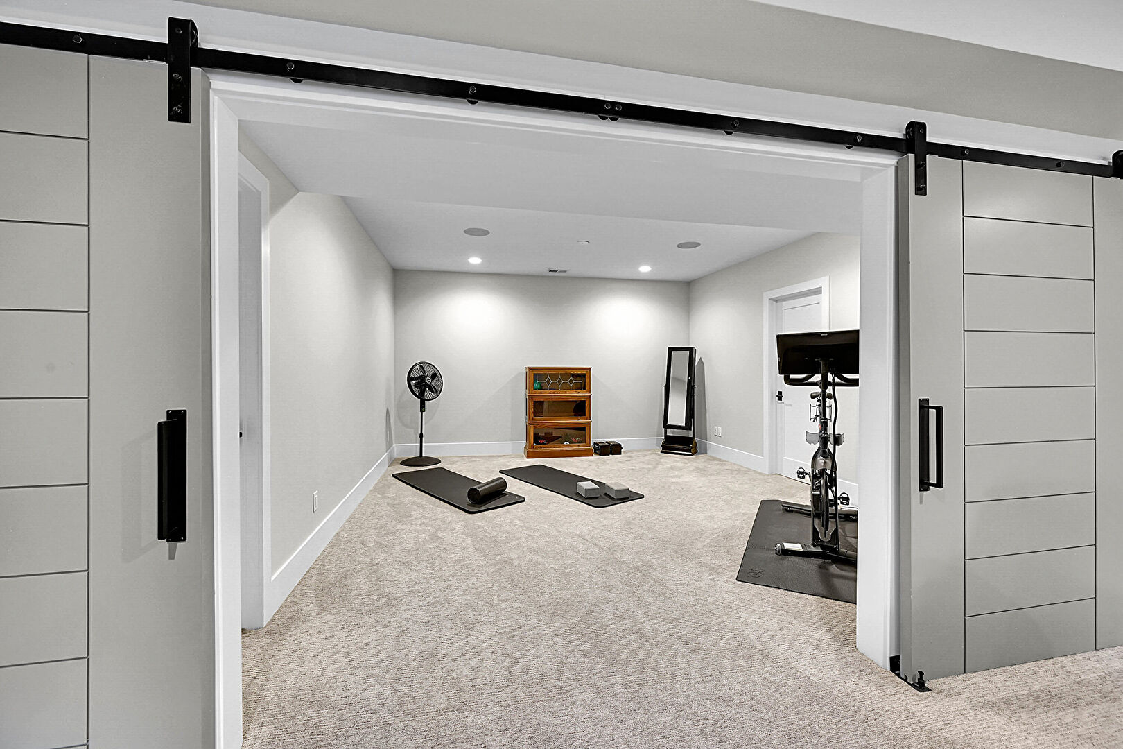 Barn Door, Baseboards Wall, Carpet, Drywall, Natural Light, Recessed Lighting, Baseboards Wall, Carpet