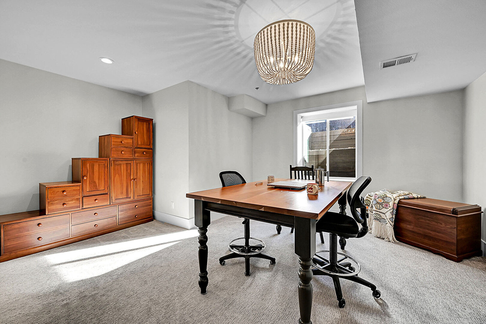 Baseboards Wall, Carpet, Drywall, Ensuite Bathroom, Natural Light, Notable Chandelier, Office Area, Recessed Lighting, Vent, Wood Finish Floor, Carpet, Drywall, Notable Chandelier