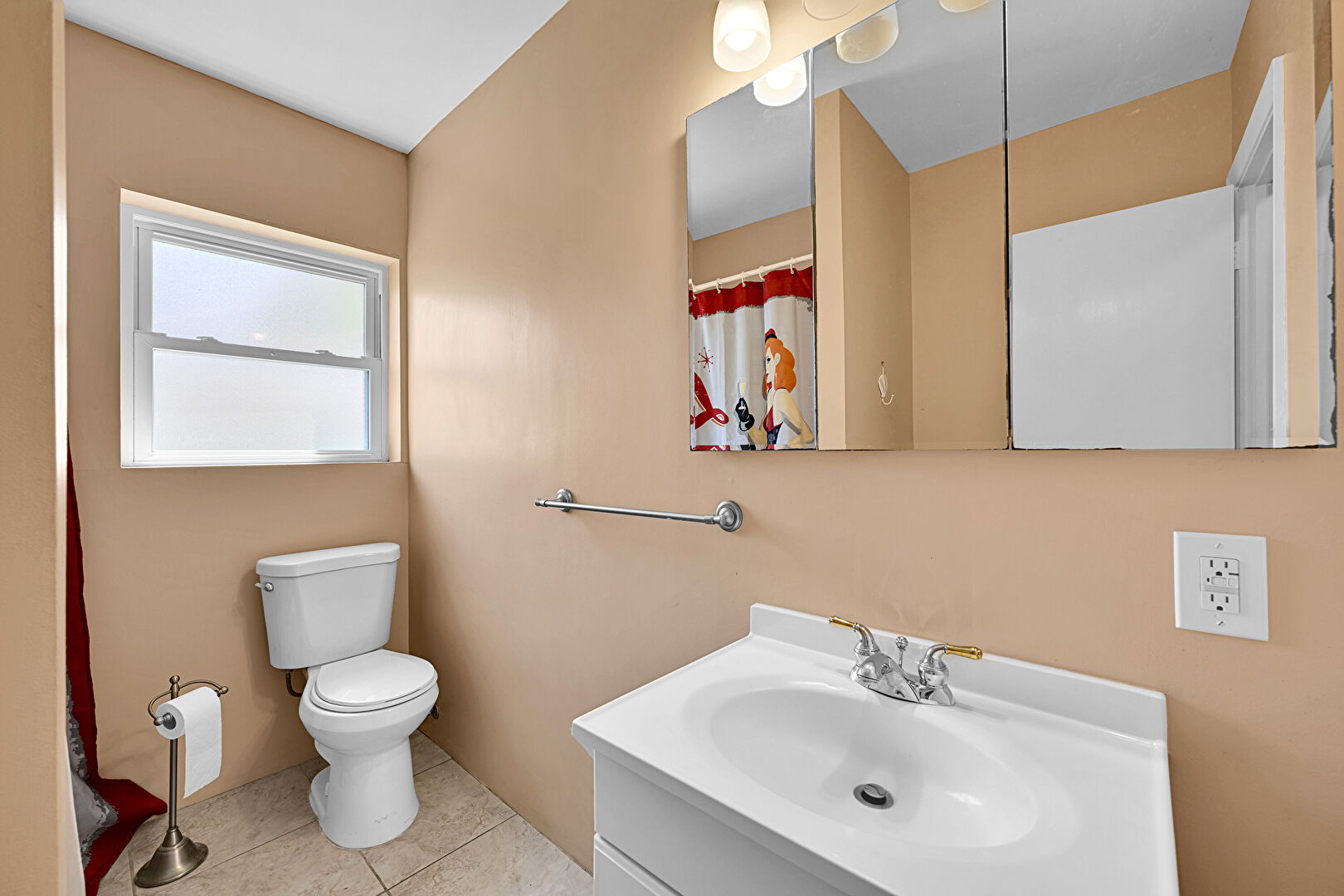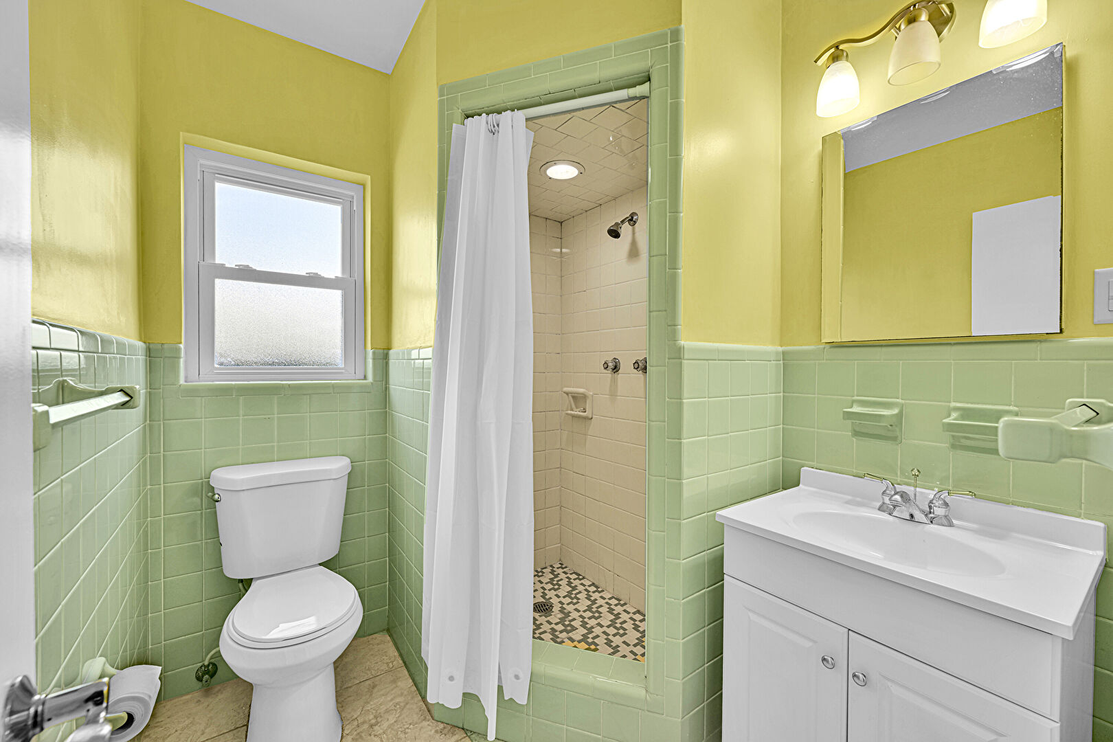 Drywall, Full Bathroom, Natural Light, Tile Floor, Tile Wall, Vanity, Wainscot Wall, Drywall, Vanity