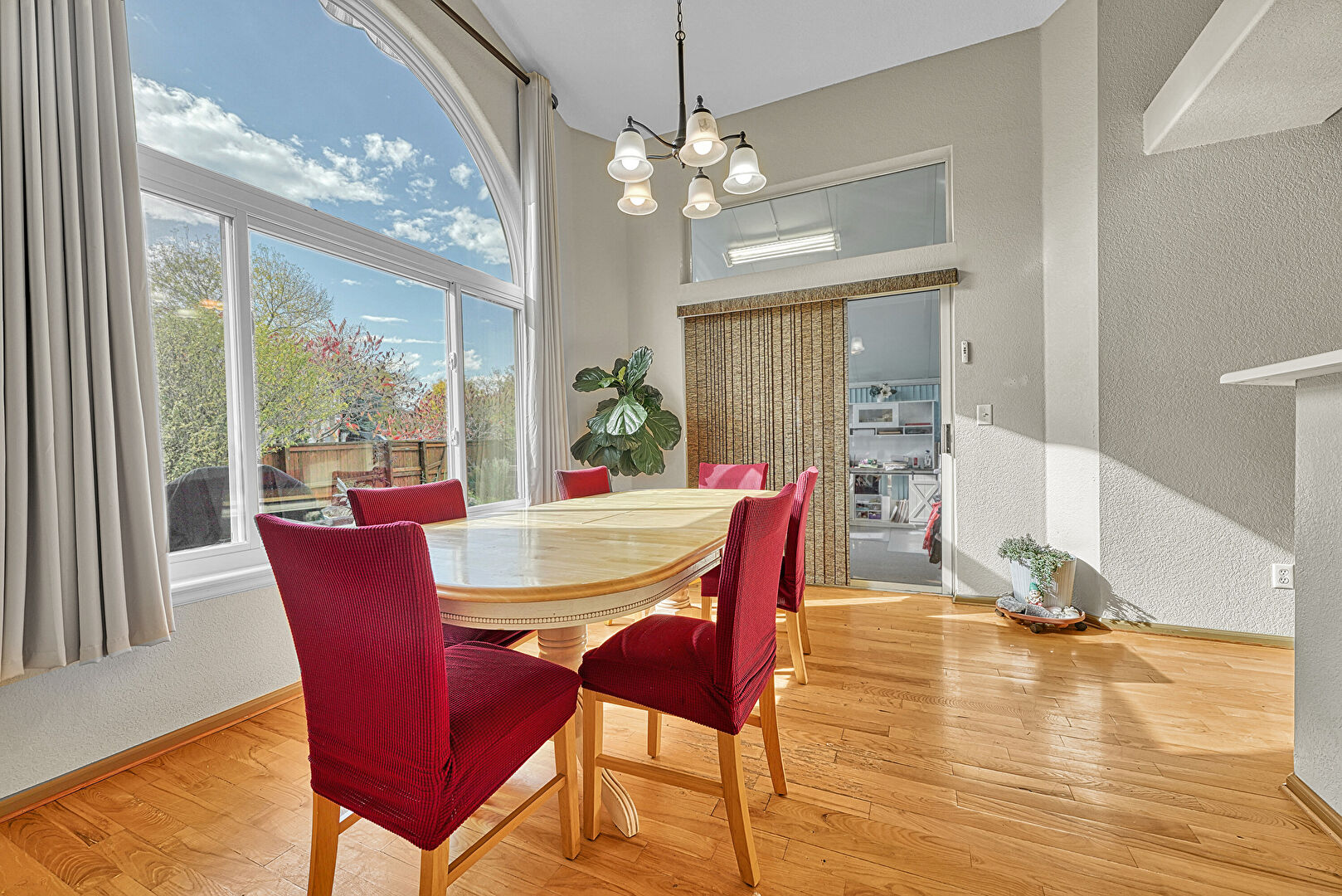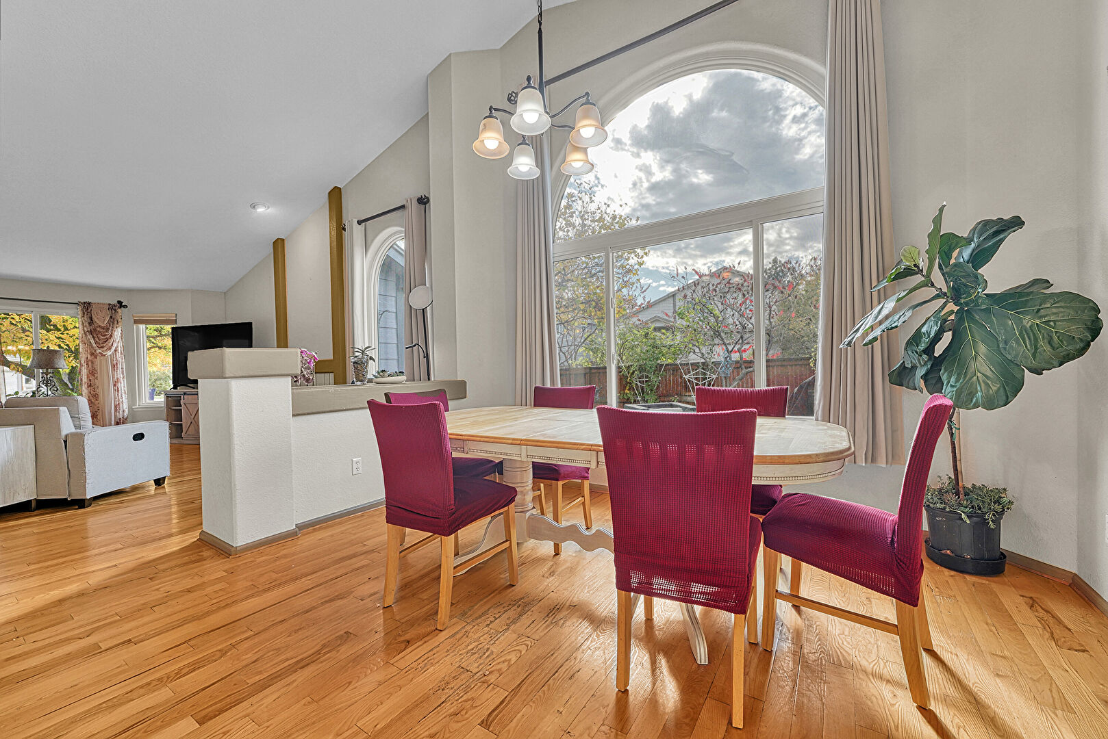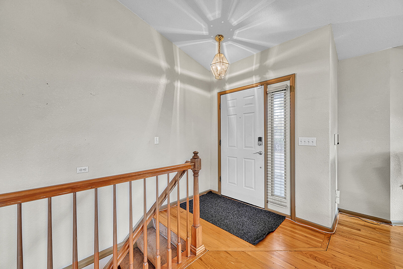Baseboards Wall, Drywall, High Ceiling, Natural Light, Notable Chandelier, Textured Wall, Vaulted Ceiling, Wood Finish Floor, Baseboards Wall, High Ceiling