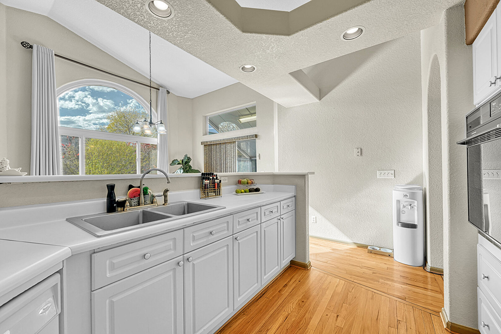 Arched Walkways, Baseboards Wall, Ceiling Fan, Drywall, G Shaped Kitchen, Kitchen Peninsula, Natural Light, Notable Chandelier, Open Shelves, Opens To Living Area, Pendant Lighting, Raised Cabinets, Recessed Lighting, Textured Ceiling, Textured Wall, Tray Ceiling, Vaulted Ceiling, Vent, Wood Finish Floor, Baseboards Wall, Kitchen Peninsula, Recessed Lighting, Tray Ceiling