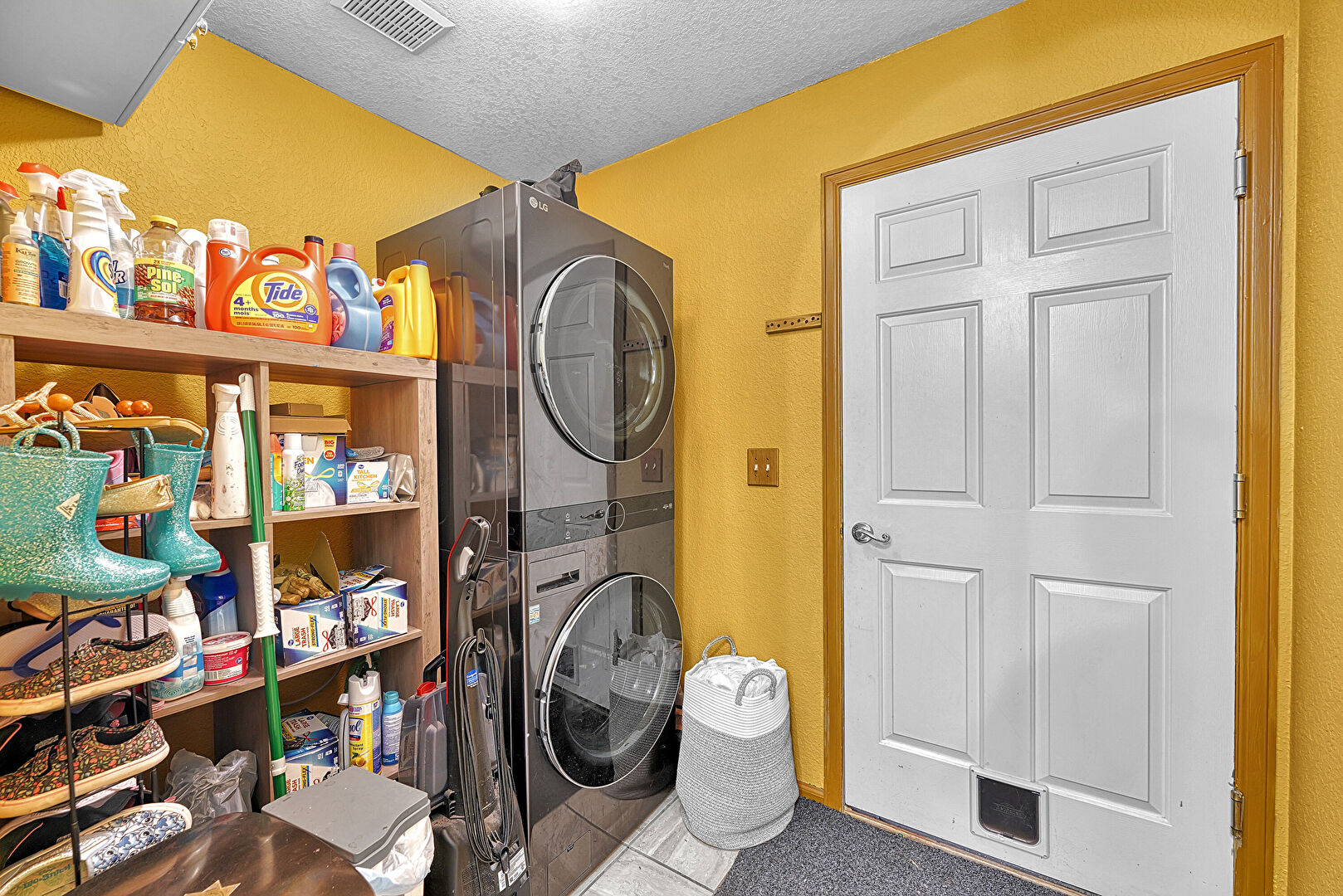 Baseboards Wall, Carpet, Laundry, Textured Ceiling, Vent, Textured Wall