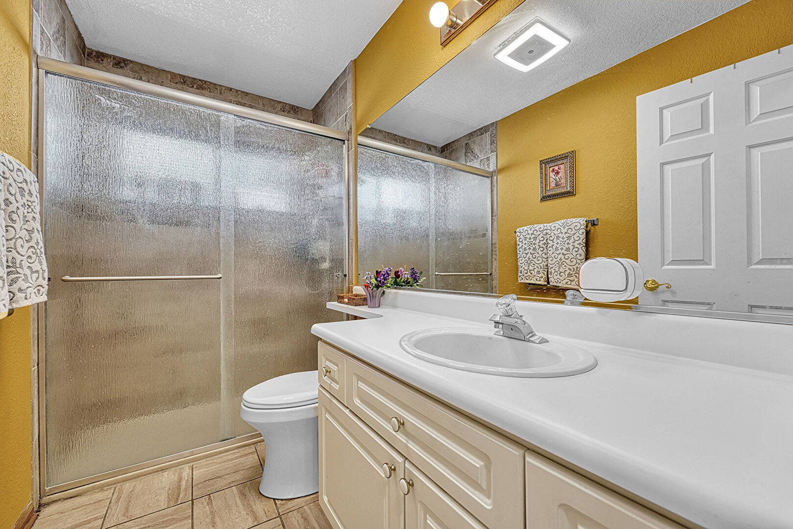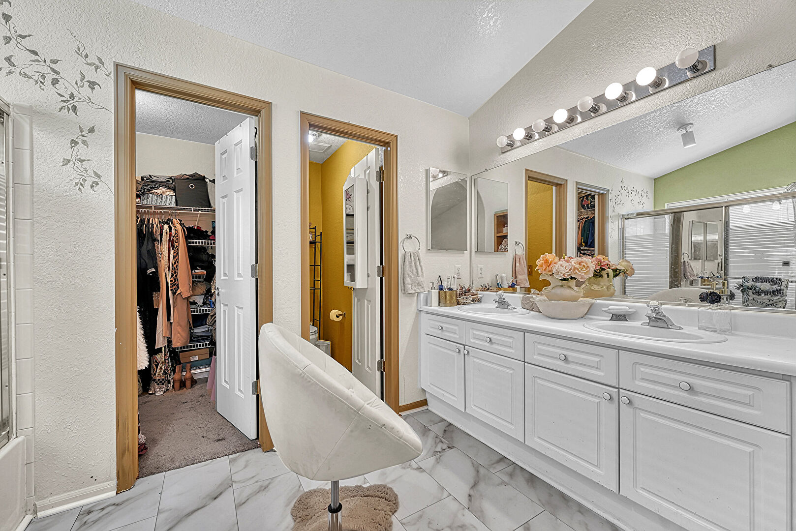 Baseboards Wall, Ceiling Fan, Combined Bath Shower, Double Vanity, Ensuite Bathroom, Full Bathroom, Marble Finish Floor, Natural Light, Textured Ceiling, Vaulted Ceiling, Water Closet, Wood Finish Floor, Textured Wall, Walk In Closet
