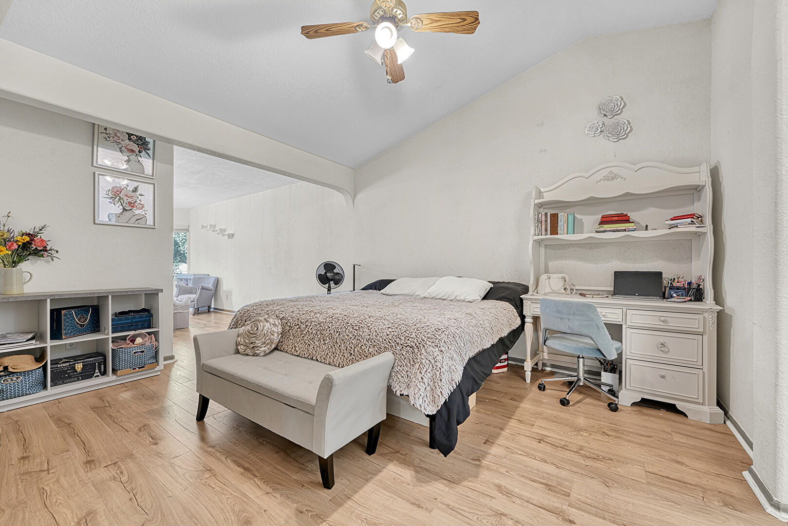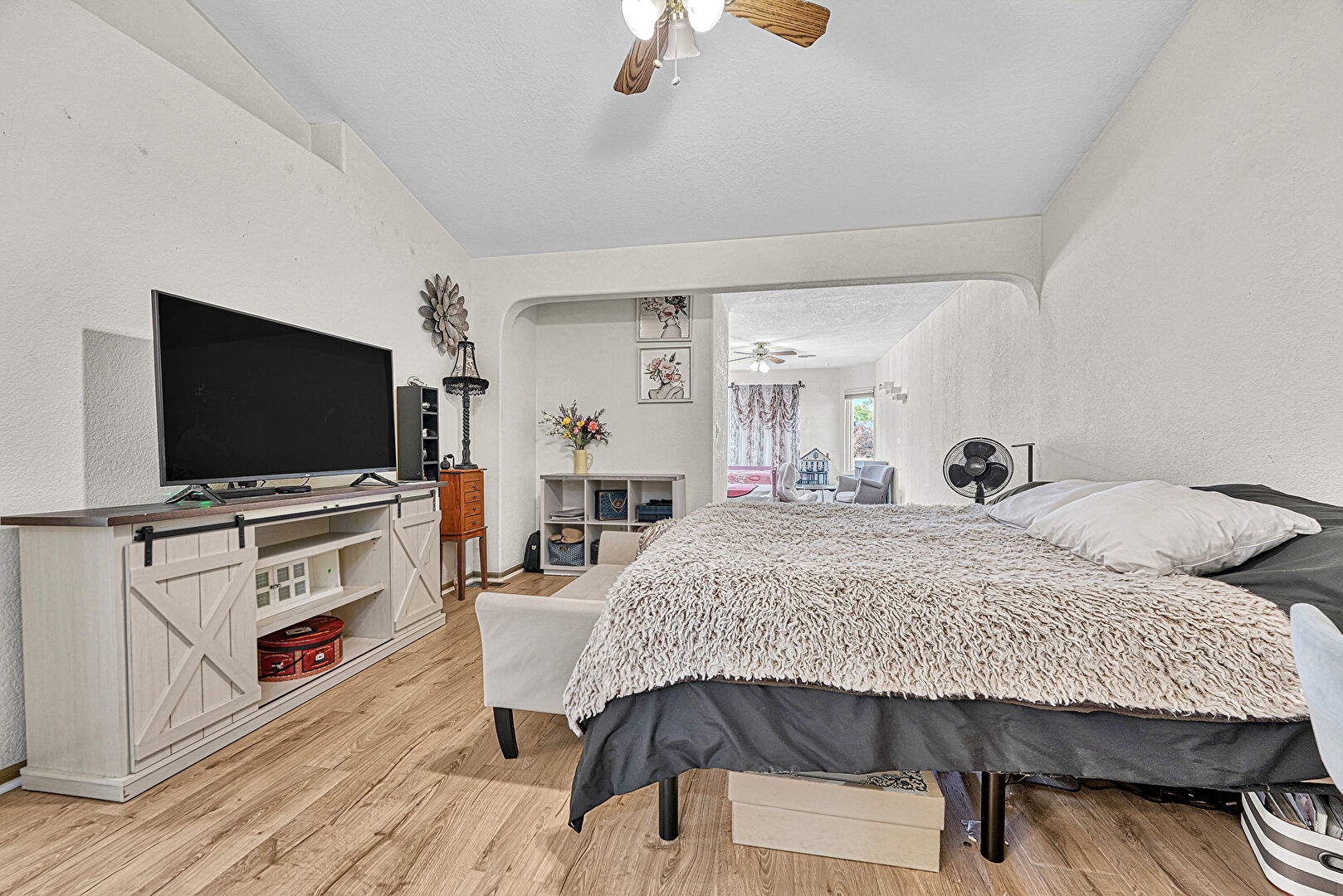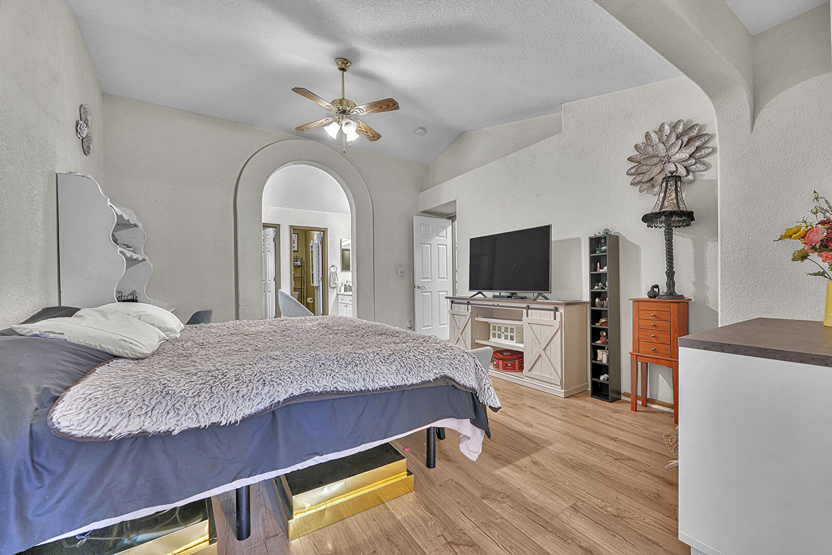 Arched Walkways, Ceiling Fan, Drywall, Natural Light, Office Area, Textured Ceiling, Textured Wall, Vaulted Ceiling, Wood Finish Floor, Baseboards Wall, Natural Light, Wood Finish Floor