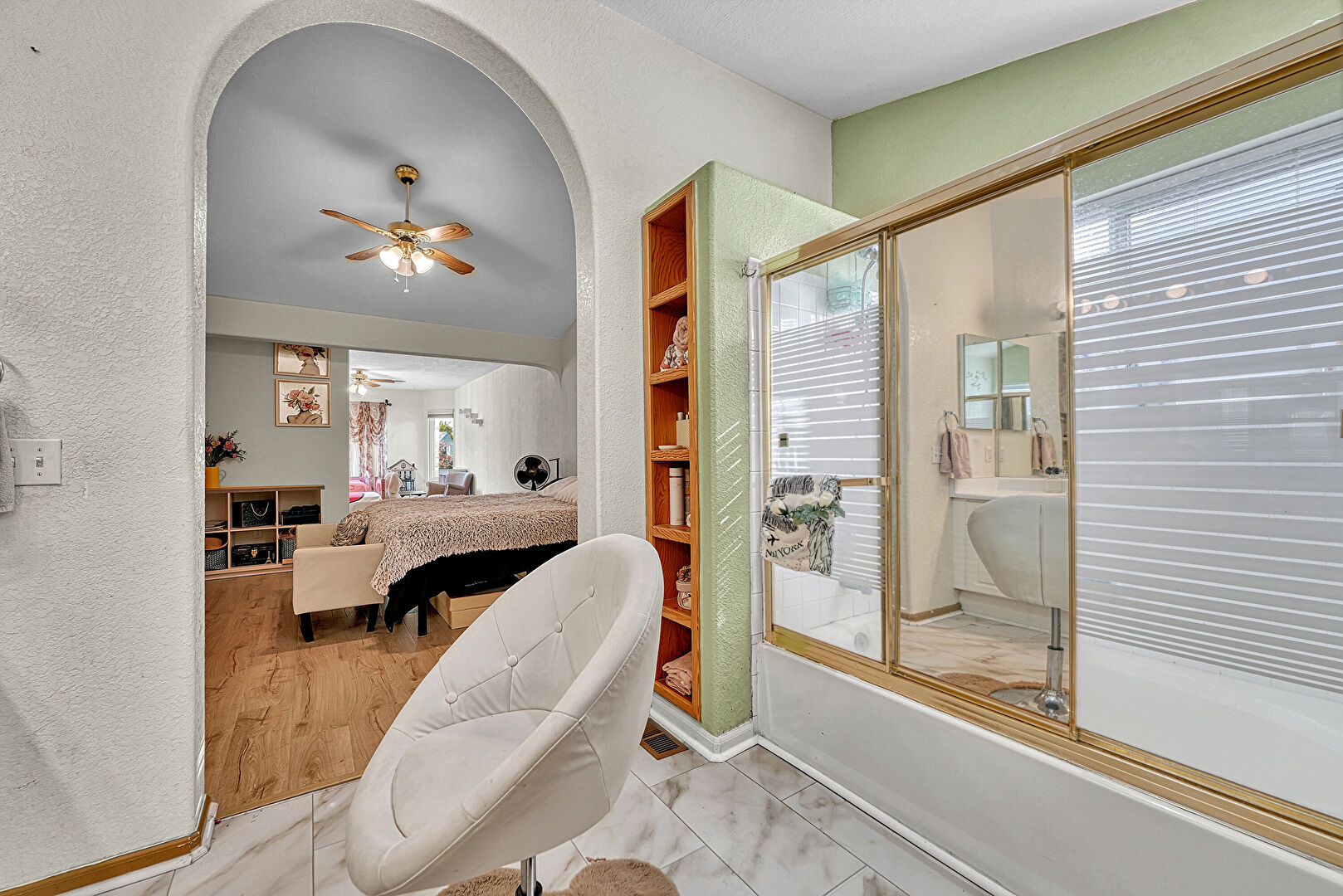 Arched Walkways, Ceiling Fan, Closet, Natural Light, Textured Ceiling, Textured Wall, Vent, Wood Finish Floor, Baseboards Wall