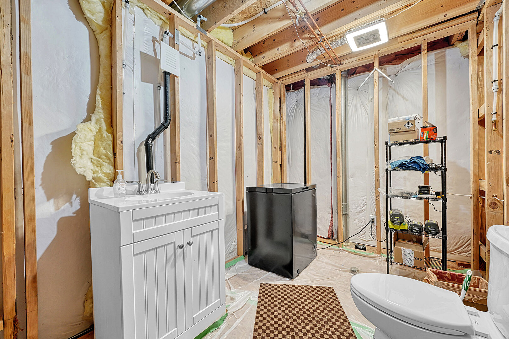Drywall, Full Bathroom, Half Bathroom, Textured Ceiling, Vanity, Vent, Basement, Tile Floor