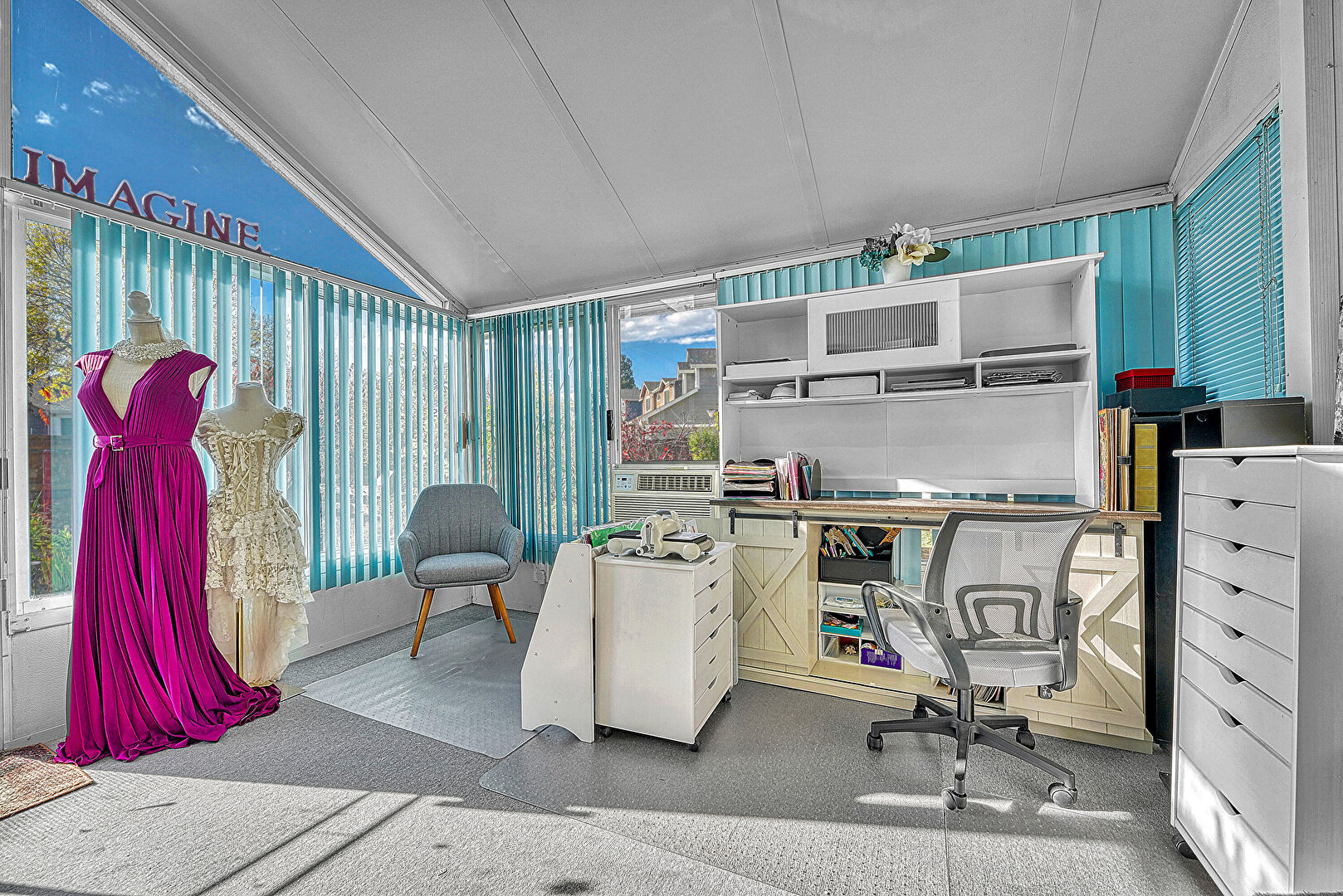 Baseboards Wall, Carpet, Drywall, Natural Light, Office Area, Textured Ceiling, Textured Wall, Vaulted Ceiling, Vent, Wood Finish Floor, Baseboards Wall, Carpet, Natural Light