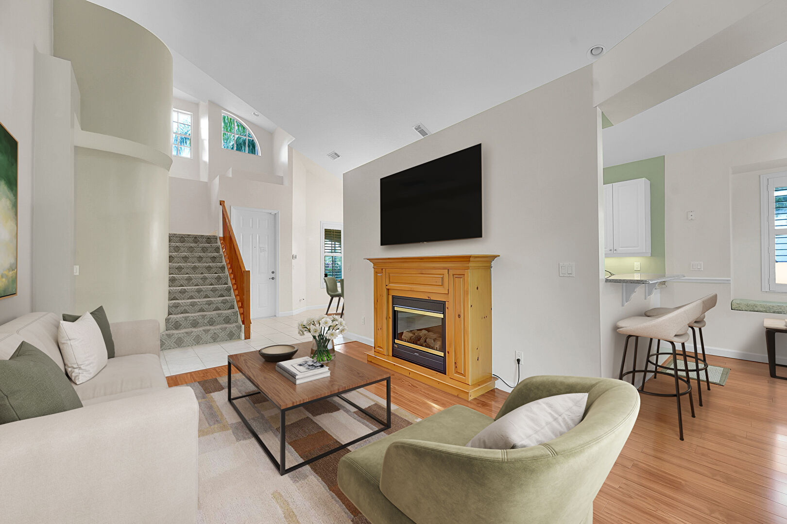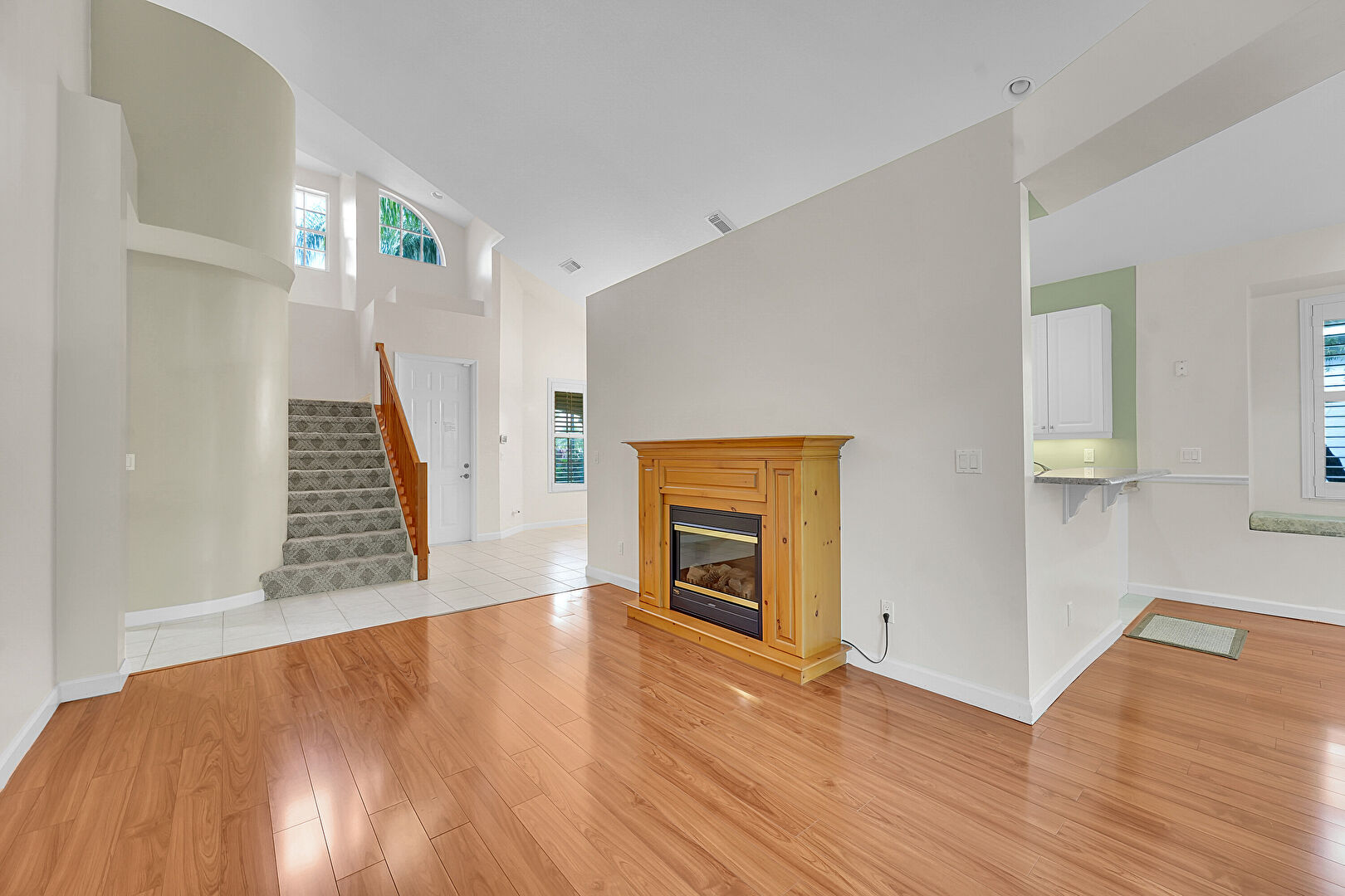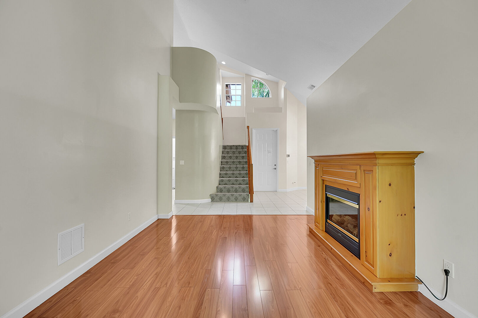 Baseboards Wall, Drywall, Fireplace, High Ceiling, Natural Light, Recessed Lighting, Stairs, Tile Floor, Vaulted Ceiling, Vent, Wood Finish Floor, Drywall, High Ceiling, Natural Light, Vaulted Ceiling