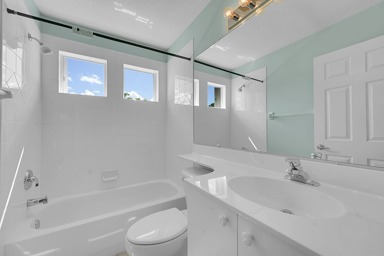 Combined Bath Shower, Full Bathroom, Natural Light, Textured Ceiling, Vanity, Drywall