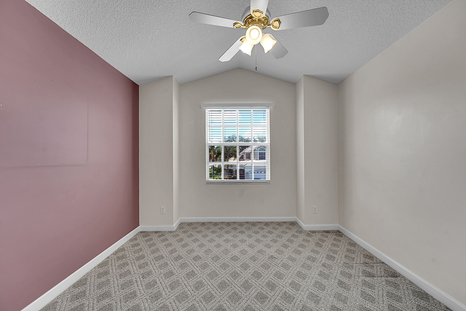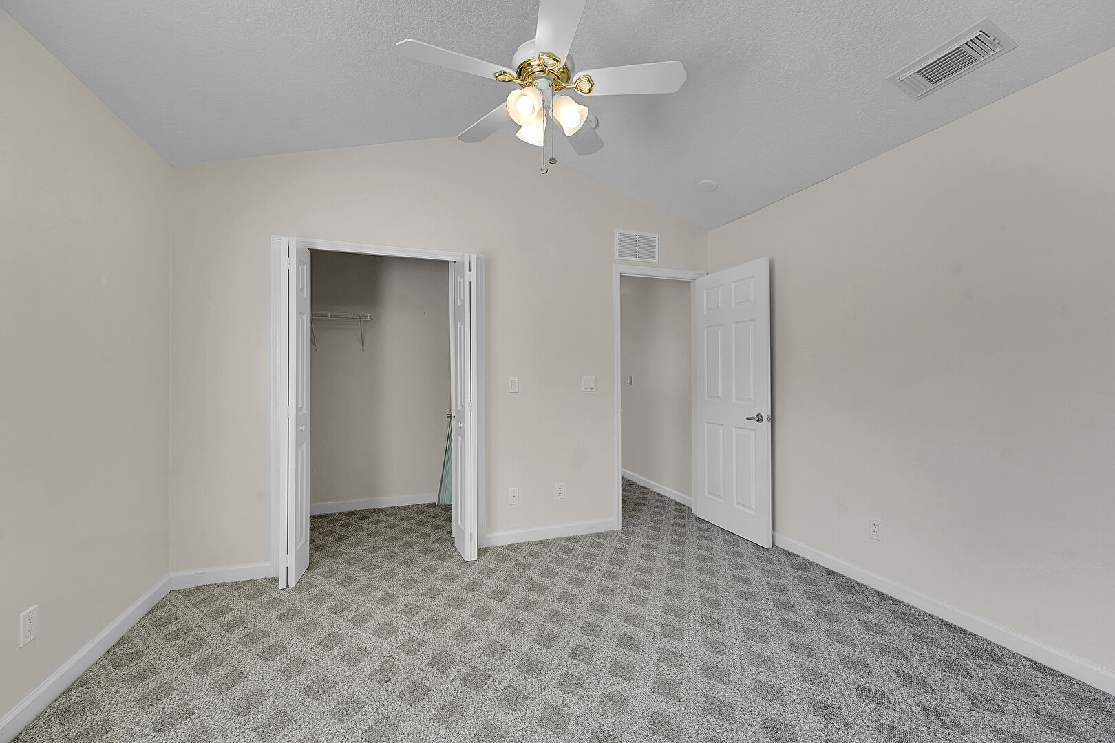 Baseboards Wall, Carpet, Cathedral Ceiling, Ceiling Fan, Closet, Drywall, Natural Light, Textured Ceiling, Vaulted Ceiling, Vent, Ceiling Fan, Natural Light, Textured Ceiling, Vent