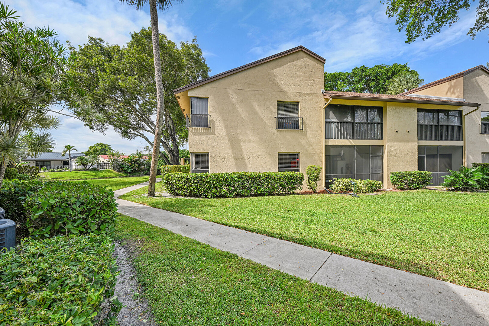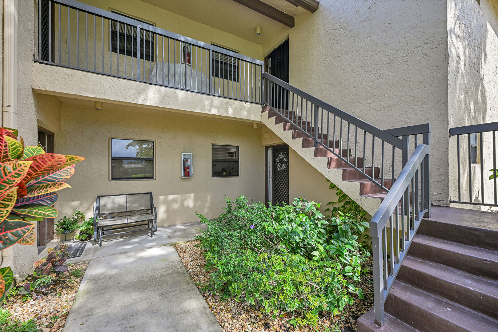 Central Ac, Downspout, Fire Extinguisher, Lawn, Stucco Siding, Balcony, Lawn, Stairs