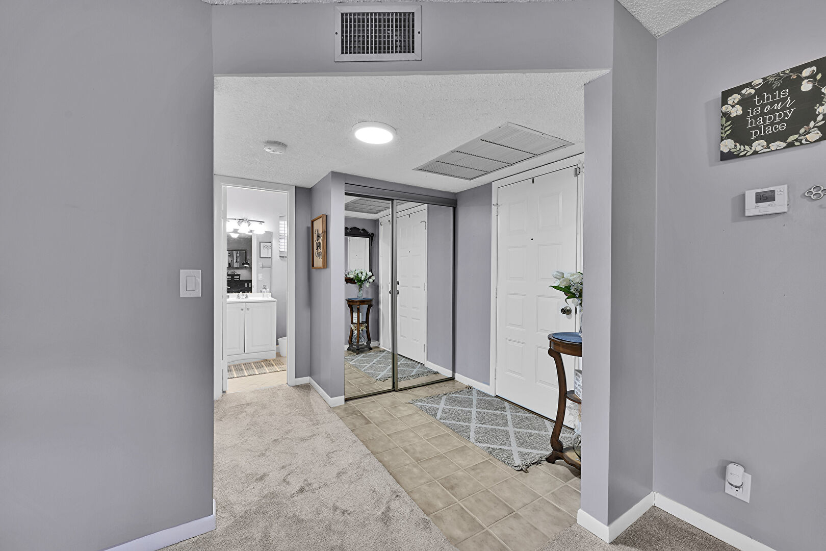 Baseboards Wall, Carpet, Drywall, Textured Ceiling, Tile Floor, Vent, Carpet, Textured Ceiling