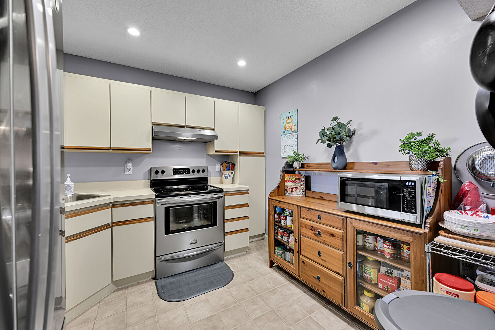Drywall, Medium Brown Cabinets, Recessed Lighting, Textured Ceiling, Tile Floor, Drywall, Medium Brown Cabinets, Tile Floor
