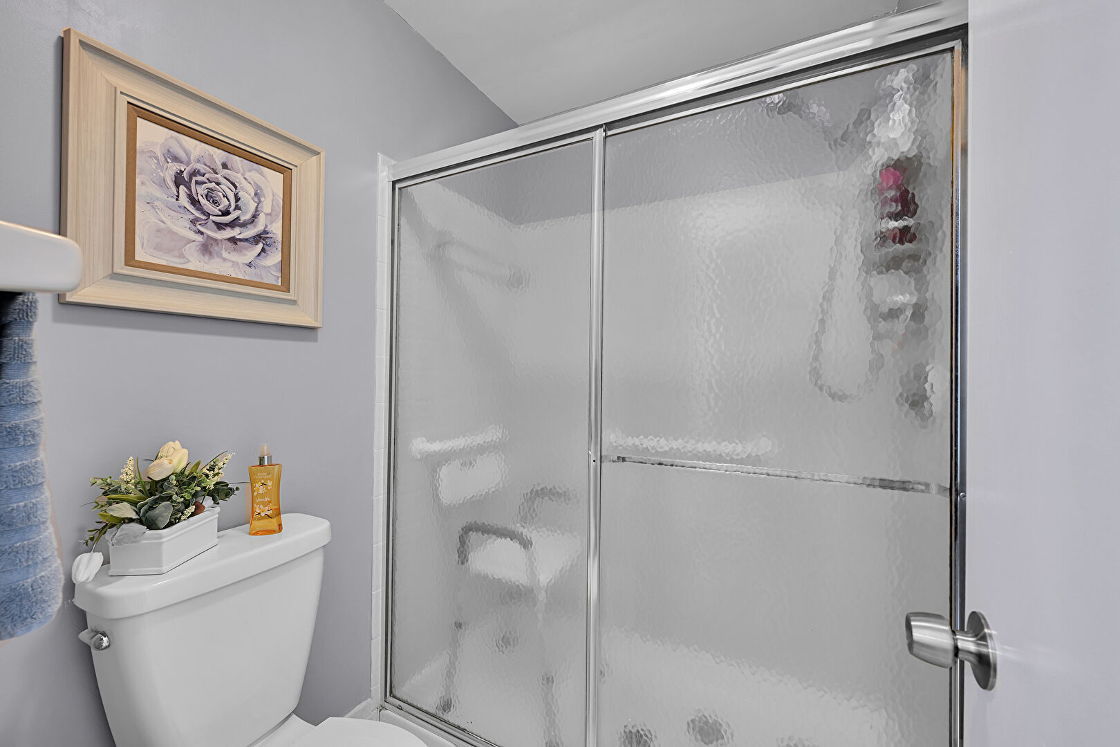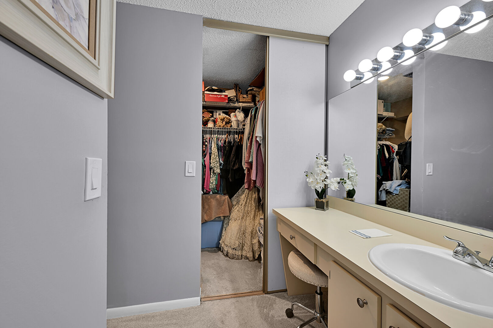 Baseboards Wall, Carpet, Combined Bath Shower, Drywall, Full Bathroom, Natural Light, Notable Chandelier, Textured Ceiling, Tile Floor, Vanity, Walk In Closet, Baseboards Wall, Carpet, Drywall, Full Bathroom, Tile Floor