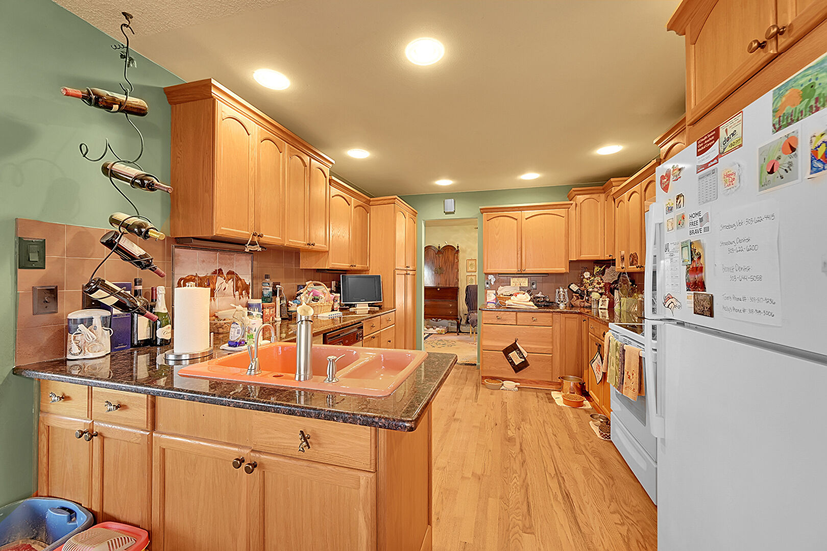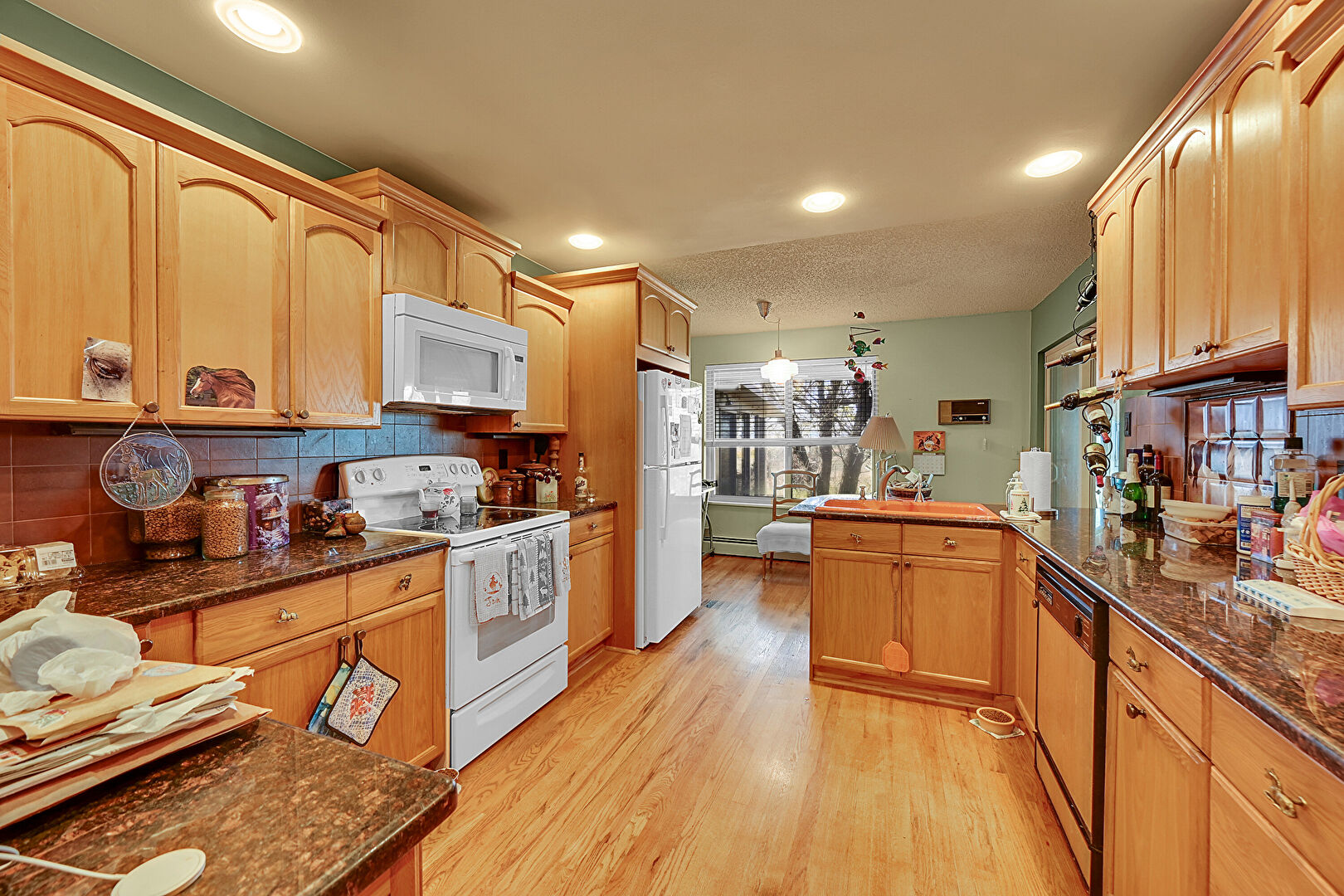 Arched Cabinets,  Baseboard Radiator,  Baseboards Wall,  Carpet,  Crown Molding Cabinets,  Drywall,  G Shaped Kitchen,  Kitchen Peninsula,  Medium Brown Cabinets,  Natural Light,  Pendant Lighting,  Recessed Lighting,  Shaker Cabinets,  Stone Countertops,  Textured Ceiling,  Textured Wall,  Visible Hinge Cabinets,  Wood Finish Floor, Crown Molding Cabinets, L Shaped Kitchen, Recessed Lighting