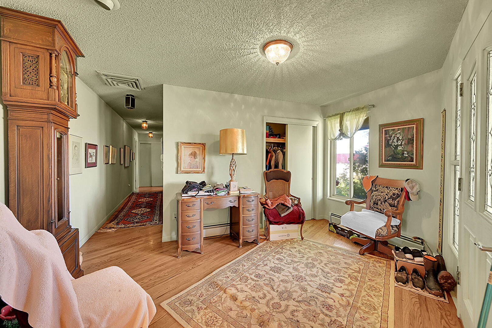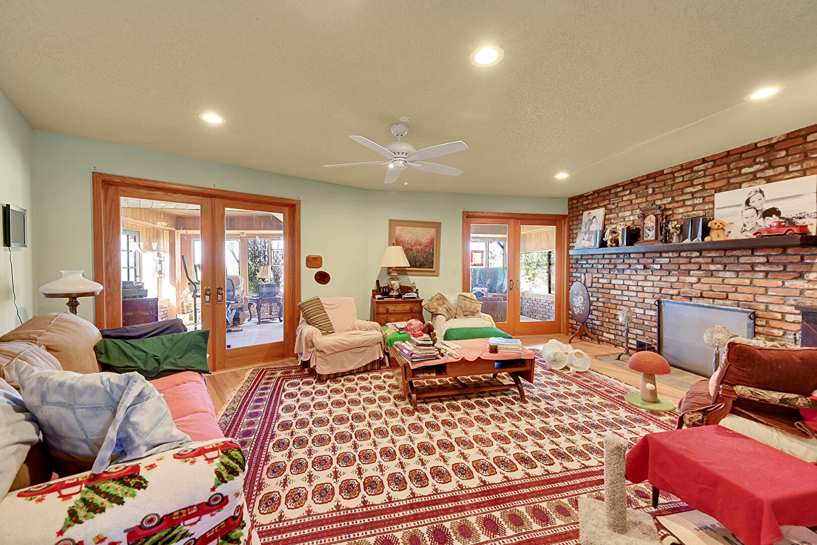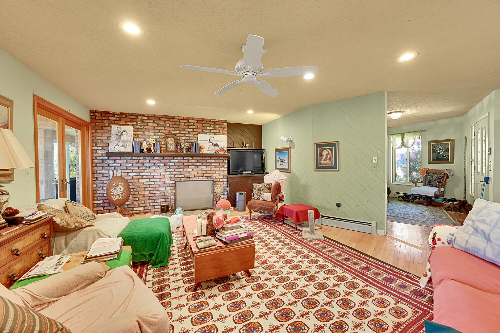 Baseboard Radiator,  Baseboards Wall,  Brick Wall,  Carpet,  Ceiling Fan,  Drywall,  Fireplace,  French Doors,  L Shaped Kitchen,  Natural Light,  Recessed Lighting,  Textured Ceiling,  Textured Wall,  Wood Finish Floor,  Wood Wall, Ceiling Fan, Fireplace, Recessed Lighting