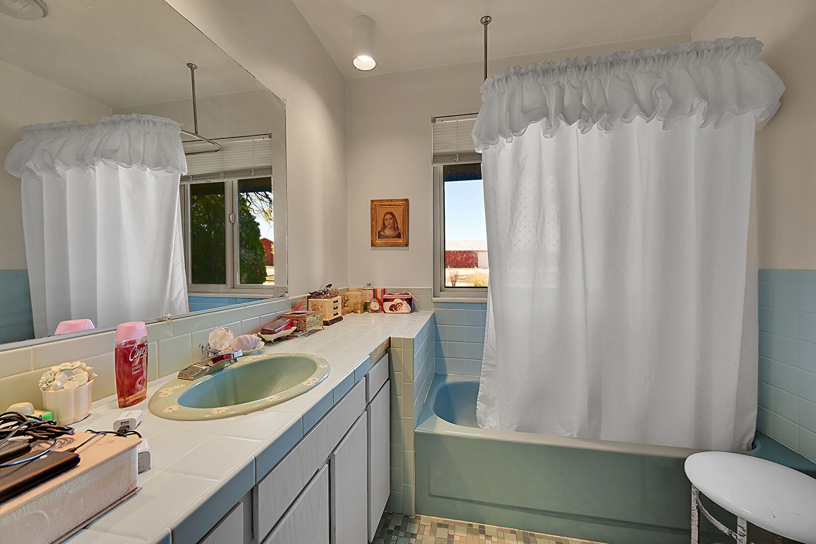 Combined Bath Shower,  Drywall,  Full Bathroom,  Natural Light,  Recessed Lighting,  Tile Wall,  Wainscot Wall, Vanity