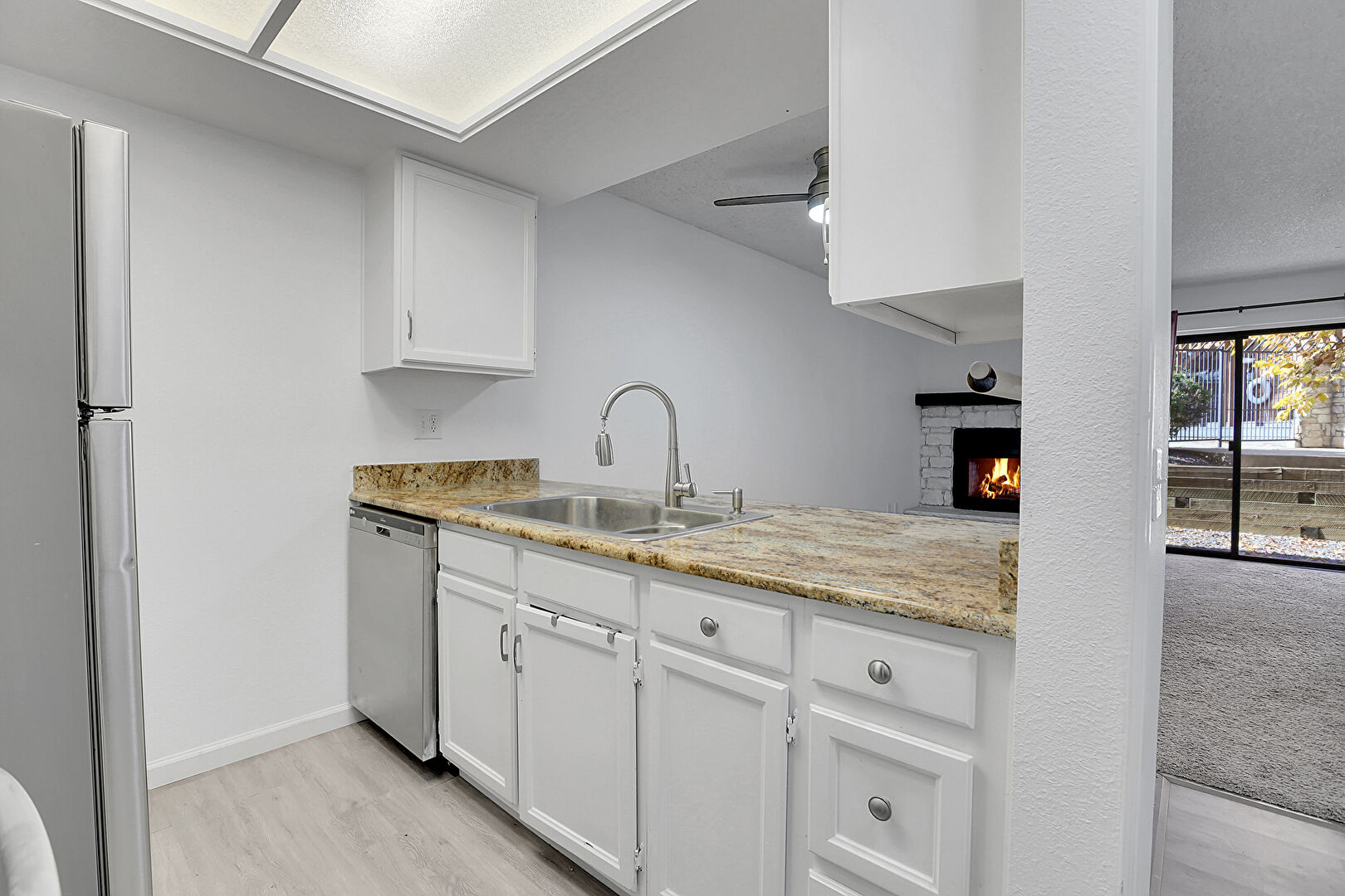 Baseboards Wall, Carpet, Ceiling Fan, Drywall, Fireplace, Kitchen Peninsula, Natural Light, Opens To Living Area, Pass Through Window, Shaker Cabinets, Stone Countertops, Textured Ceiling, Textured Wall, Vent, Visible Hinge Cabinets, Wood Finish Floor, Stone Countertops, Textured Ceiling, Visible Hinge Cabinets, Wood Finish Floor