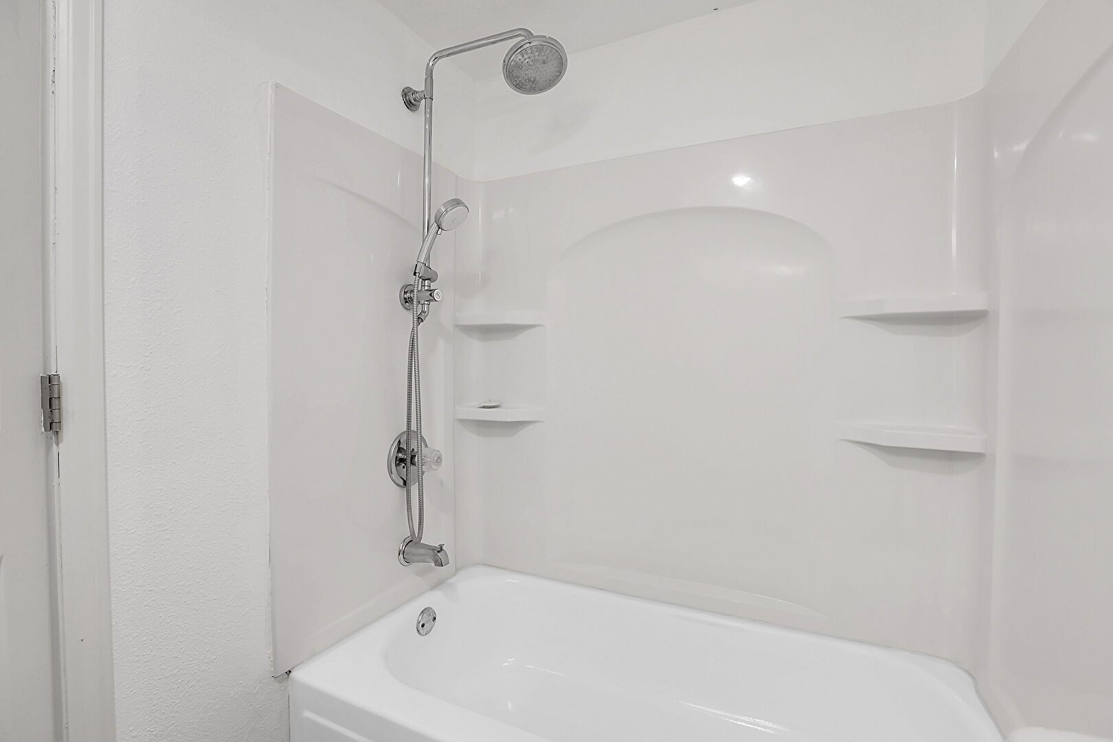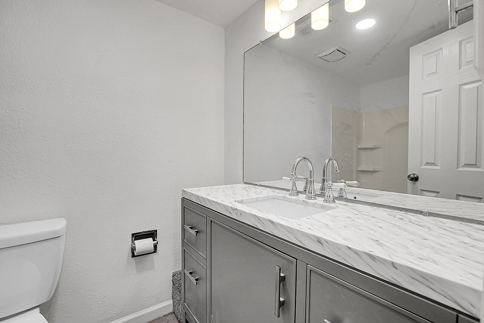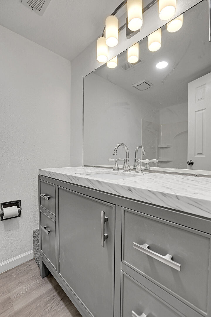 Baseboards Wall, Full Bathroom, Recessed Lighting, Textured Wall, Vanity, Vent, Wood Finish Floor, Baseboards Wall, Combined Bath Shower, Textured Wall, Vent
