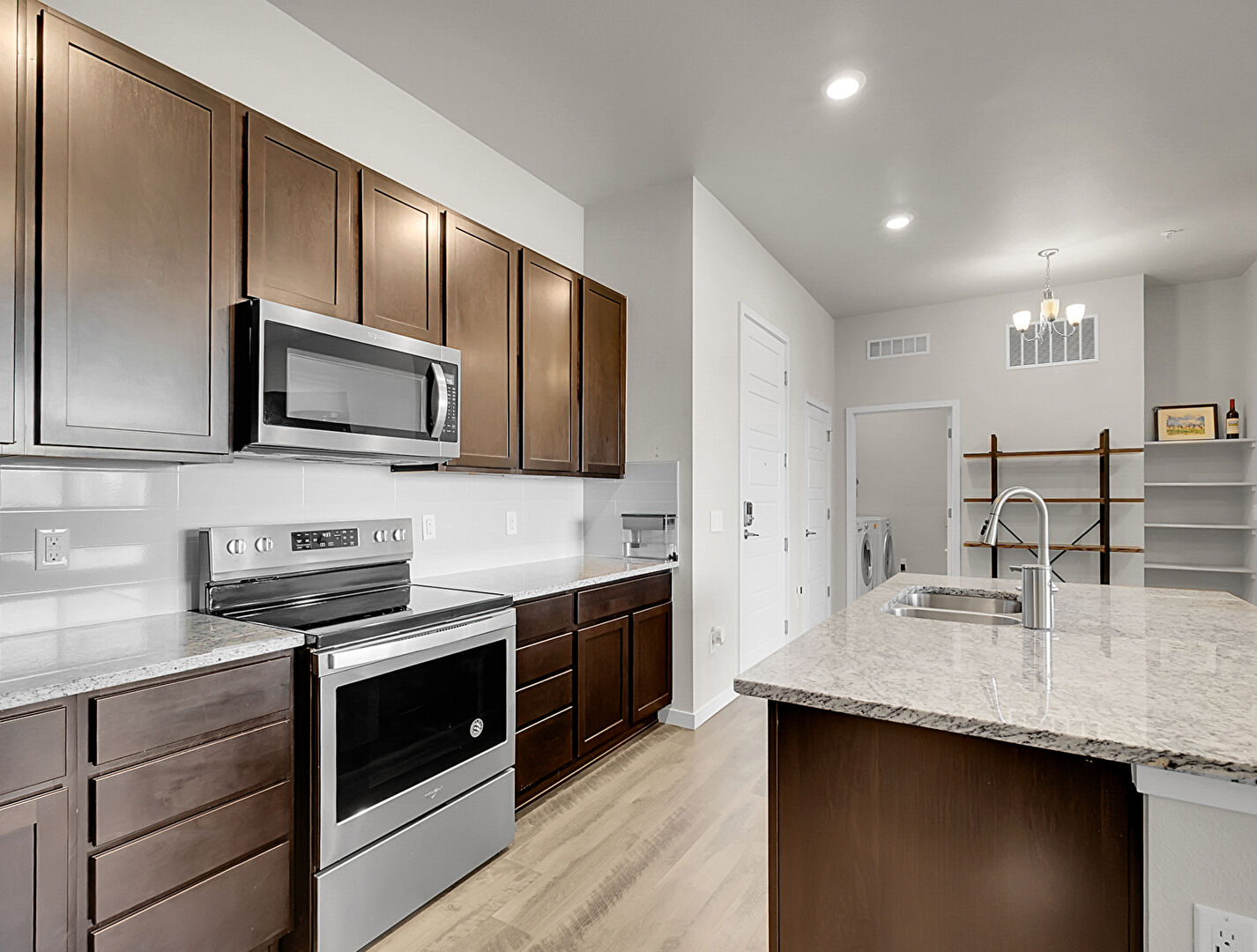 Baseboards Wall,  Dark Brown Cabinets,  Drywall,  Electric Panel,  Kitchen Bar,  Kitchen Island,  L Shaped Kitchen,  Laundry,  Natural Light,  Notable Chandelier,  Opens To Living Area,  Pendant Lighting,  Recessed Lighting,  Shaker Cabinets,  Stone Countertops,  Vent,  Wood Finish Floor, Baseboards Wall, Dark Brown Cabinets, Kitchen Island, L Shaped Kitchen, Natural Light, Pendant Lighting, Stone Countertops