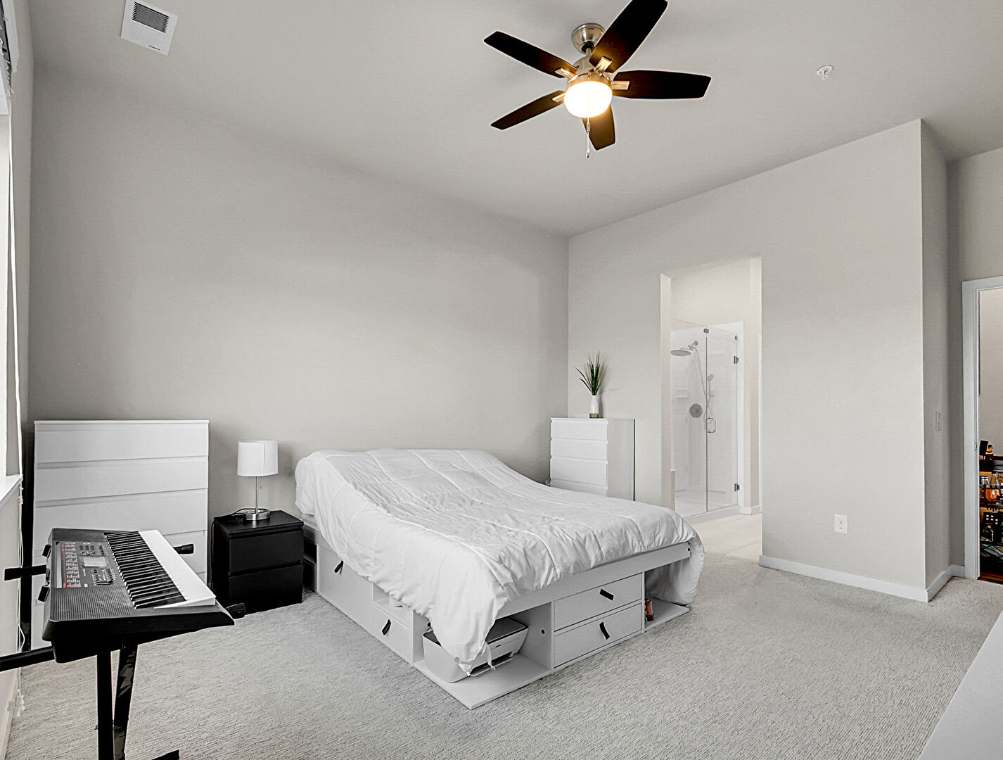 Baseboards Wall,  Carpet,  Ceiling Fan,  Drywall,  Natural Light,  Vent, Baseboards Wall, Ceiling Fan, Ensuite Bathroom