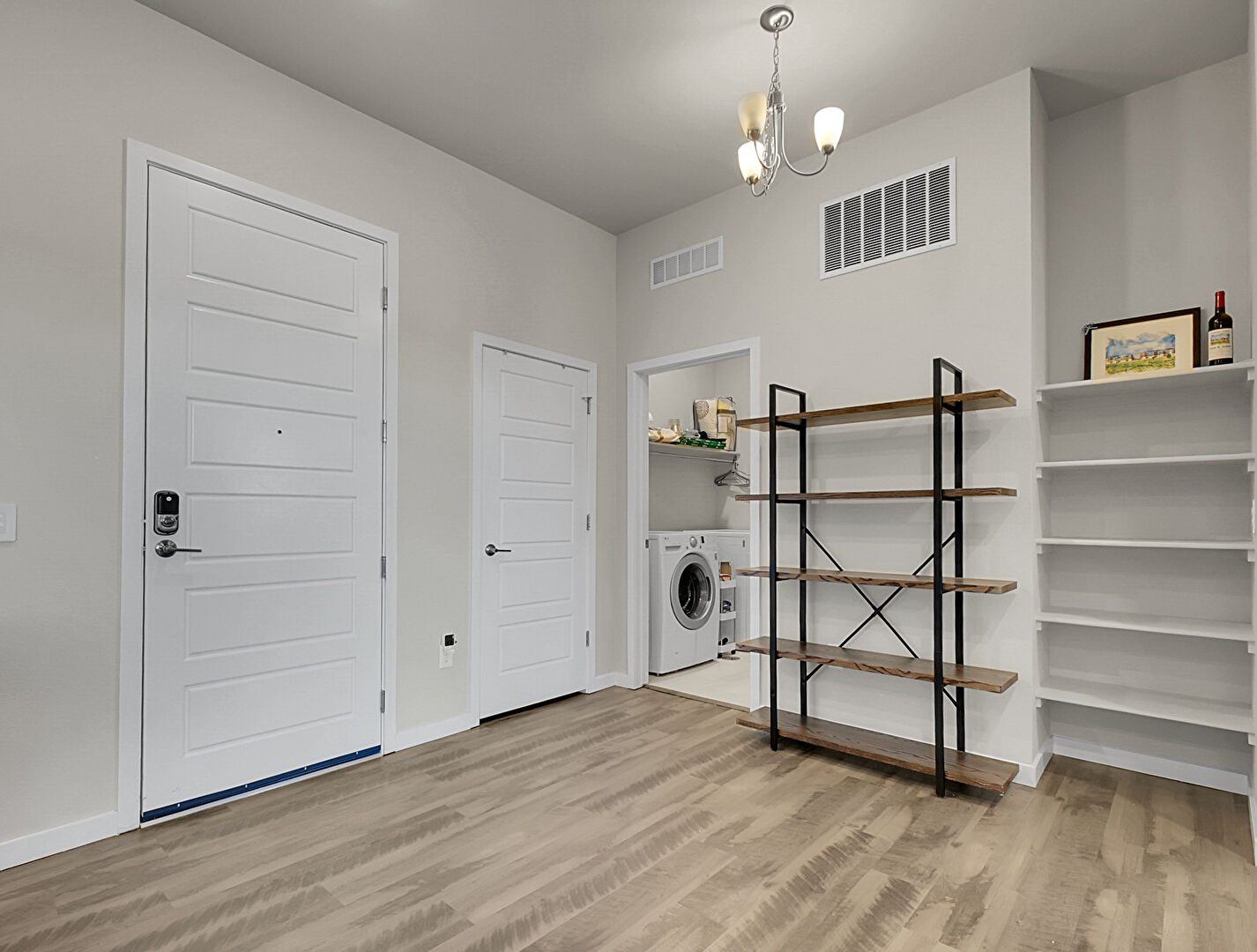 Baseboards Wall,  Drywall,  Electric Panel,  Laundry,  Natural Light,  Recessed Lighting,  Vent,  Washer Dryer,  Wood Finish Floor, L Shaped Kitchen, Notable Chandelier, Wine Cooler, Wood Finish Floor