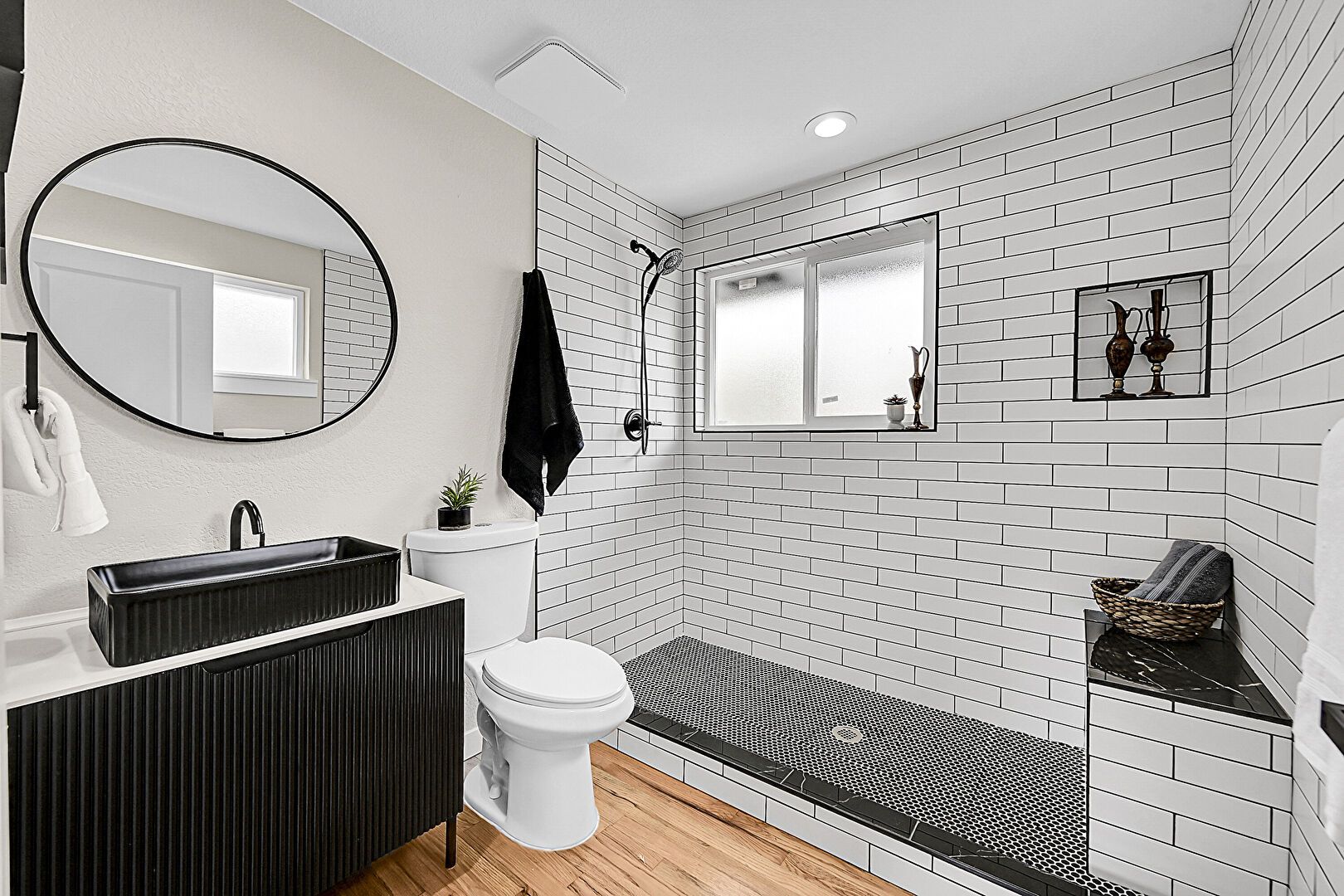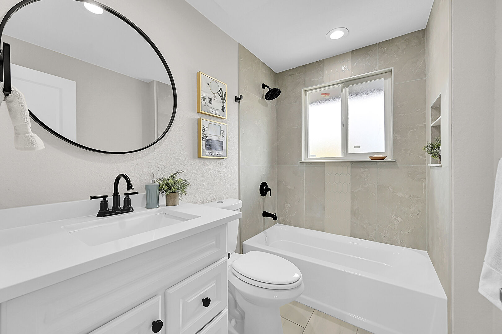 Combined Bath Shower, Full Bathroom, Natural Light, Recessed Lighting, Textured Wall, Tile Floor, Vanity, Wood Finish Floor, Natural Light, Tile Floor, Vanity