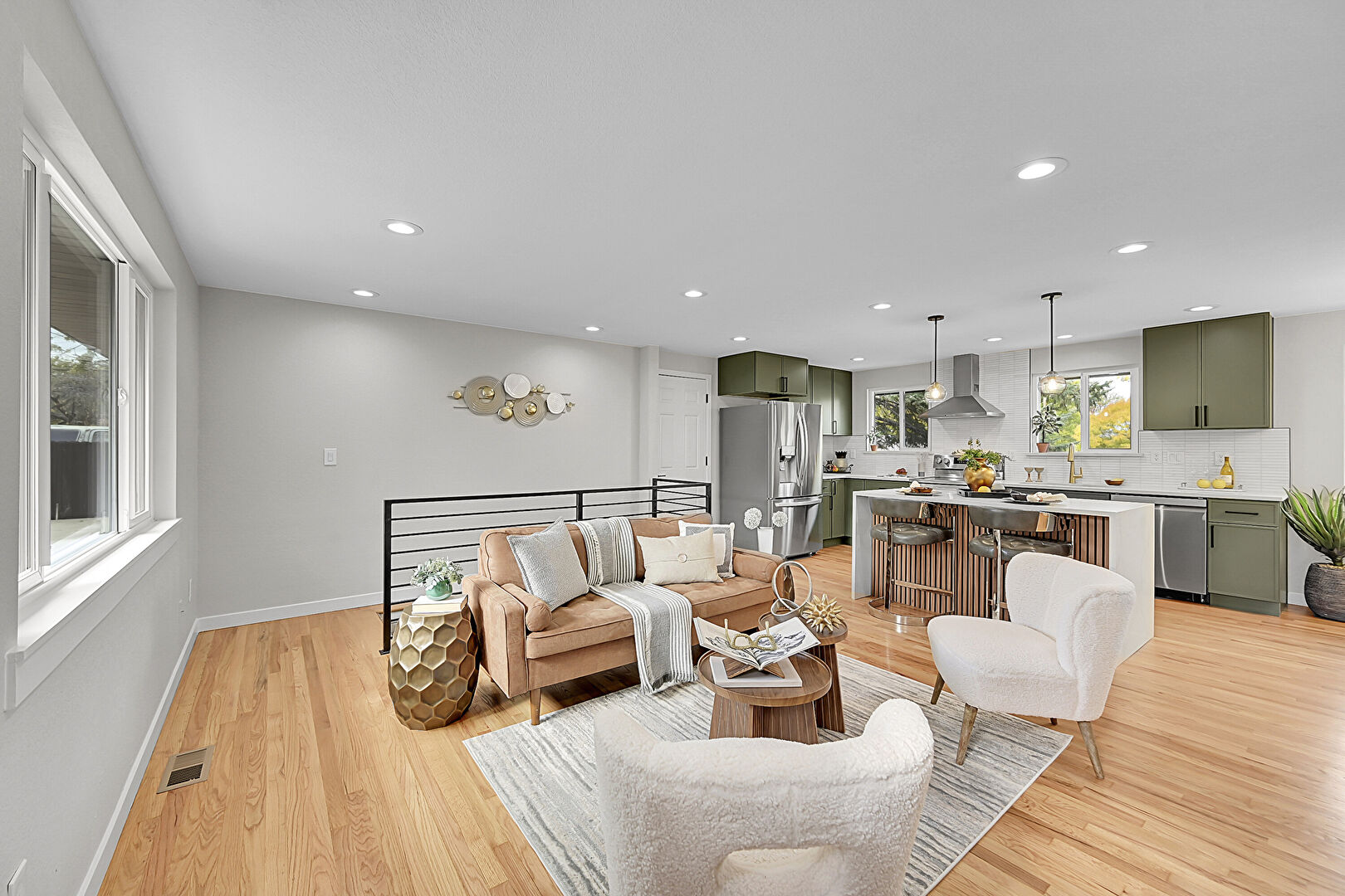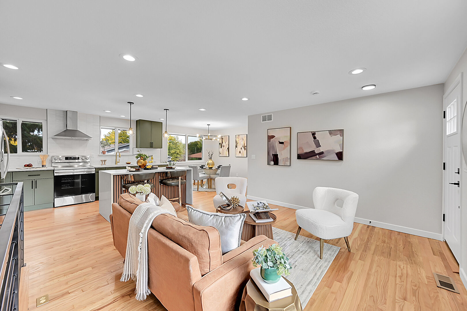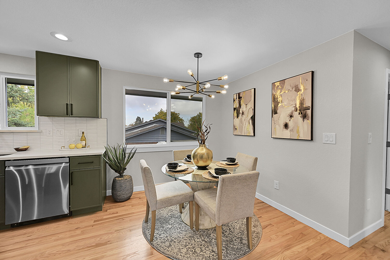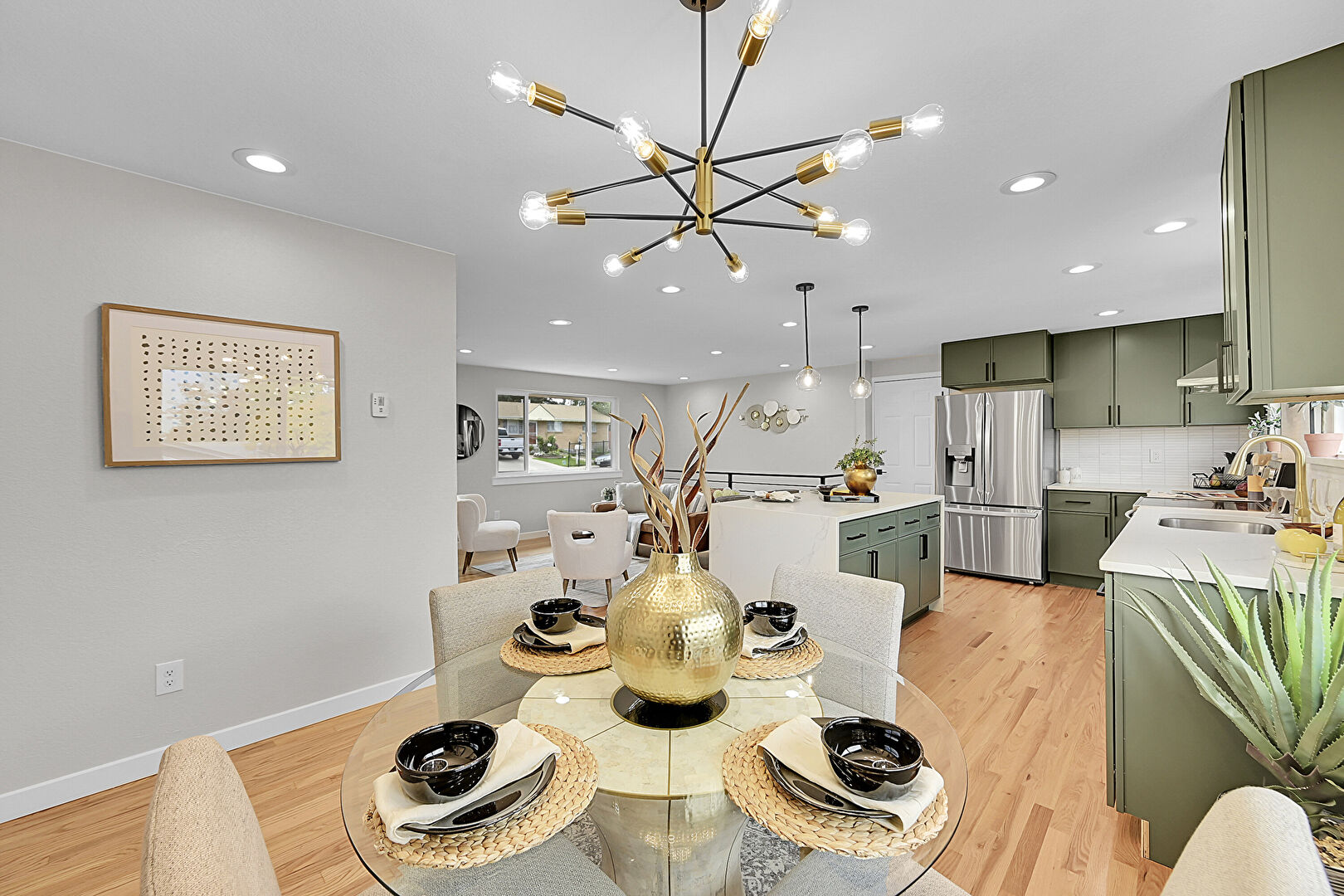 Baseboards Wall, Drywall, L Shaped Kitchen, Natural Light, Notable Chandelier, Recessed Lighting, Wood Finish Floor, Notable Chandelier, Recessed Lighting