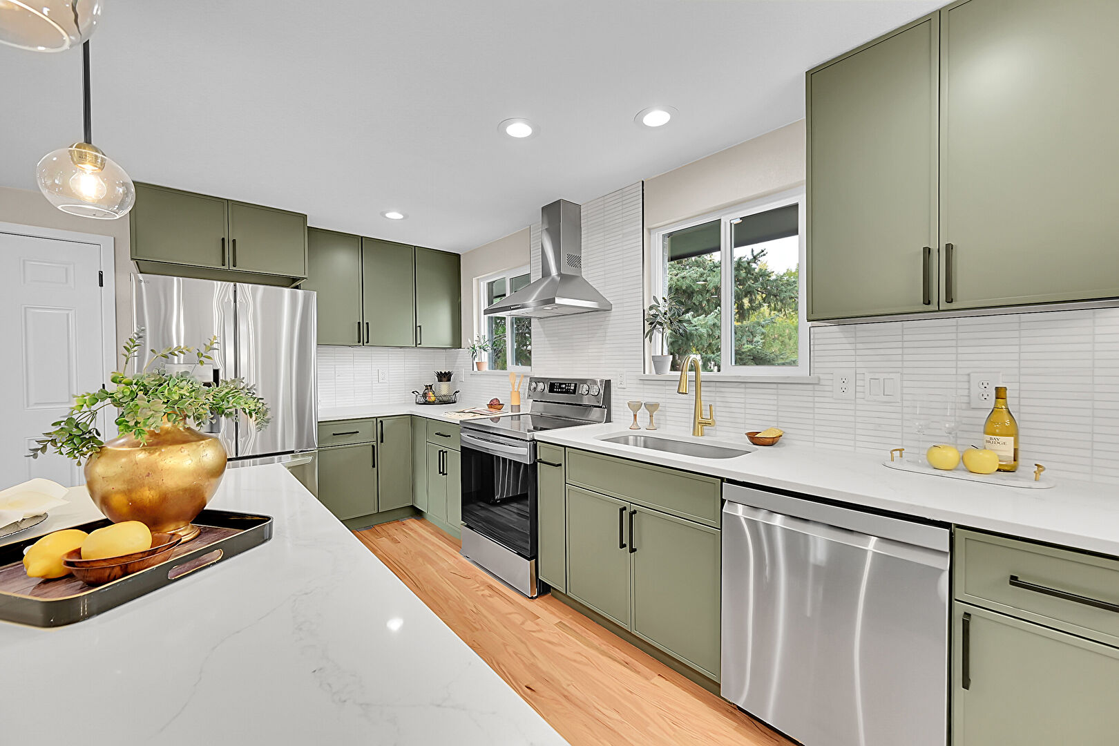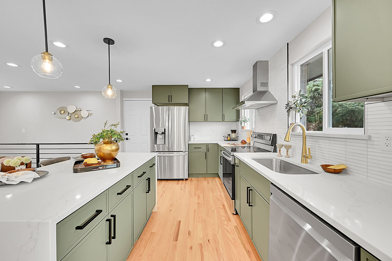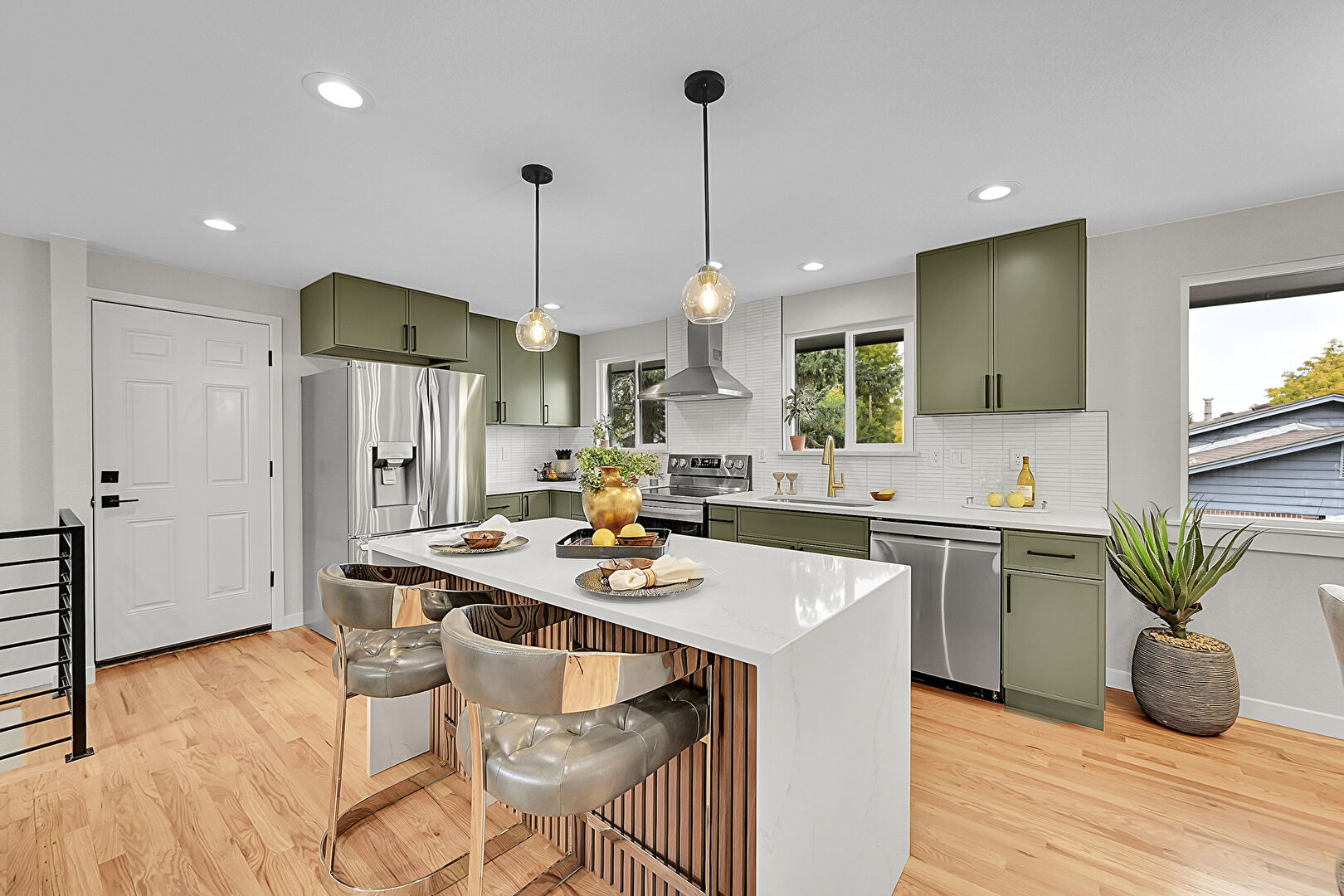 Baseboards Wall, Drywall, Green Cabinets, Kitchen Bar, Kitchen Island, L Shaped Kitchen, Natural Light, Notable Chandelier, Opens To Living Area, Pendant Lighting, Recessed Lighting, Shaker Cabinets, Stone Countertops, Vent, Wood Finish Floor, Baseboards Wall, Green Cabinets, Pendant Lighting, Stone Countertops