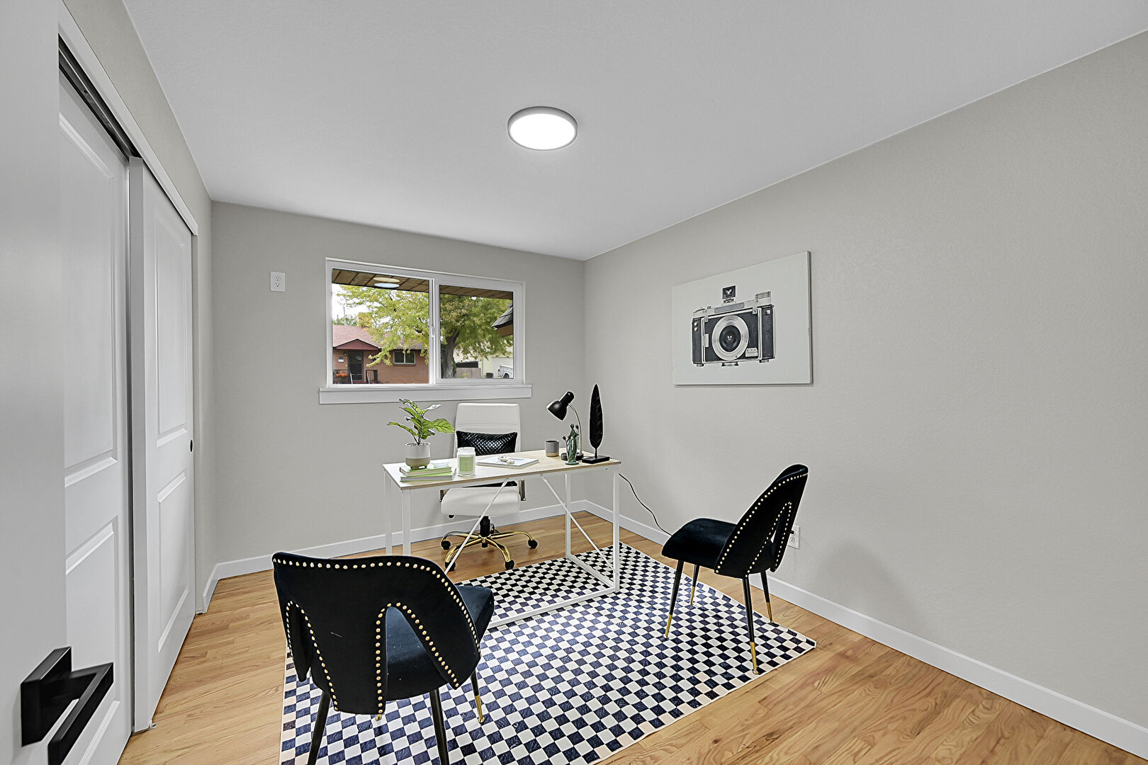 Baseboards Wall, Drywall, Natural Light, Wood Finish Floor, Office Area