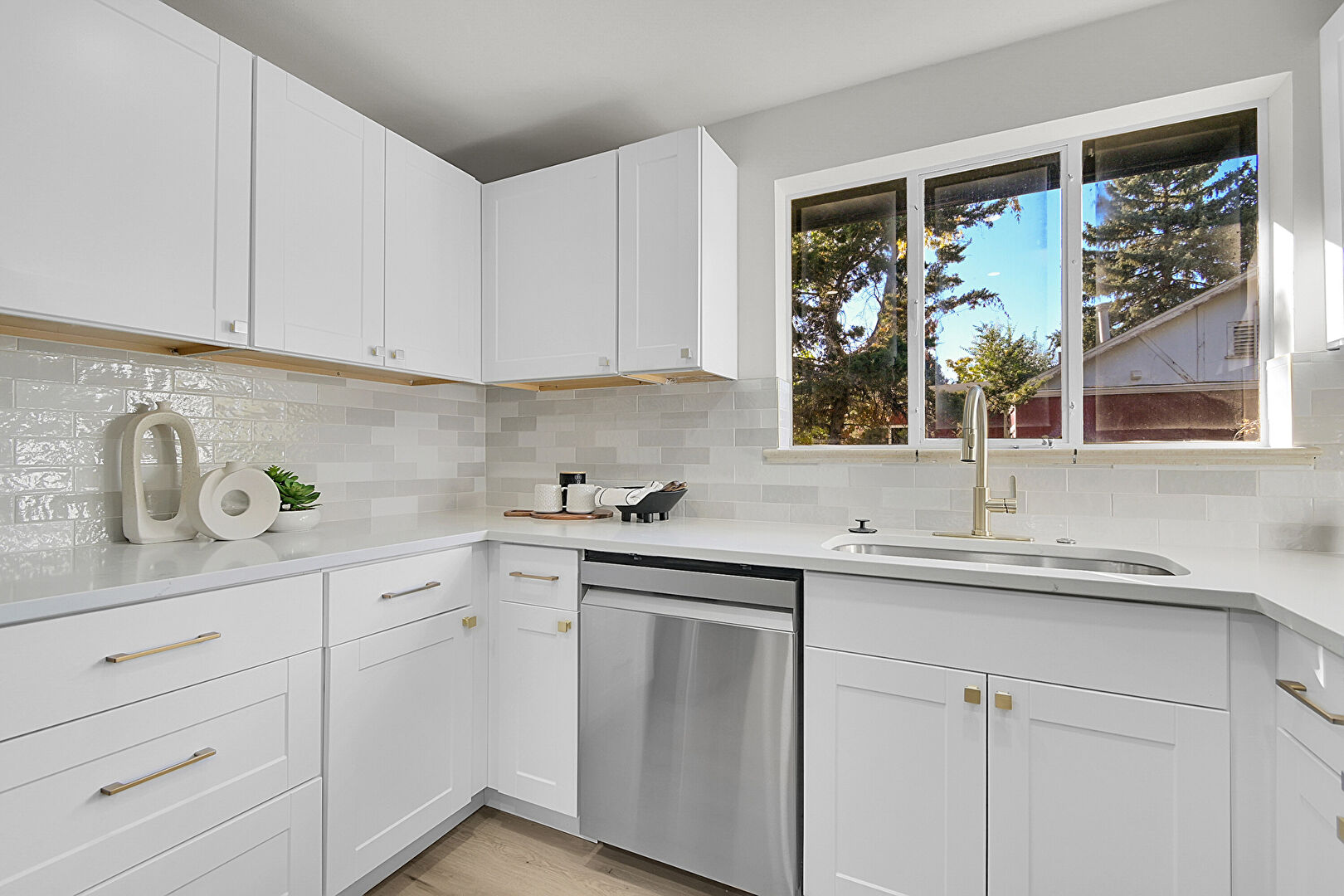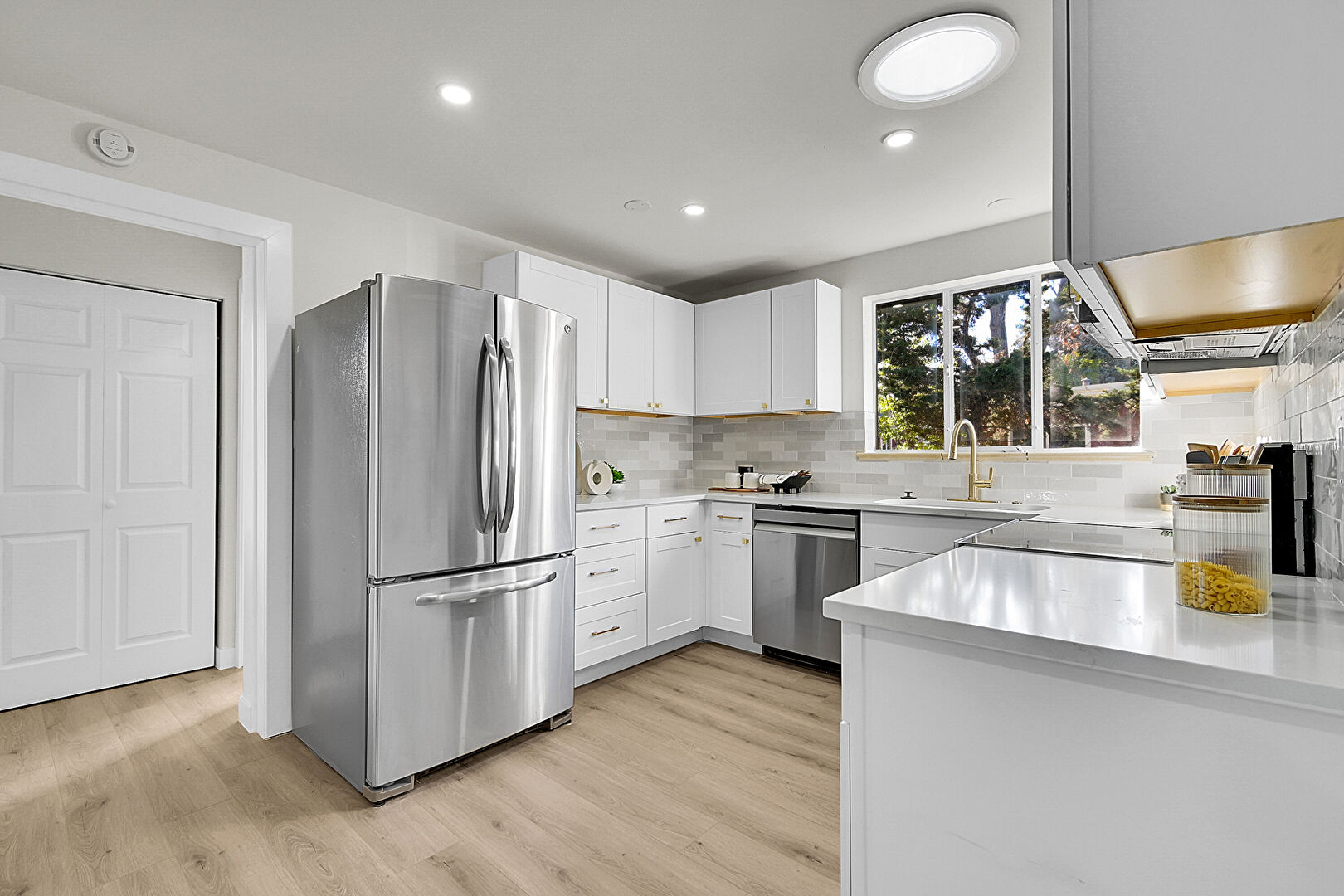 Baseboards Wall, Beamed Ceiling, Drywall, Fireplace, Natural Light, Opens To Living Area, Recessed Lighting, Shaker Cabinets, Smoke Carbon Monoxide Detector, Stone Countertops, U Shaped Kitchen, Wood Finish Floor, Drywall, Natural Light, Recessed Lighting