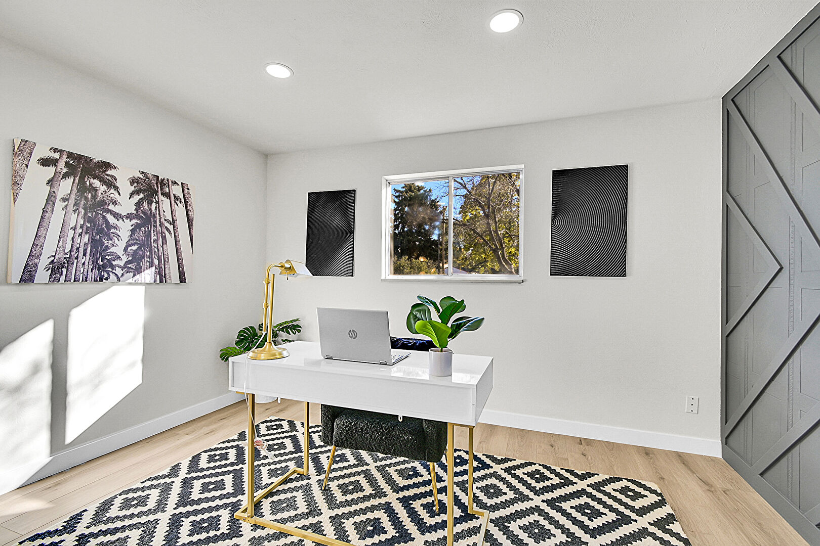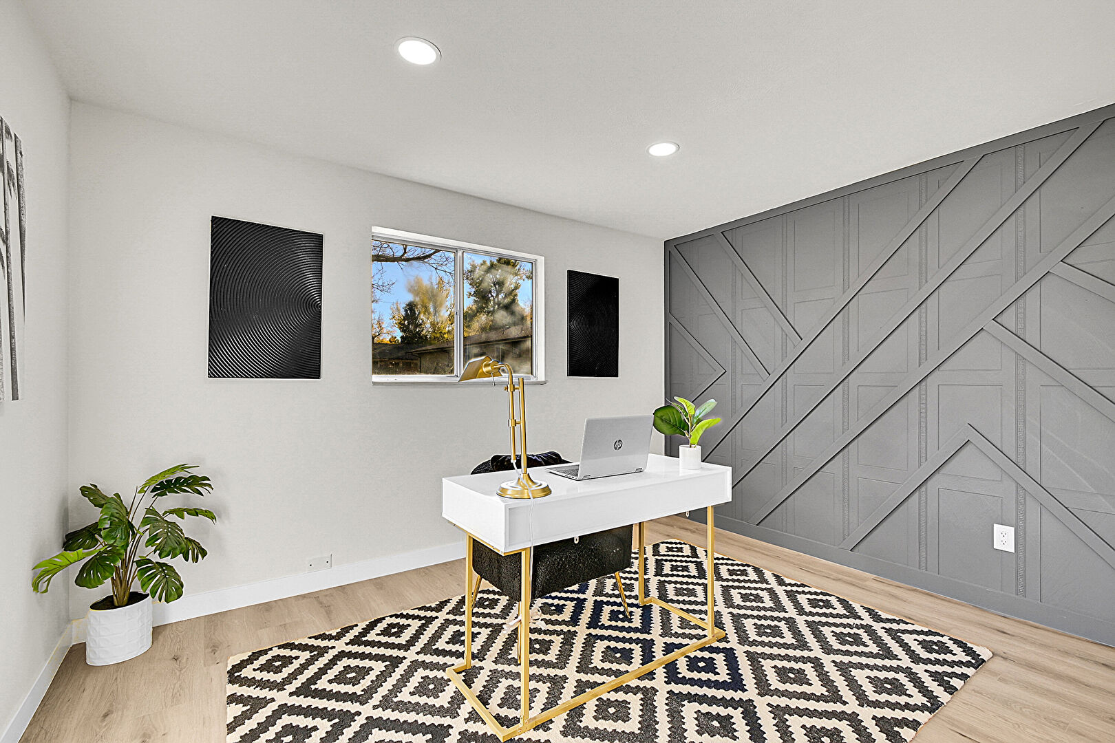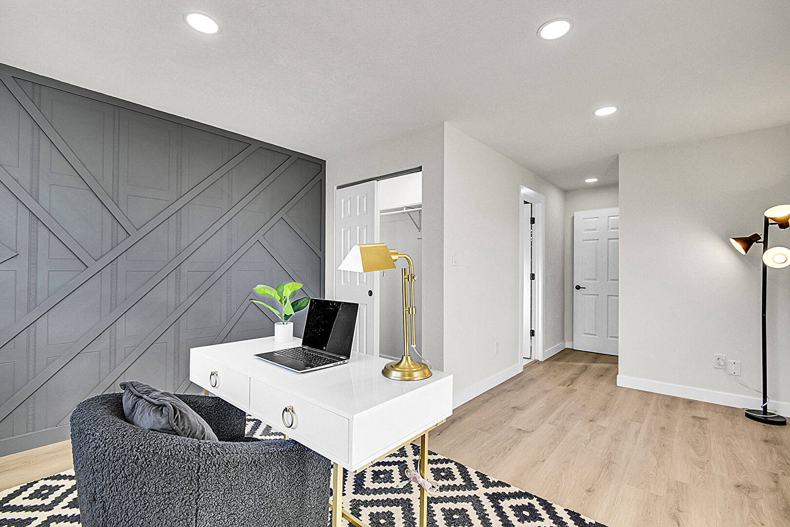 Accent Wall, Baseboards Wall, Drywall, Natural Light, Office Area, Recessed Lighting, Wood Finish Floor, Baseboards Wall, Natural Light, Office Area