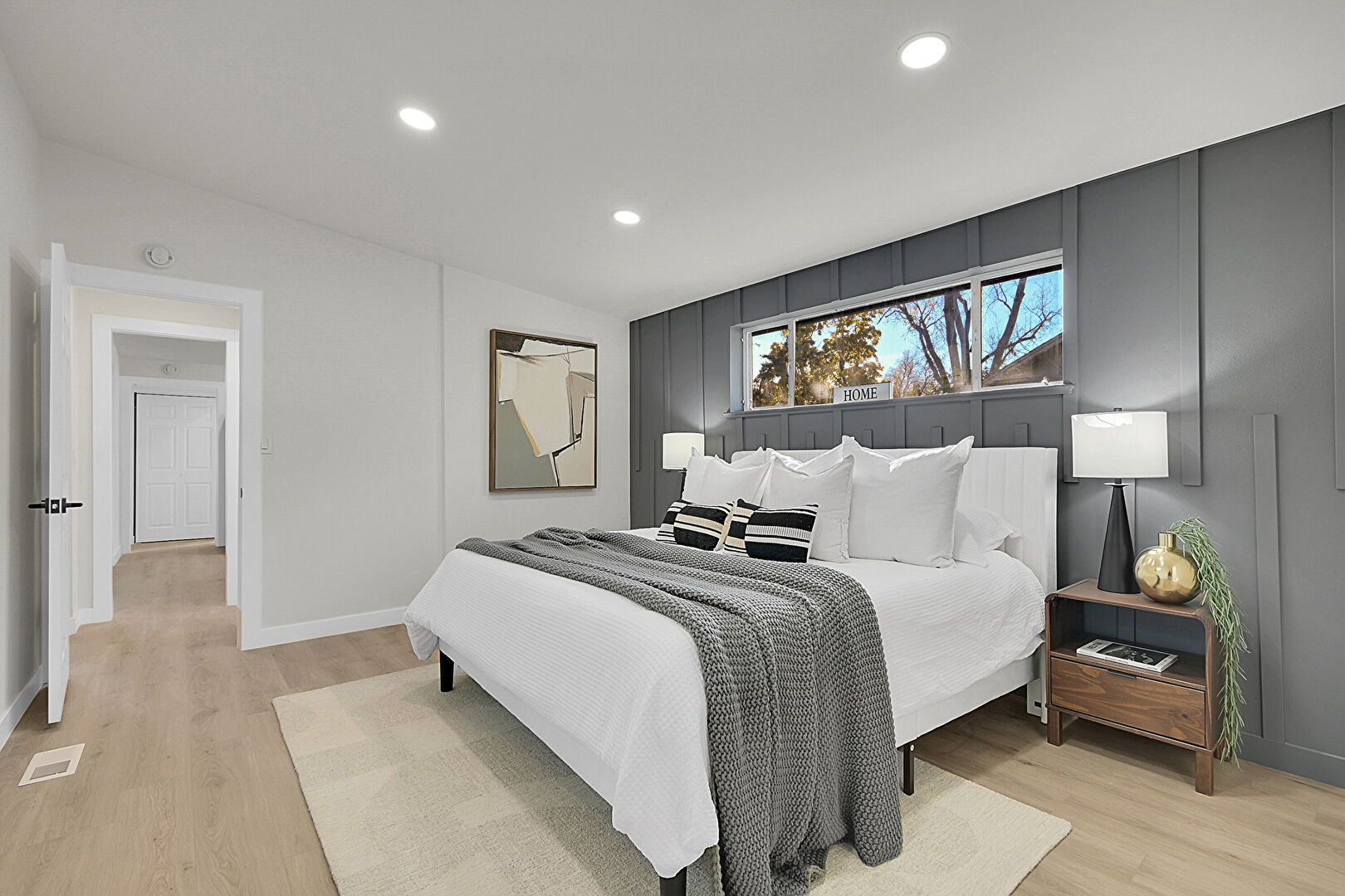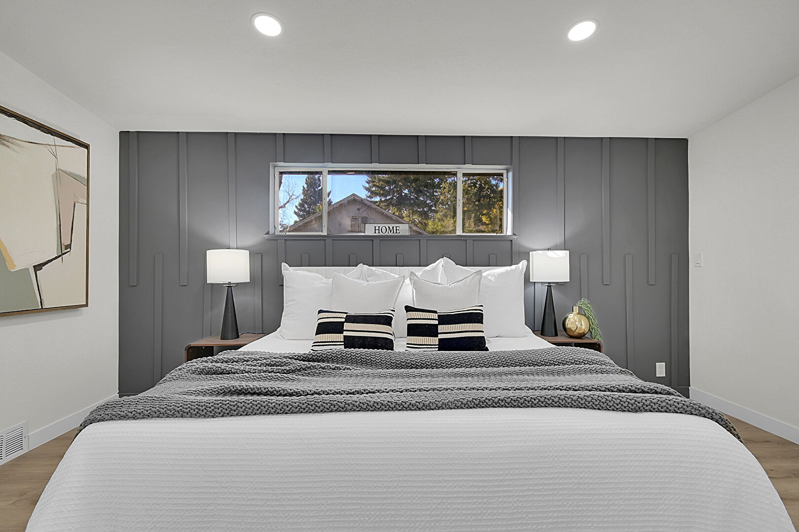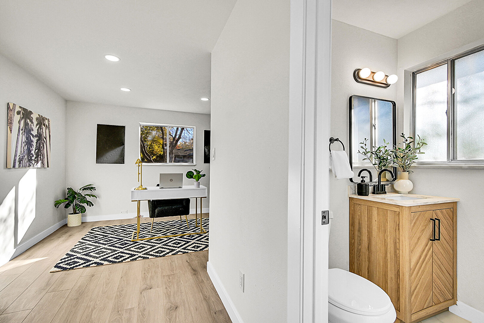 Accent Wall, Baseboards Wall, Drywall, Natural Light, Office Area, Recessed Lighting, Wood Finish Floor, Baseboards Wall, Natural Light, Office Area
