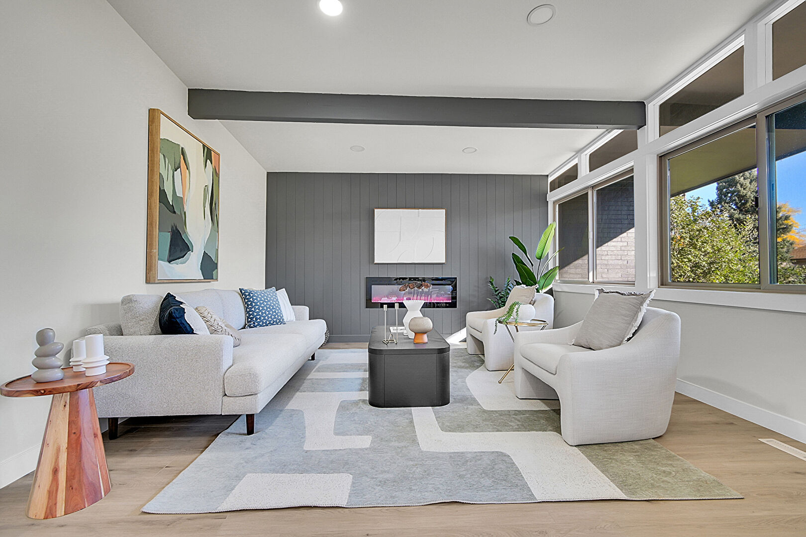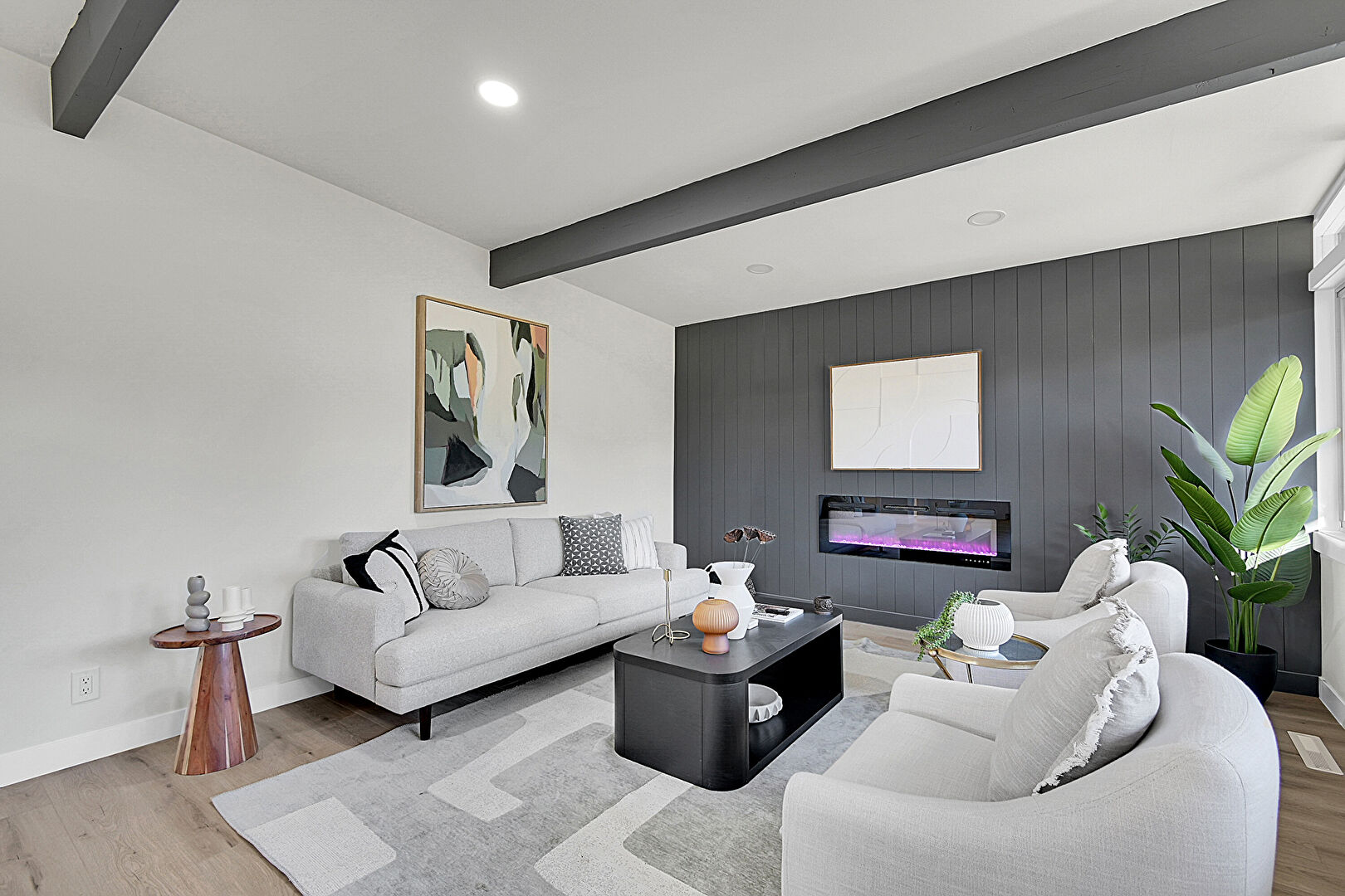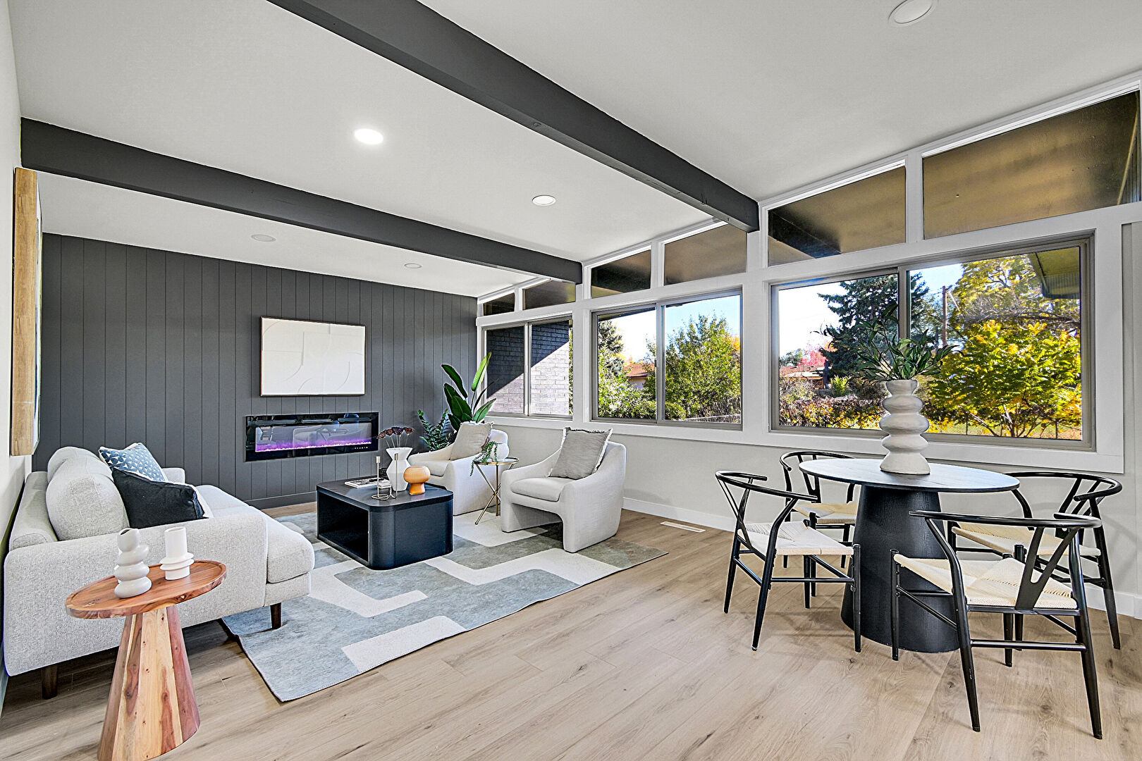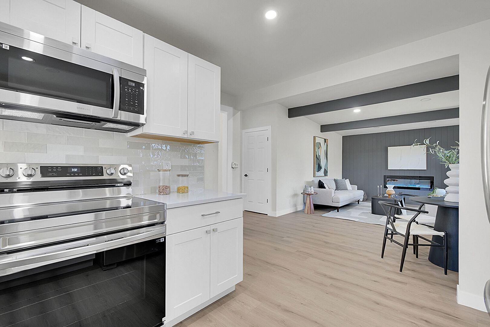 Accent Wall, Baseboards Wall, Beamed Ceiling, Drywall, Fireplace, L Shaped Kitchen, Natural Light, Recessed Lighting, Vent, Wood Finish Floor, Wood Wall, Baseboards Wall, Beamed Ceiling, Drywall, Natural Light
