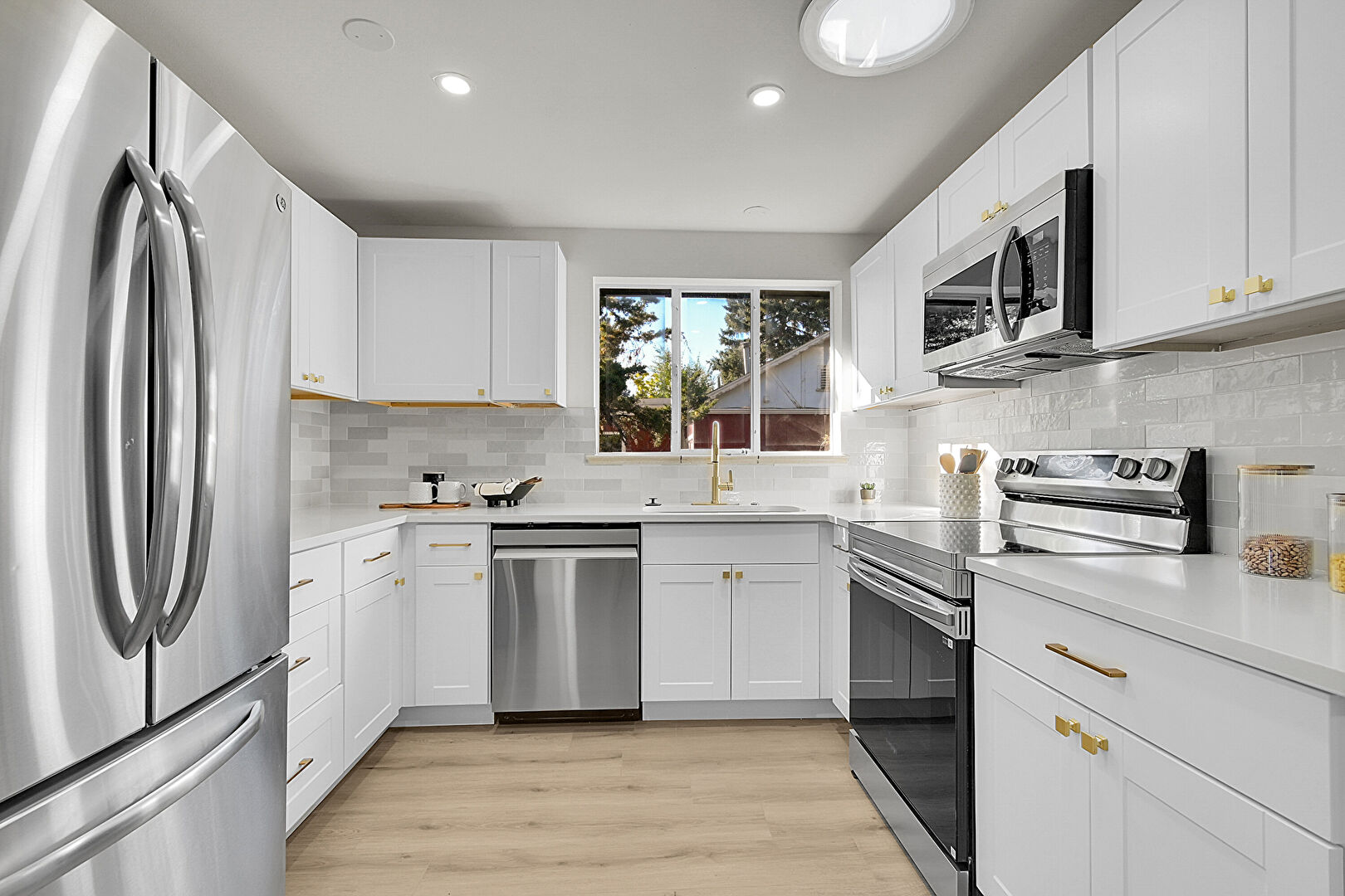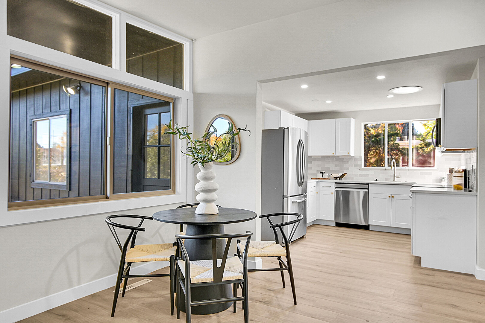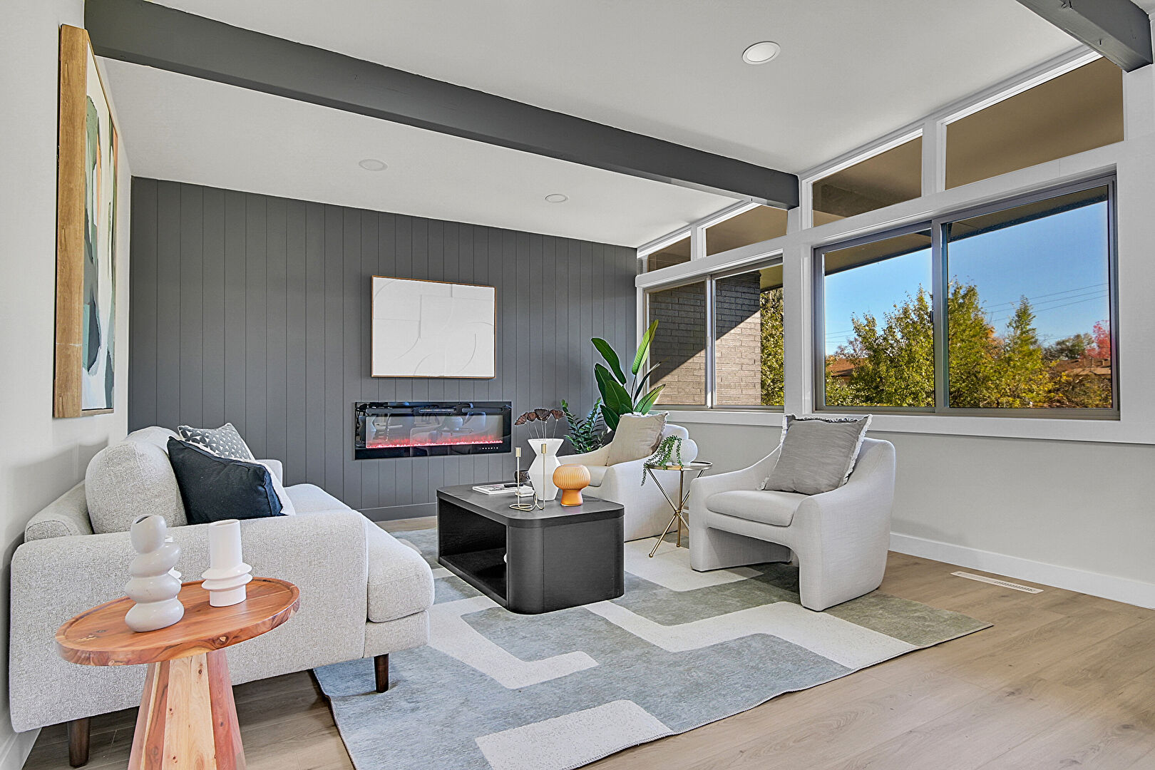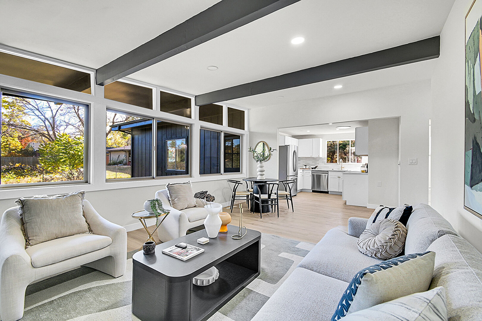 Accent Wall, Baseboards Wall, Beamed Ceiling, Drywall, Fireplace, L Shaped Kitchen, Natural Light, Recessed Lighting, Vent, Wood Finish Floor, Wood Wall, Baseboards Wall, Beamed Ceiling, Drywall, Natural Light