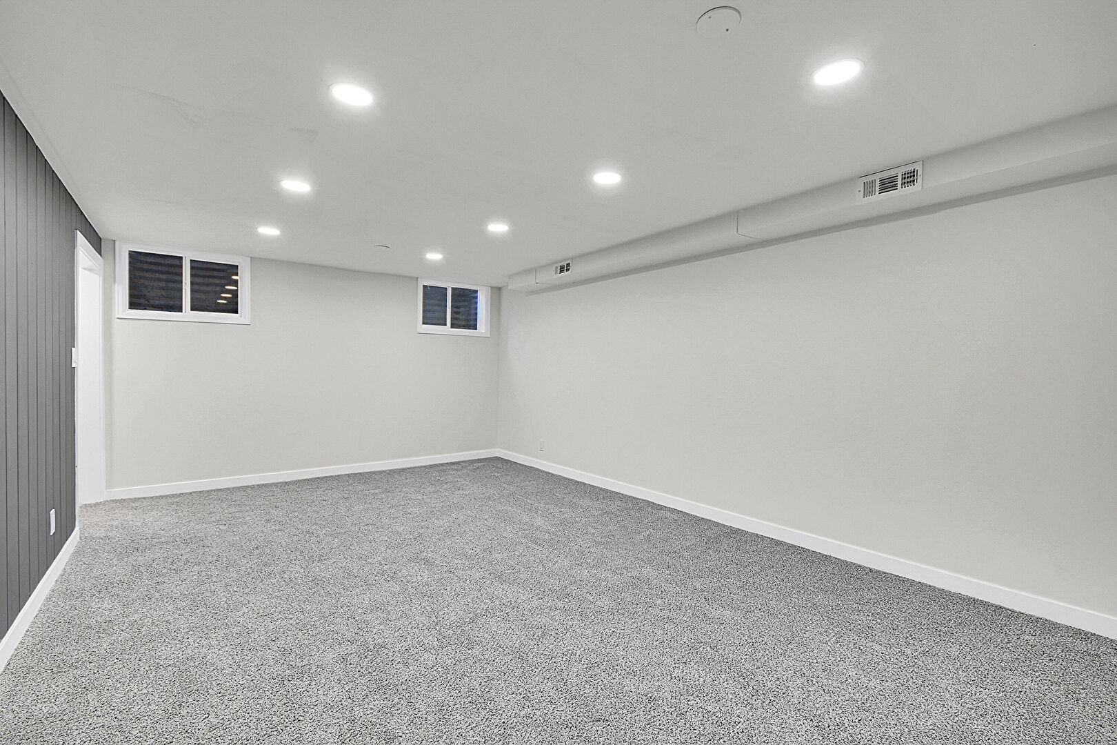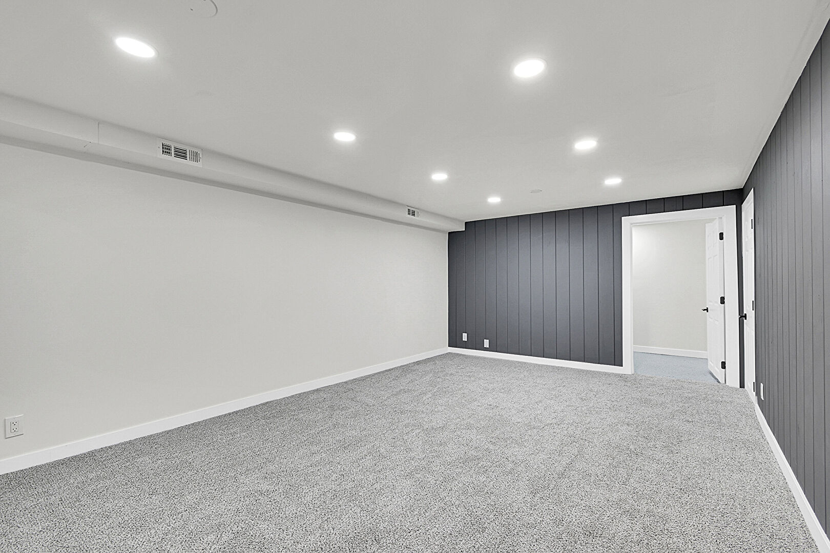 Baseboards Wall, Basement, Carpet, Drywall, Recessed Lighting, Vent, Wood Wall, Carpet, Drywall, Vent
