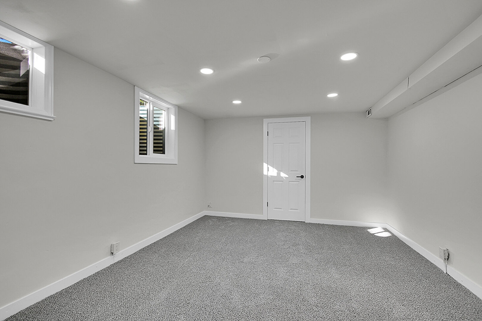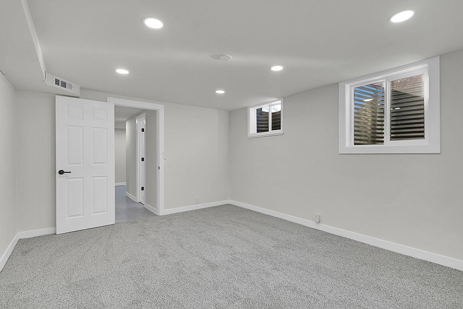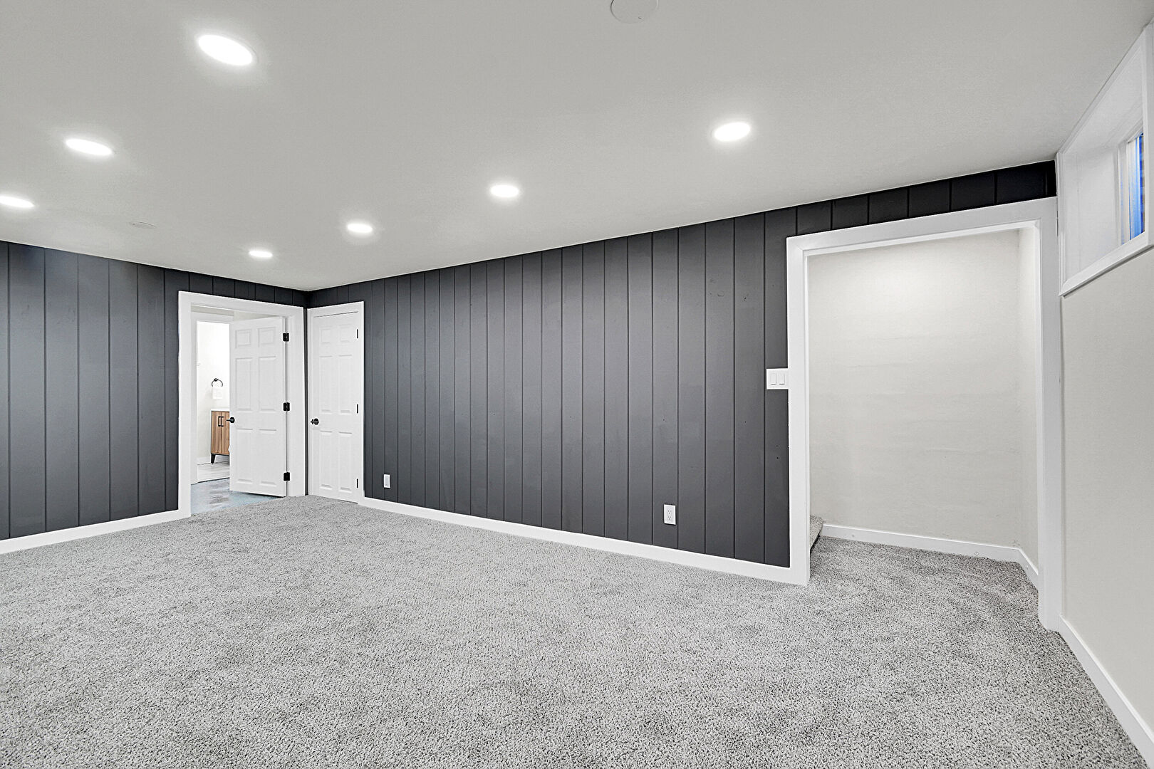 Baseboards Wall, Basement, Carpet, Drywall, Natural Light, Paneling Wall, Recessed Lighting, Vent, Wood Finish Floor, Baseboards Wall, Carpet, Closet, Drywall, Paneling Wall