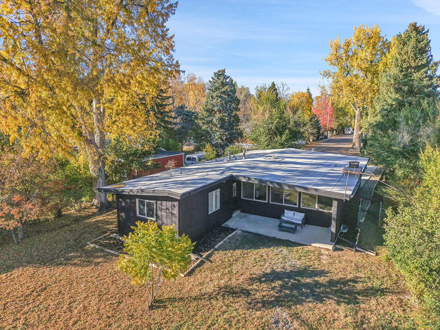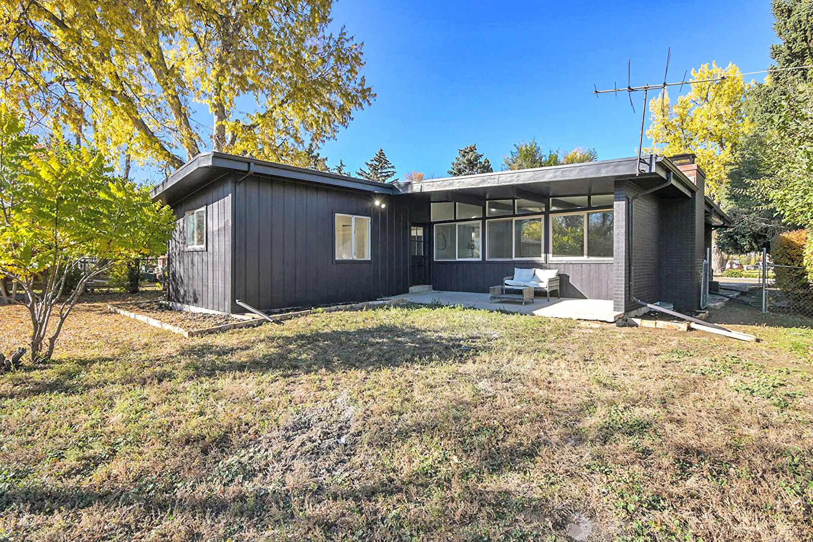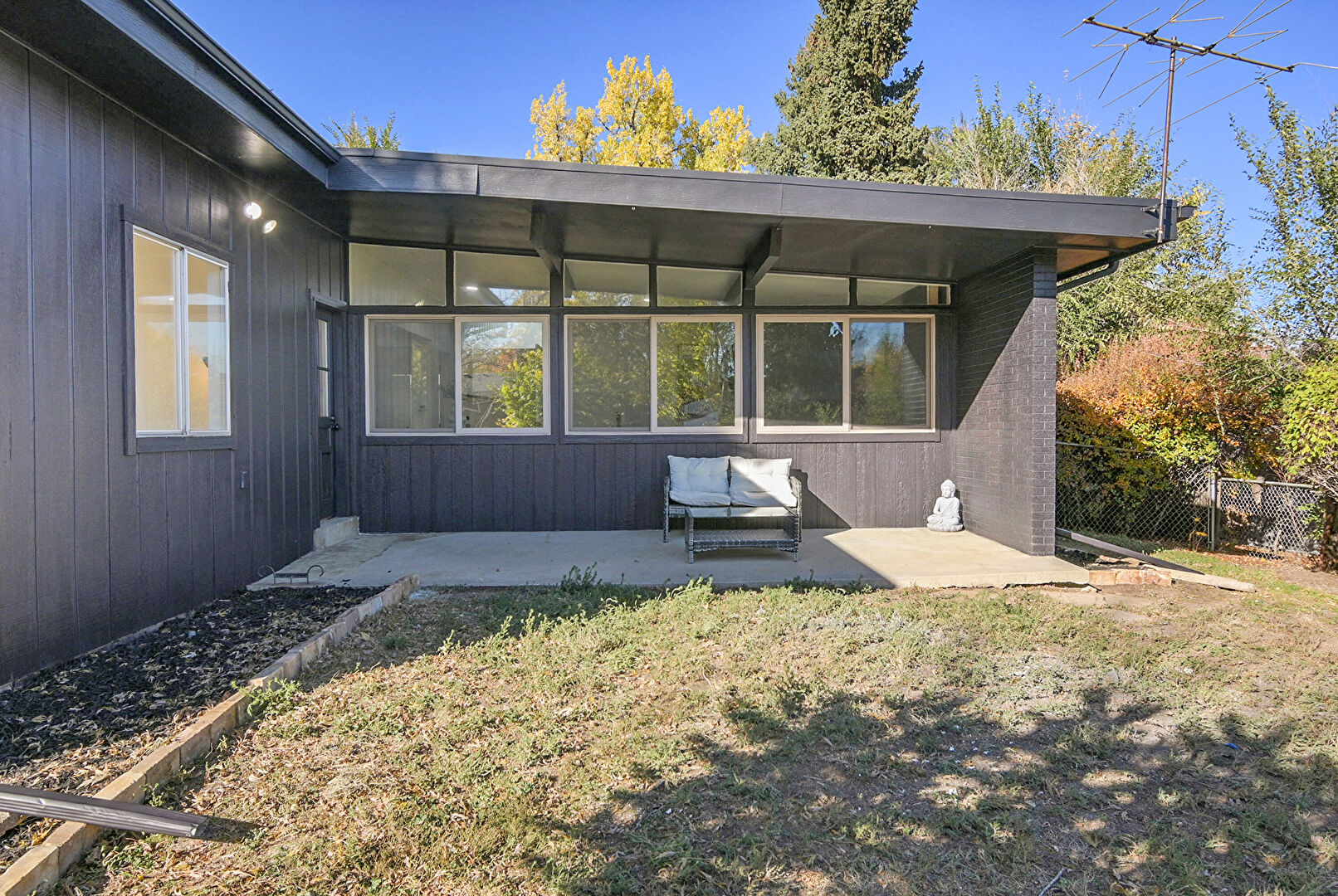 Board Batten Siding, Brick Siding, Downspout, Fence, Forest View, Gutters, Lawn, Outdoor Living Space, Patio, Rolled Roof, Sunroom, Vertical Siding, Wood Siding, Chimney, Lawn, Patio, Sunroom