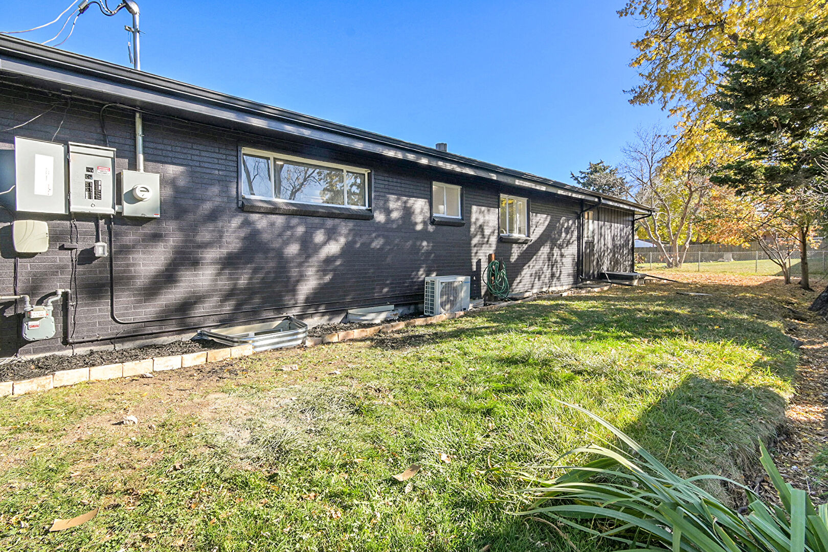 Brick Siding, Concrete Foundation, Downspout, Electric Meter, Electric Panel, Gas Meter, Gutters, Lawn, Split Ac Unit, Fence