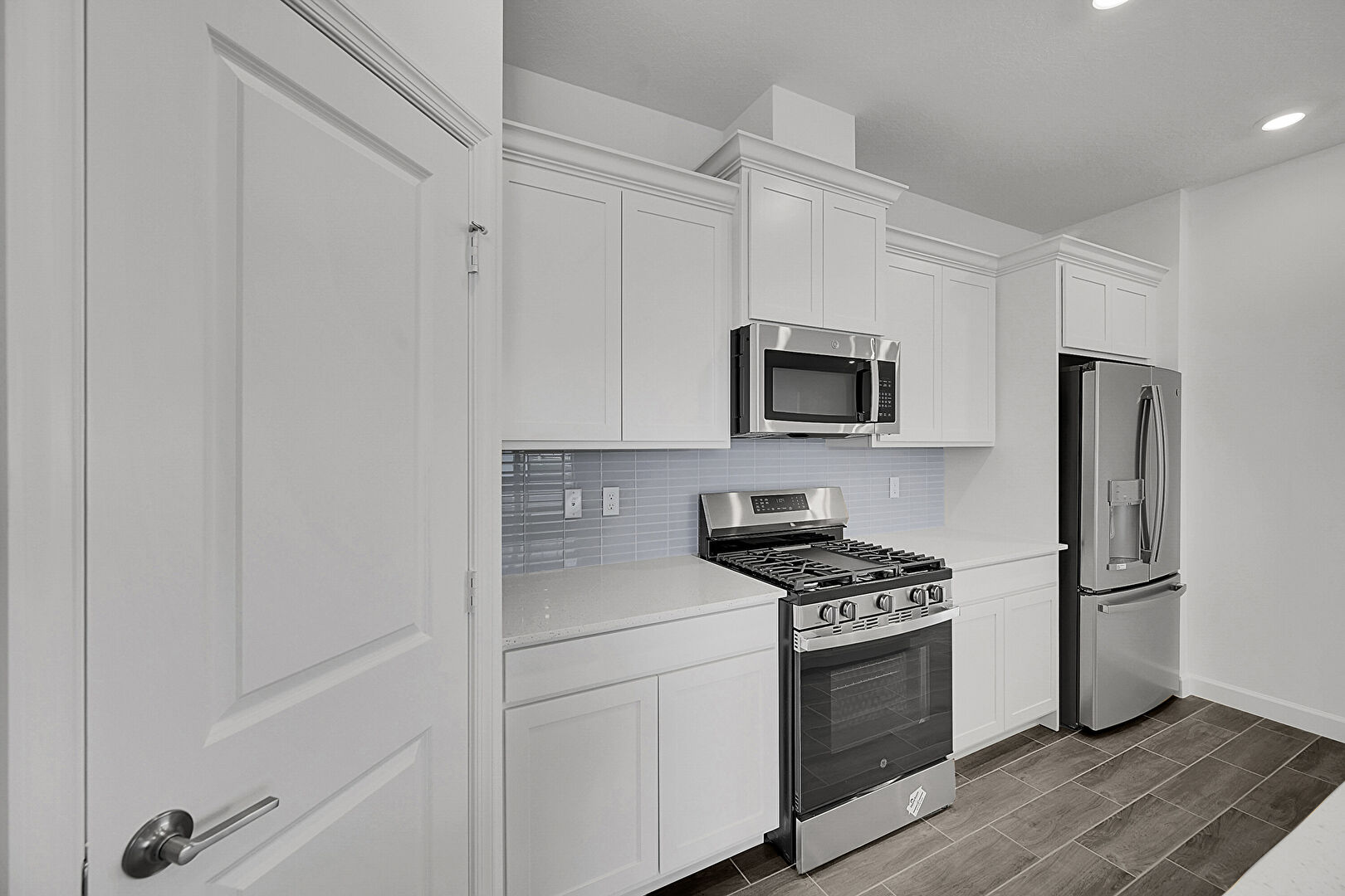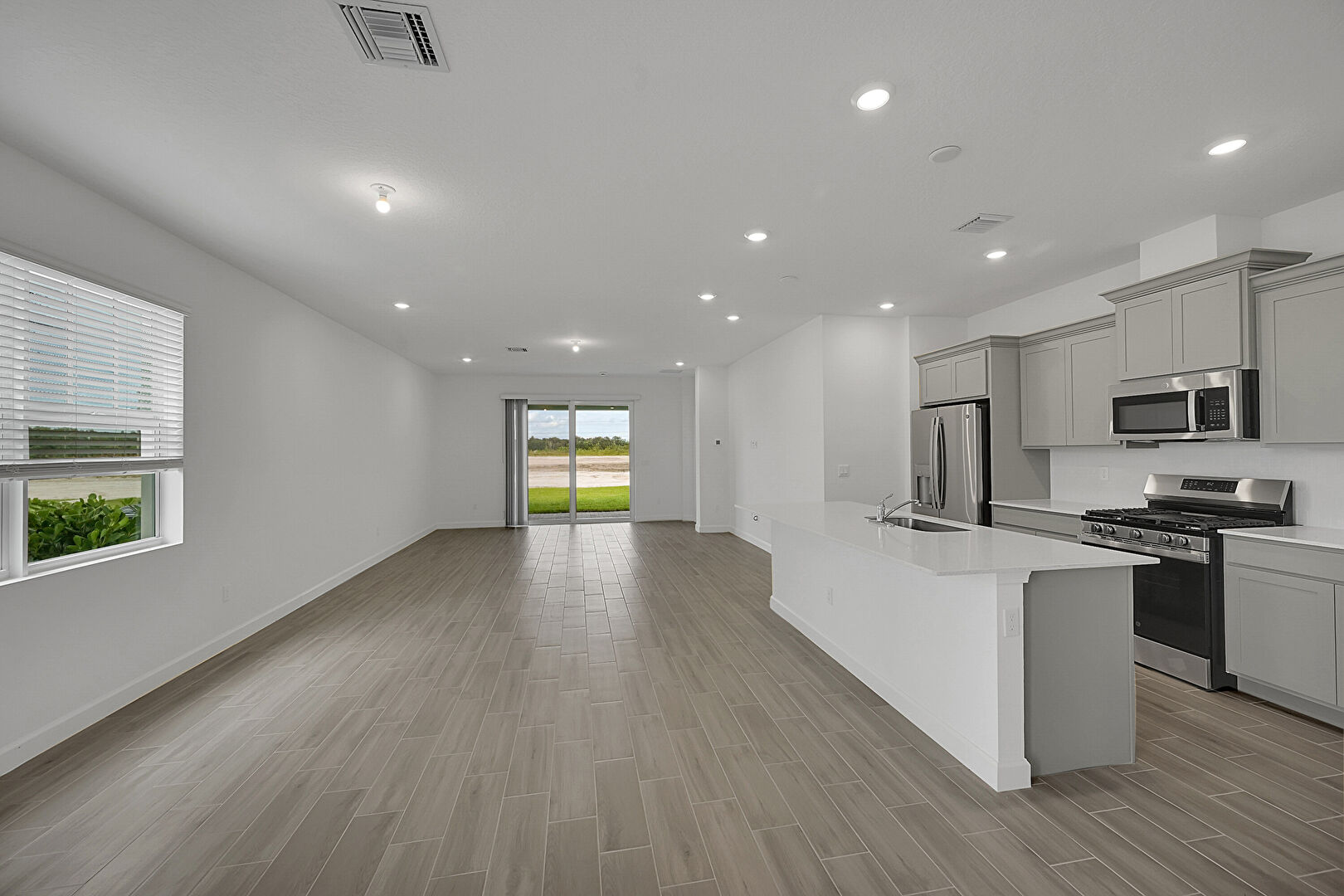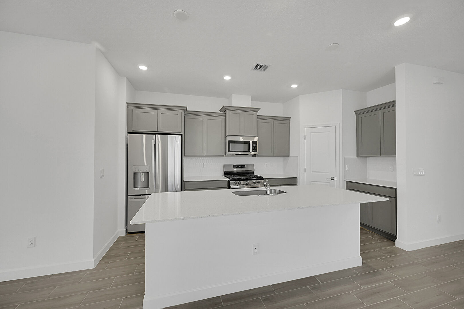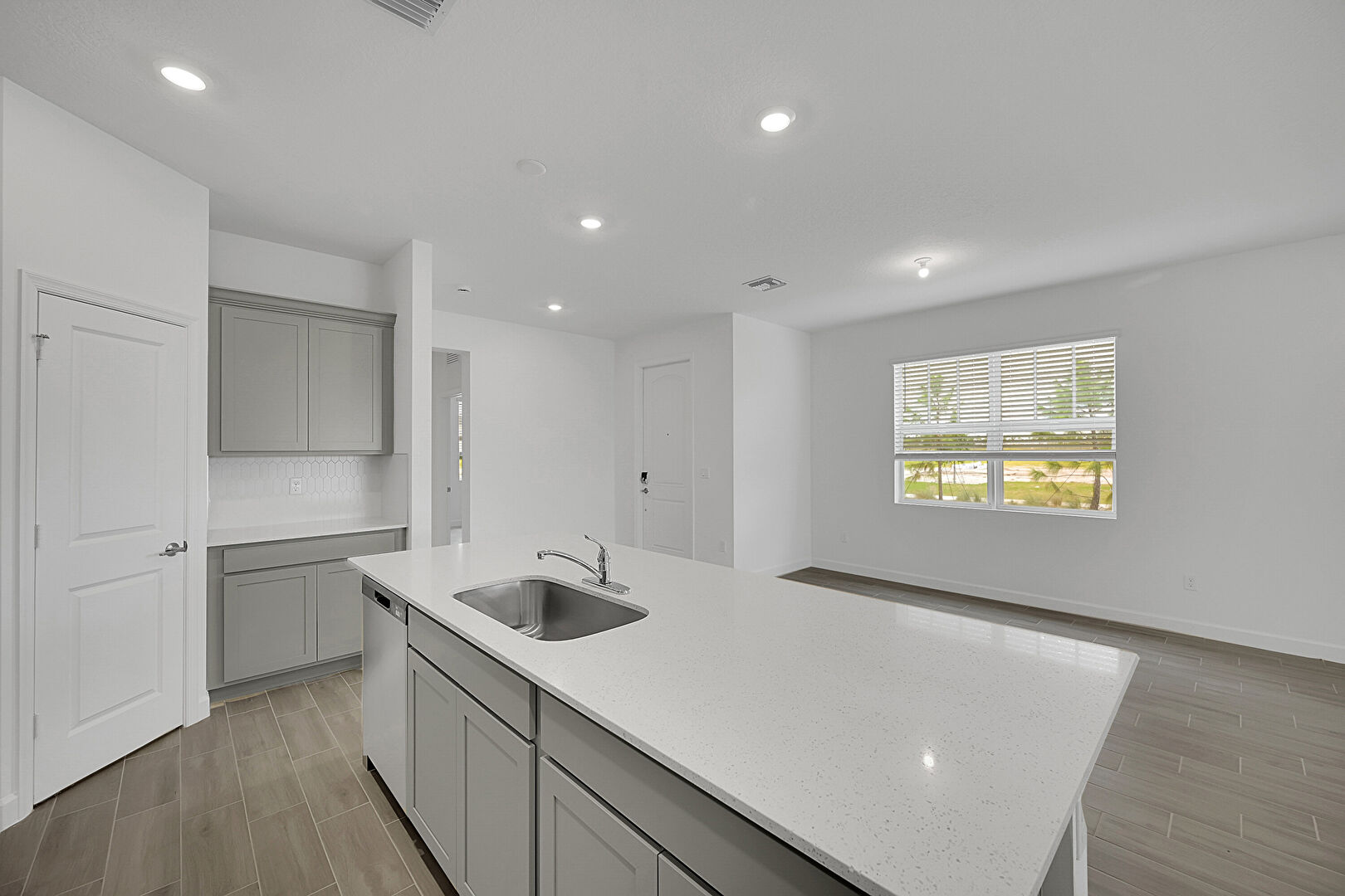 Baseboards Wall,  Crown Molding Cabinets,  Drywall,  Gray Cabinets,  Kitchen Bar,  Kitchen Island,  L Shaped Kitchen,  Natural Light,  One Wall Kitchen,  Opens To Living Area,  Recessed Lighting,  Shaker Cabinets,  Stone Countertops,  Vent,  Wood Finish Floor, Recessed Lighting, Shaker Cabinets, Vent, Wood Finish Floor