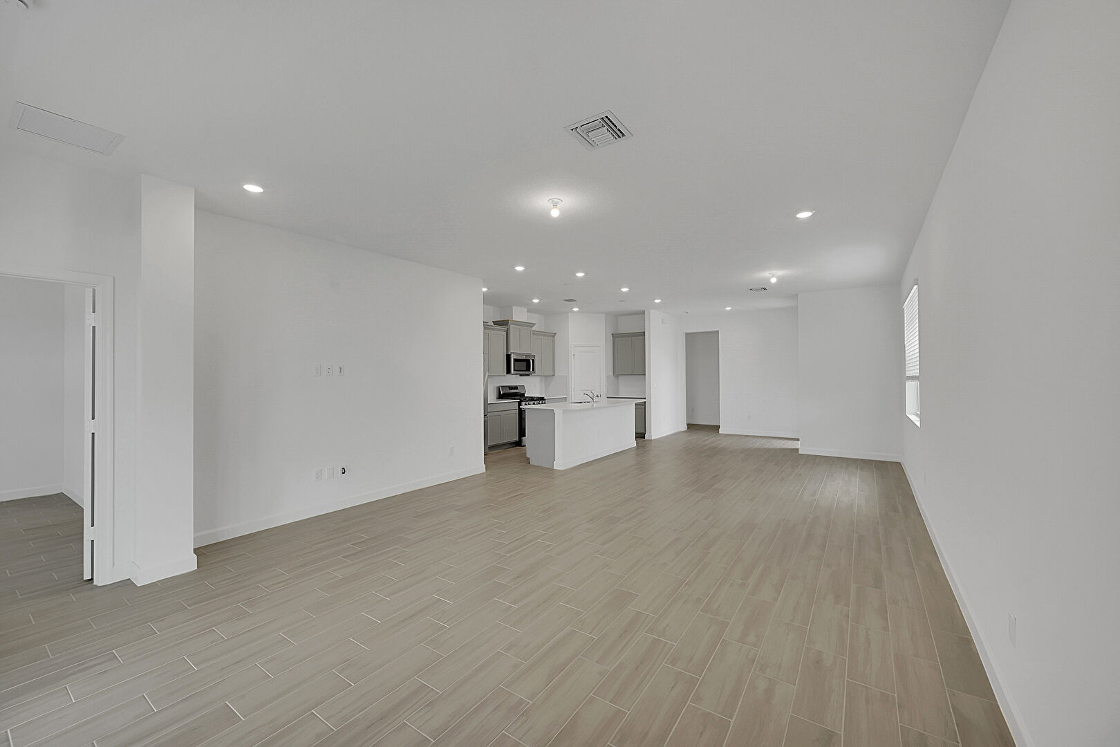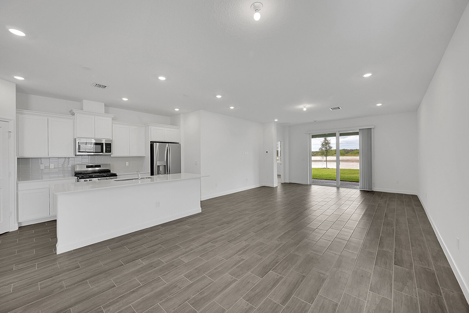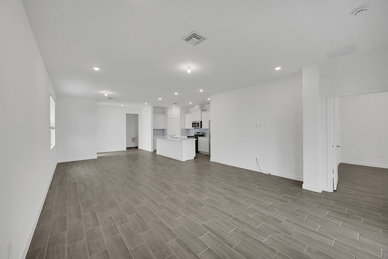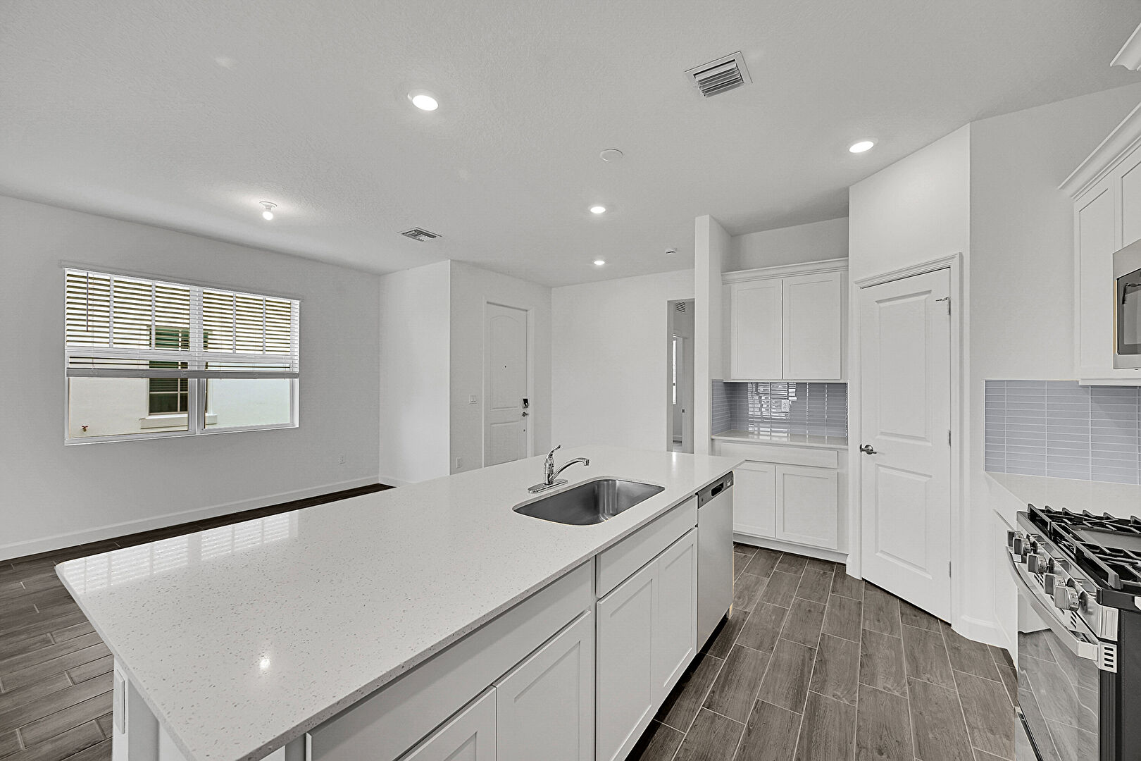 Baseboards Wall,  Crown Molding Cabinets,  Drywall,  Gray Cabinets,  Kitchen Bar,  Kitchen Island,  L Shaped Kitchen,  Natural Light,  One Wall Kitchen,  Opens To Living Area,  Recessed Lighting,  Shaker Cabinets,  Stone Countertops,  Vent,  Wood Finish Floor, Recessed Lighting, Shaker Cabinets, Vent, Wood Finish Floor