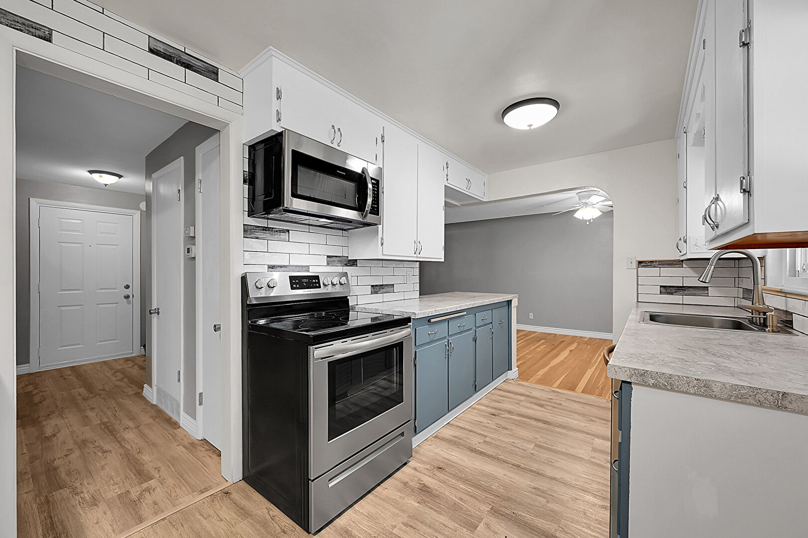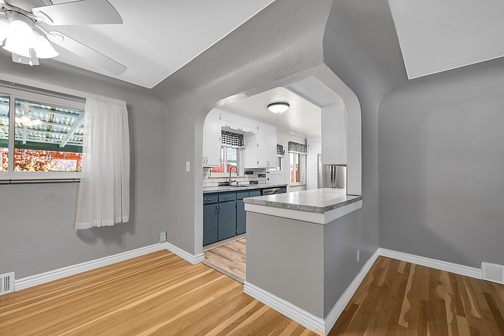 Arched Walkways,  Baseboards Wall,  Blue Cabinets,  Ceiling Fan,  Drywall,  Galley Kitchen,  Kitchen Bar,  Kitchen Peninsula,  Natural Light,  Vent,  Visible Hinge Cabinets,  Wood Finish Floor, Gray Cabinets, Visible Hinge Cabinets, Wood Finish Floor