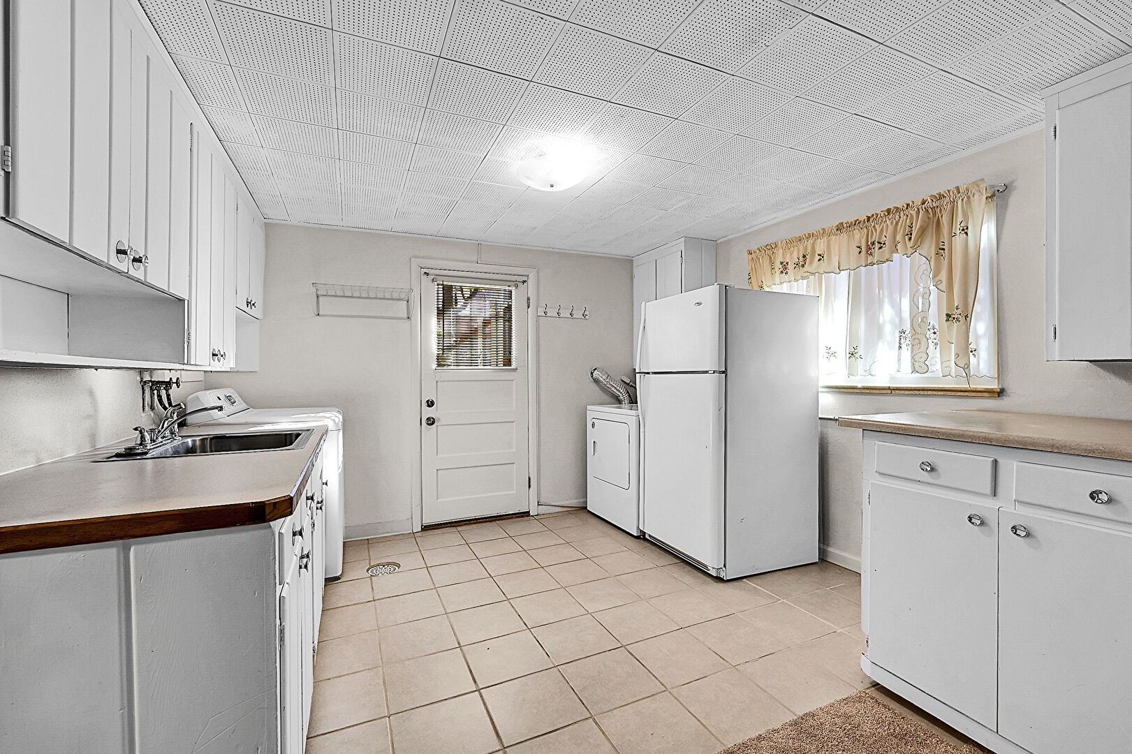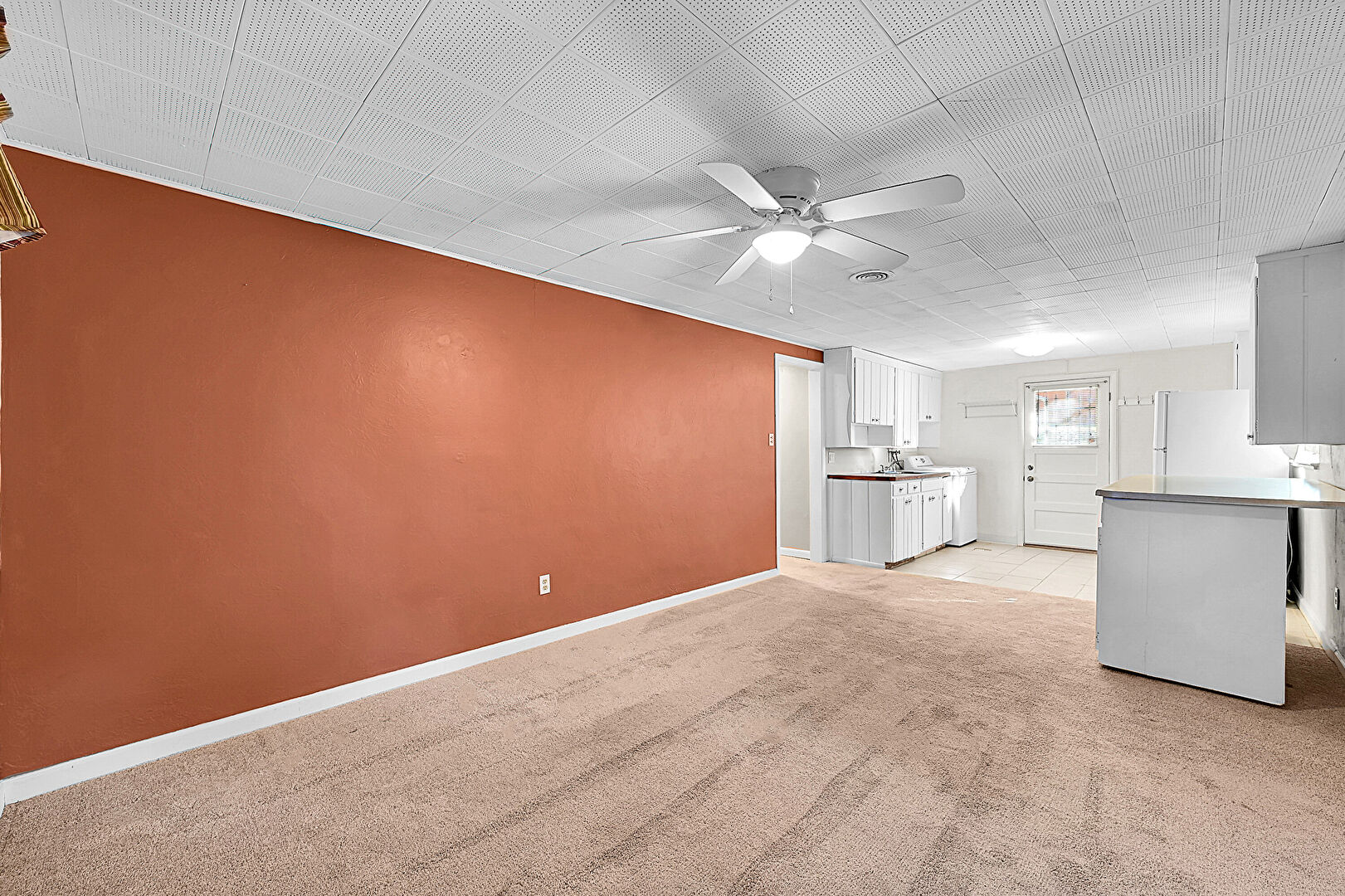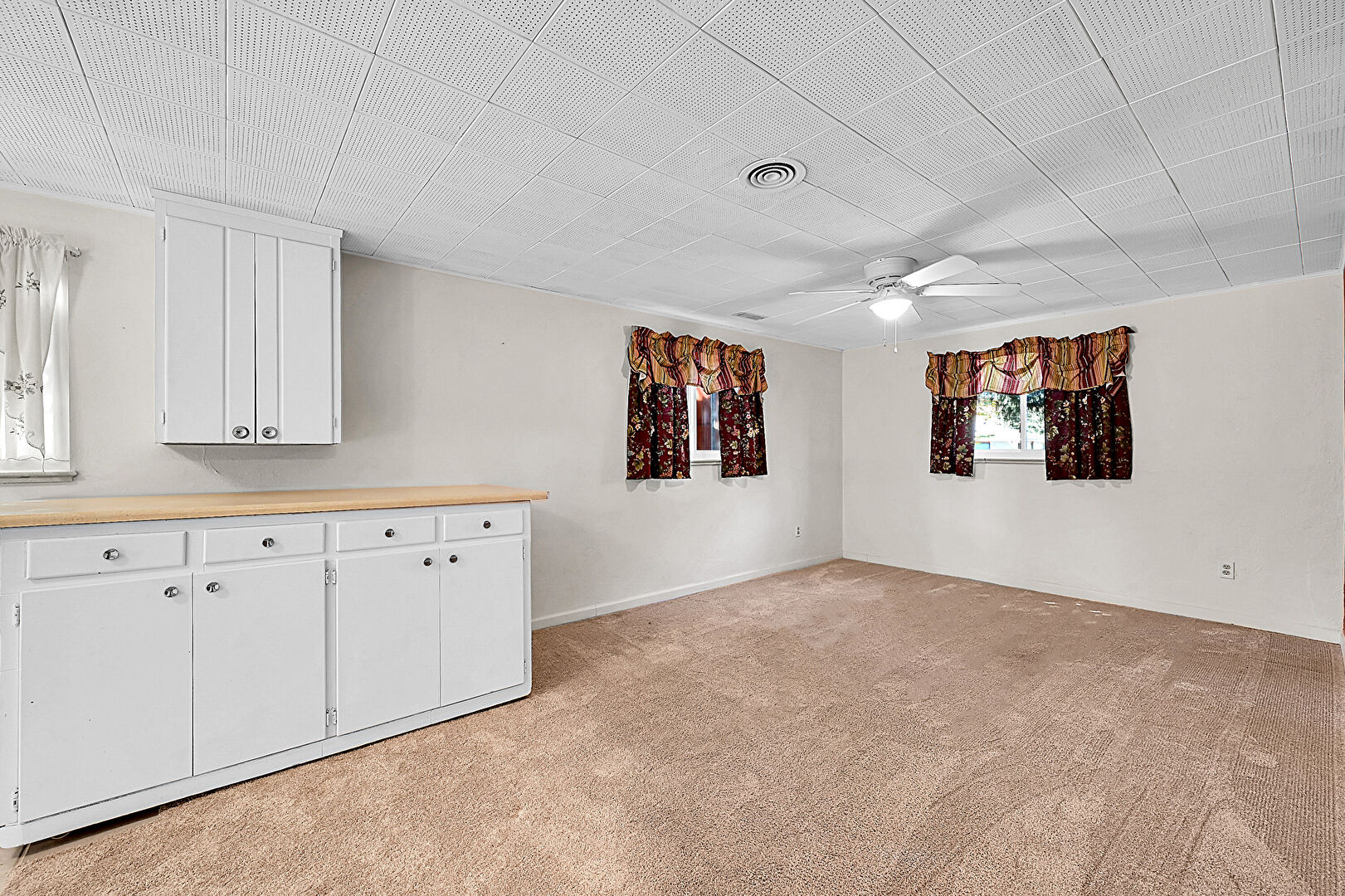 Baseboards Wall,  Carpet,  Ceiling Fan,  Drywall,  Galley Kitchen,  Laundry,  Natural Light,  Open Shelves,  Tile Floor,  Vent,  Visible Hinge Cabinets, Carpet, Drywall, Vent