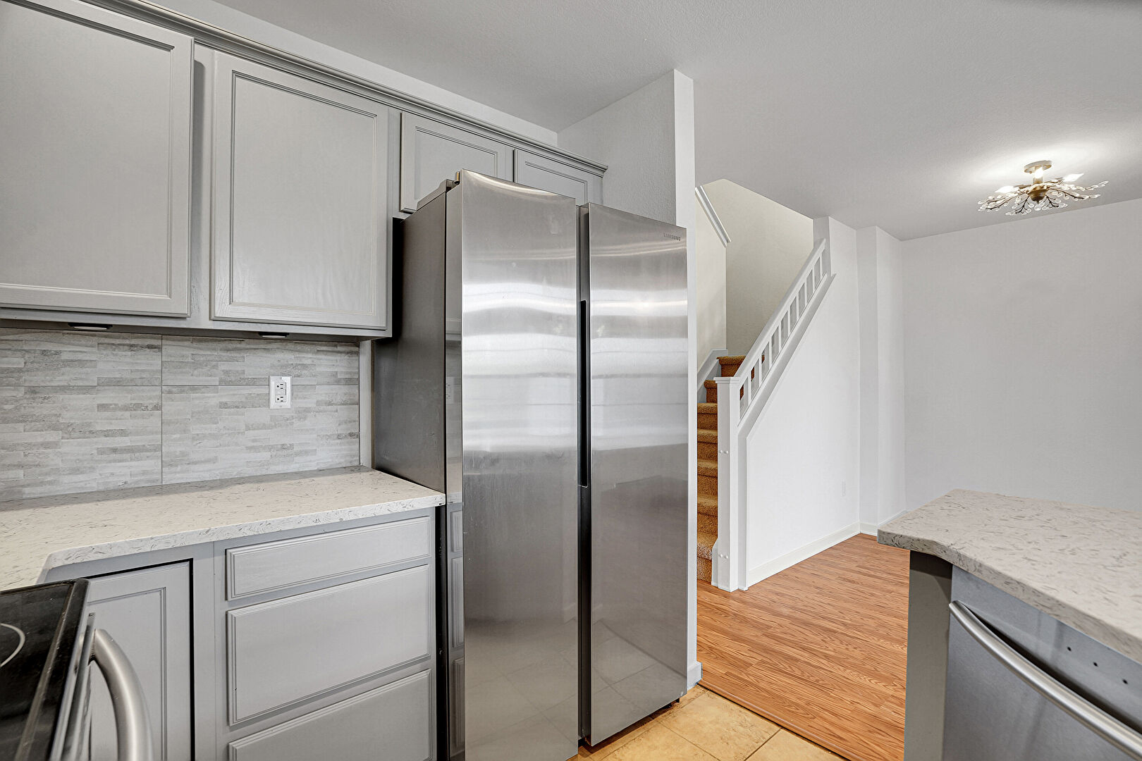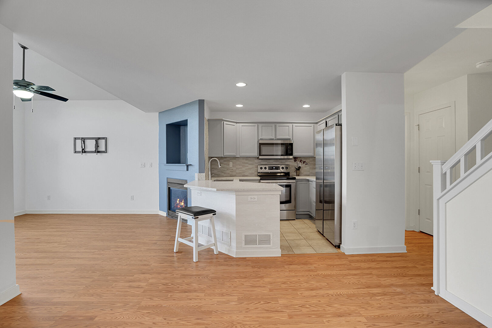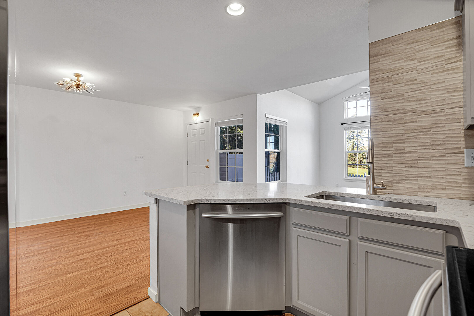Baseboards Wall, Ceiling Fan, Crown Molding Cabinets, Drywall, Fireplace, G Shaped Kitchen, Gray Cabinets, Kitchen Bar, Kitchen Peninsula, Natural Light, Notable Chandelier, Opens To Living Area, Recessed Lighting, Shaker Cabinets, Smoke Carbon Monoxide Detector, Stairs, Stone Countertops, Tile Floor, U Shaped Kitchen, Vaulted Ceiling, Vent, Wood Finish Floor, Baseboards Wall, Drywall, Kitchen Peninsula, Vent
