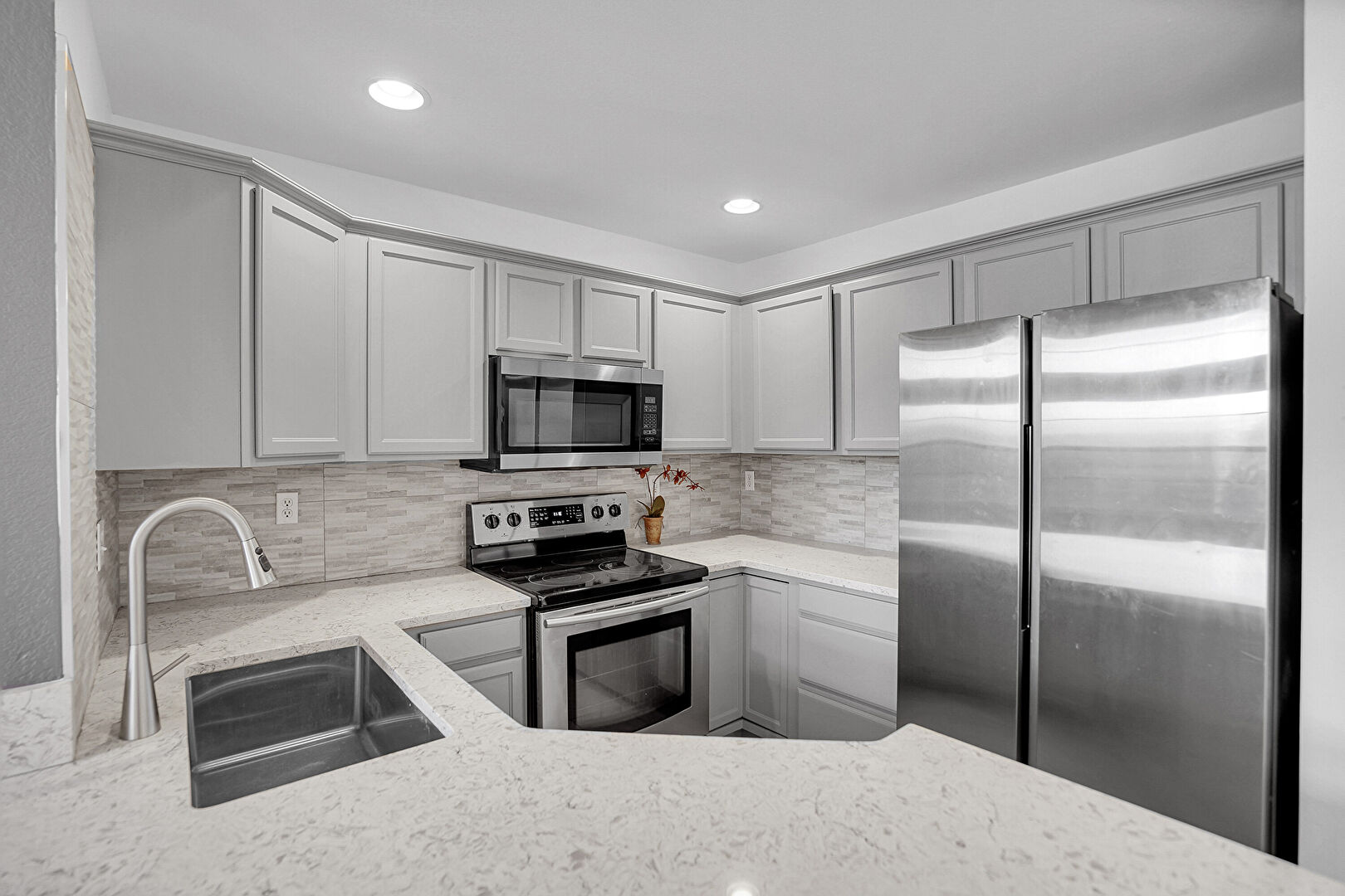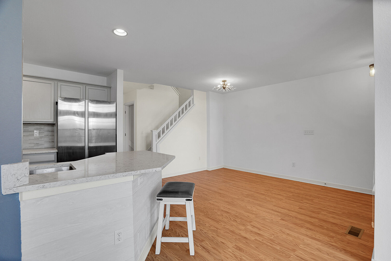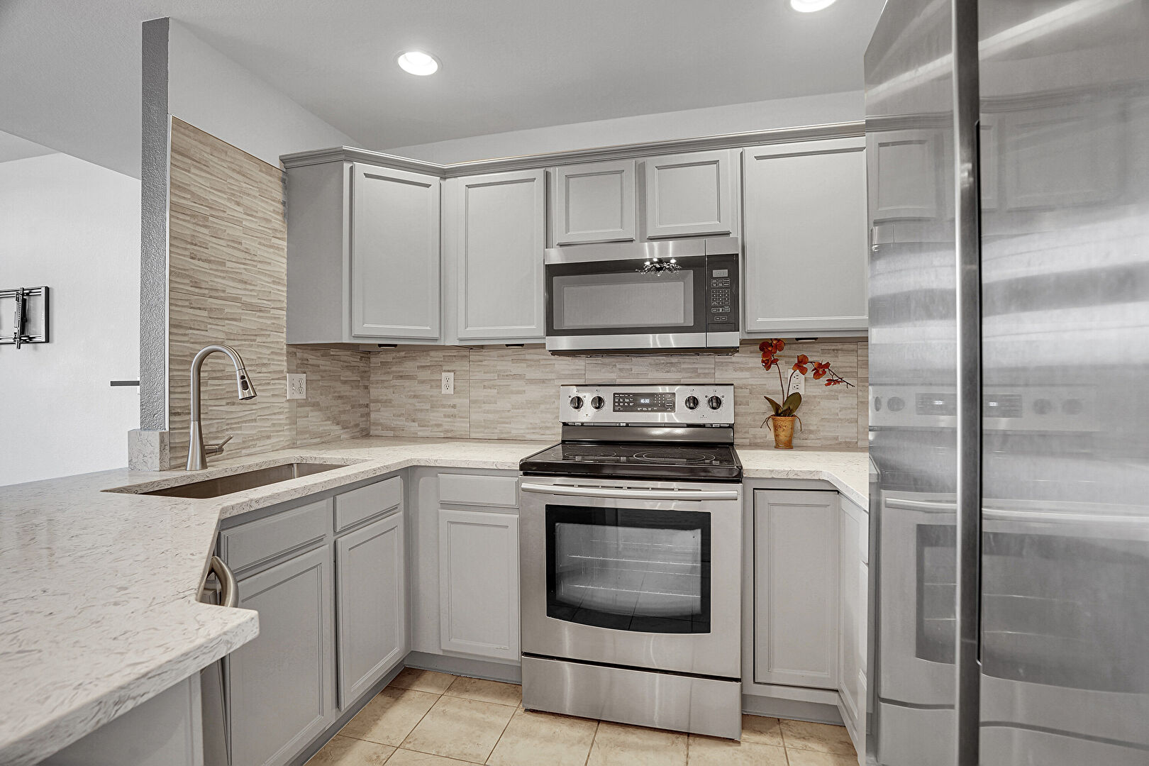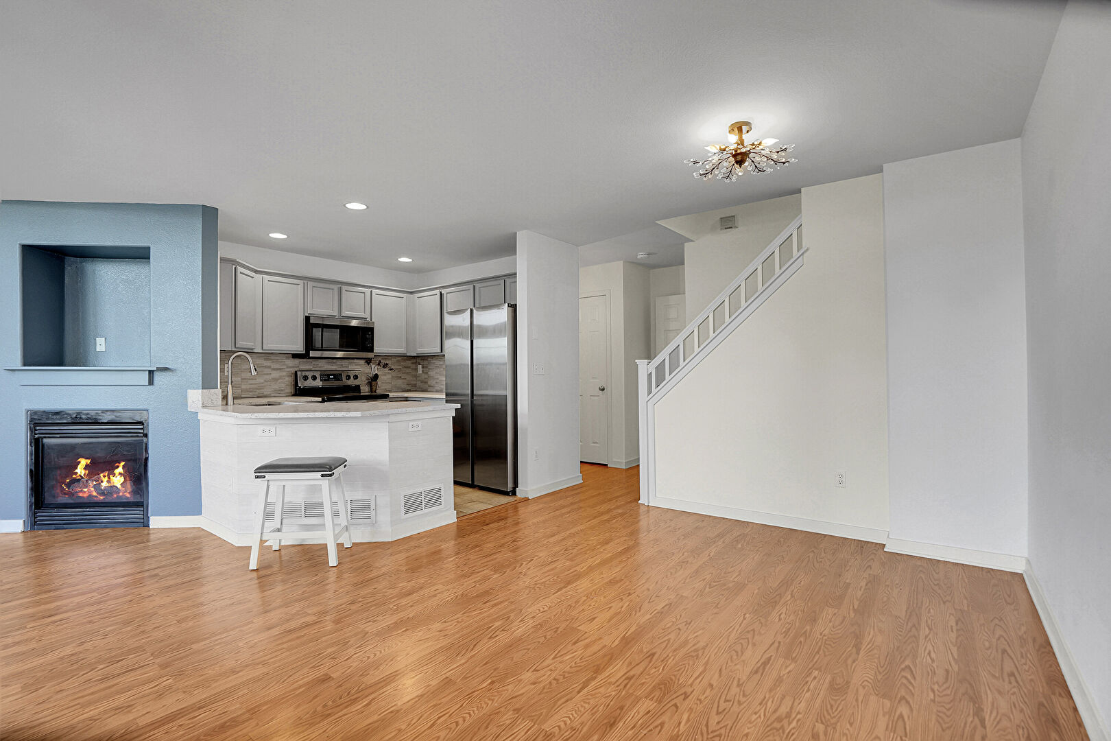 Baseboards Wall, Ceiling Fan, Crown Molding Cabinets, Drywall, Fireplace, G Shaped Kitchen, Gray Cabinets, Kitchen Bar, Kitchen Peninsula, Natural Light, Notable Chandelier, Opens To Living Area, Recessed Lighting, Shaker Cabinets, Smoke Carbon Monoxide Detector, Stairs, Stone Countertops, Tile Floor, U Shaped Kitchen, Vaulted Ceiling, Vent, Wood Finish Floor, Baseboards Wall, Drywall, Kitchen Peninsula, Vent
