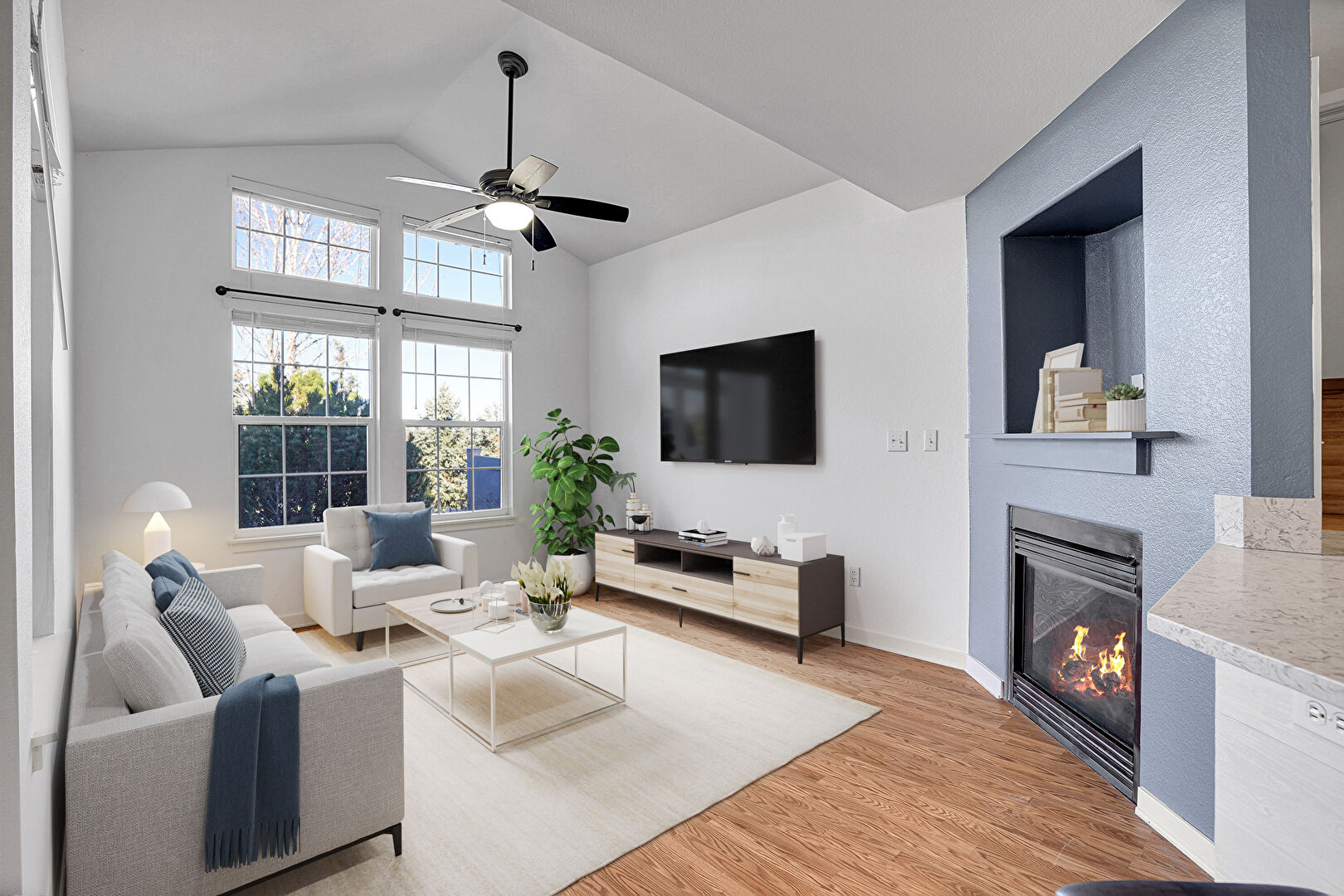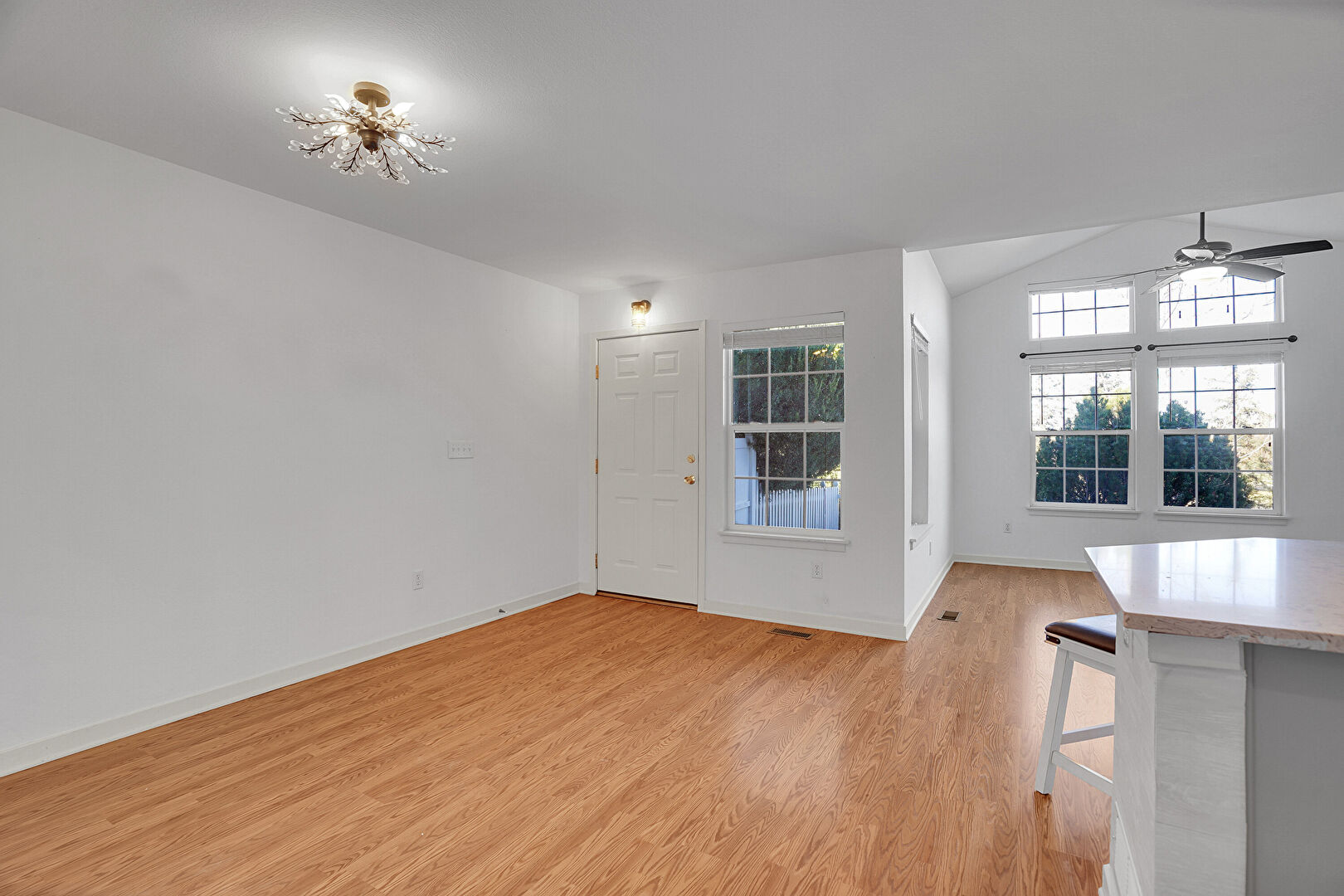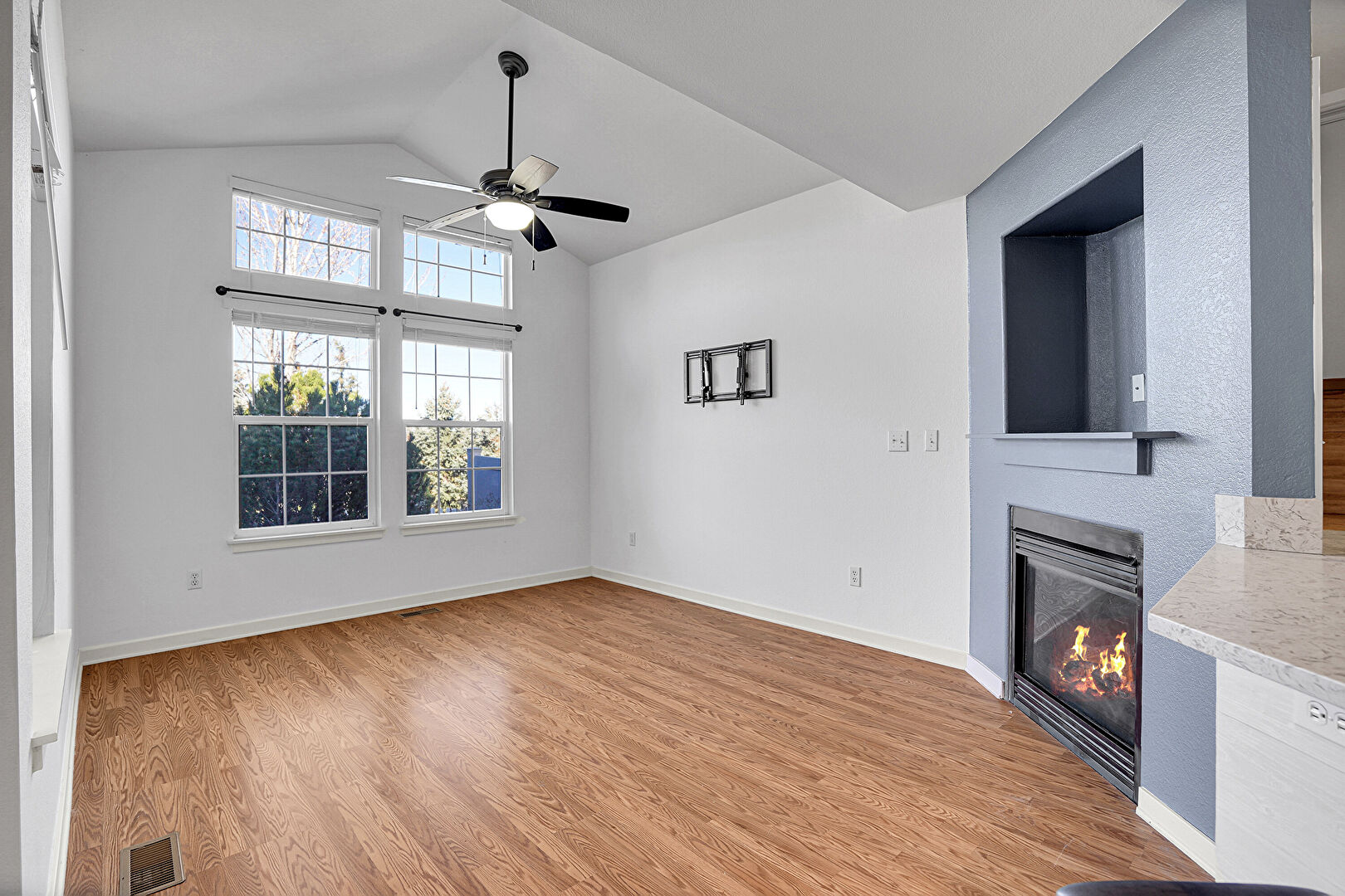 Ceiling Fan, Drywall, Natural Light, Vaulted Ceiling, Vent, Wood Finish Floor, Baseboards Wall
