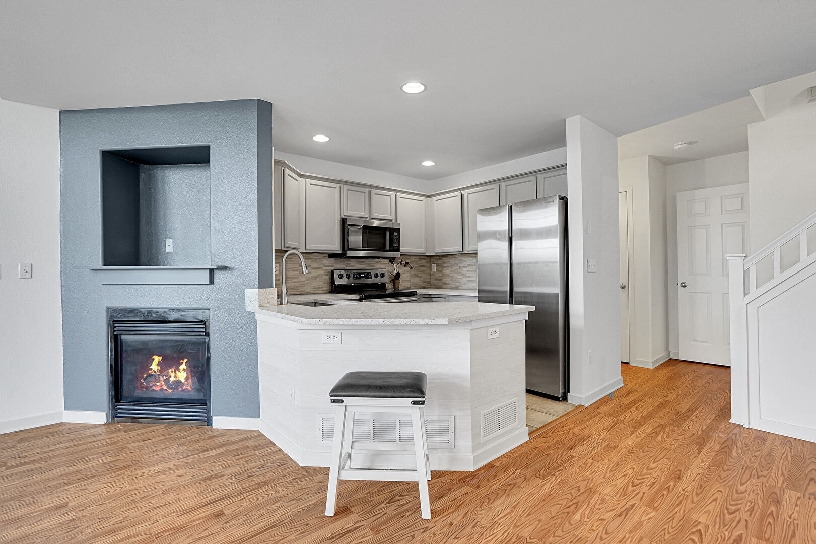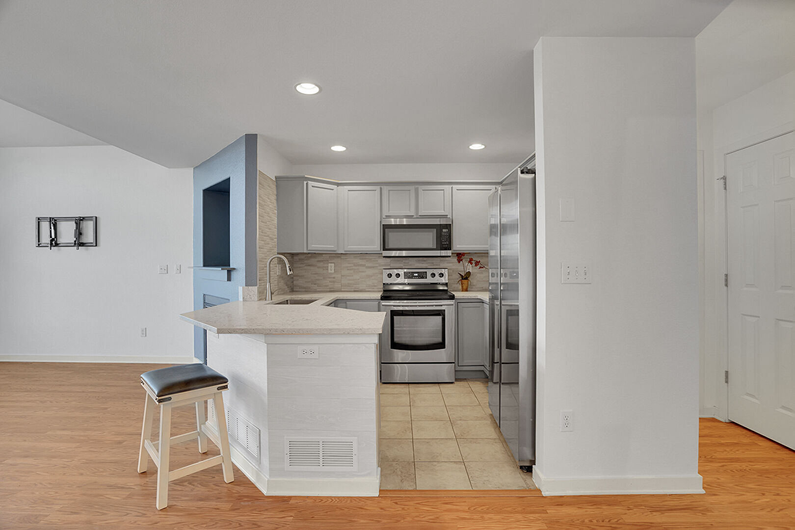 Baseboards Wall, Crown Molding Cabinets, Drywall, Fireplace, G Shaped Kitchen, Gray Cabinets, Kitchen Bar, Kitchen Peninsula, Natural Light, Opens To Living Area, Recessed Lighting, Shaker Cabinets, Stone Countertops, Tile Floor, U Shaped Kitchen, Vaulted Ceiling, Vent, Wood Finish Floor, Baseboards Wall, Drywall, Gray Cabinets, Recessed Lighting, Shaker Cabinets, Vent