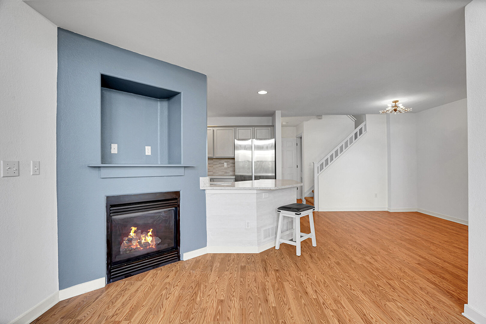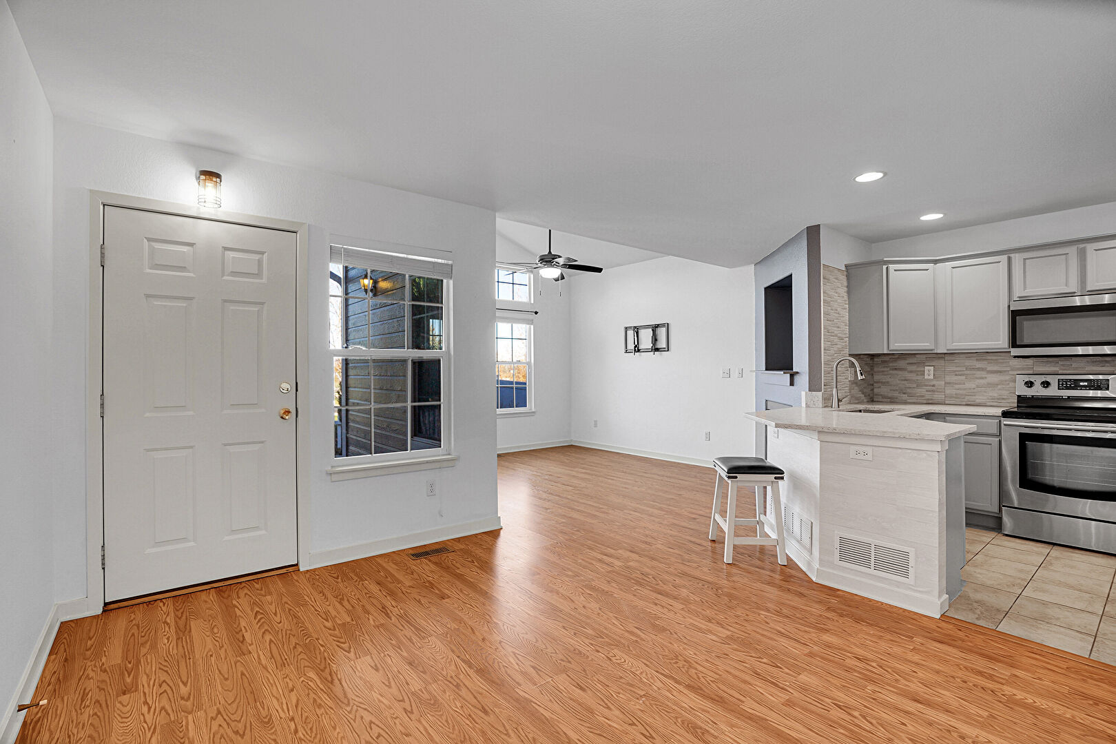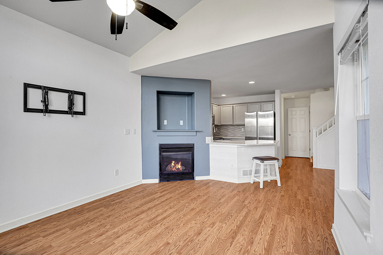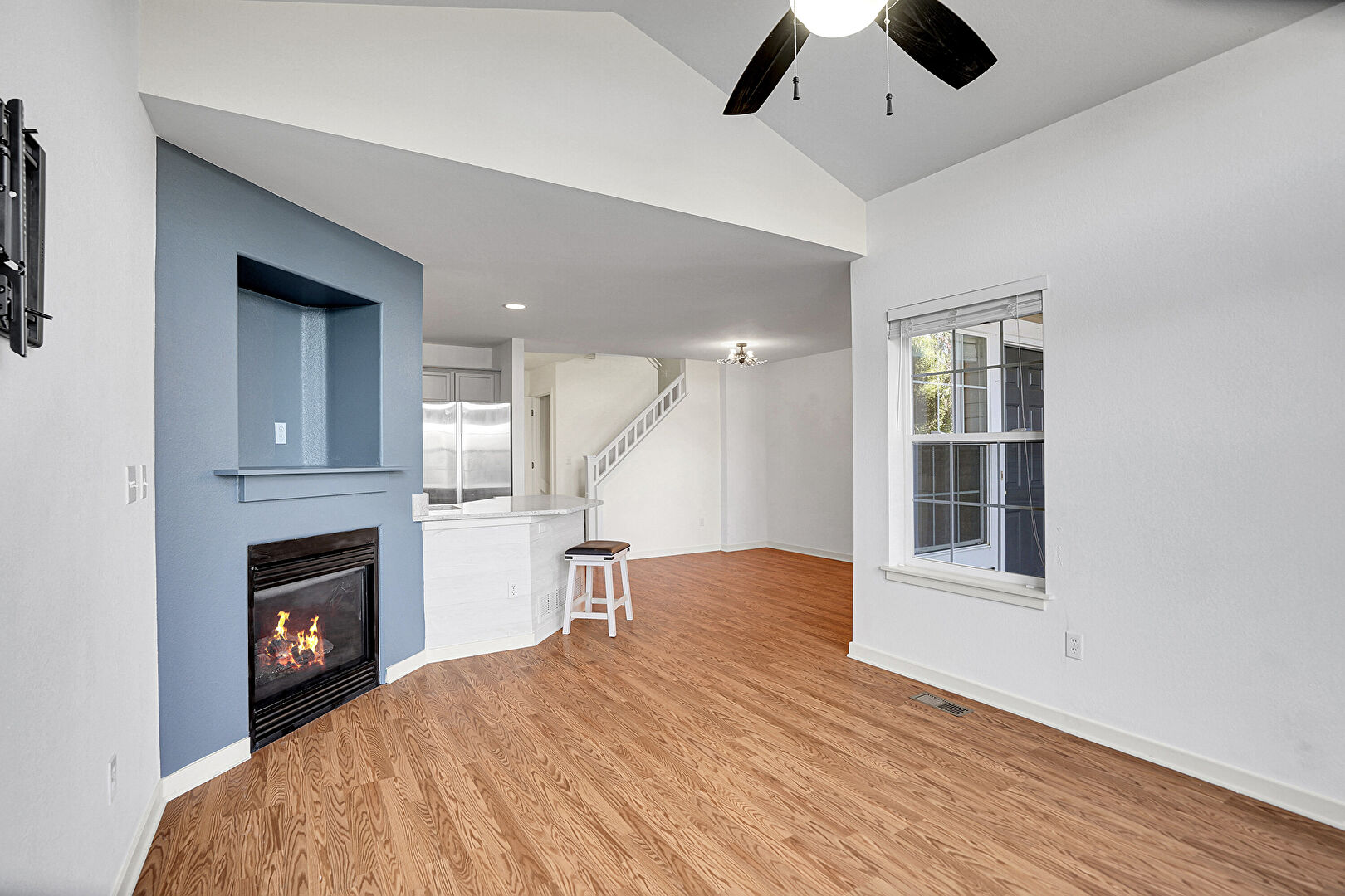 Baseboards Wall, Cathedral Ceiling, Ceiling Fan, Drywall, Fireplace, G Shaped Kitchen, High Ceiling, Natural Light, Recessed Lighting, Stairs, Vaulted Ceiling, Vent, Wood Finish Floor, Baseboards Wall, Ceiling Fan, Drywall, High Ceiling, Wood Finish Floor